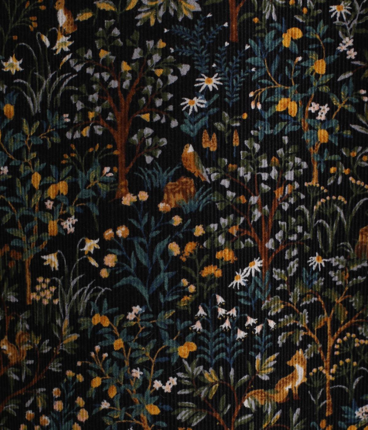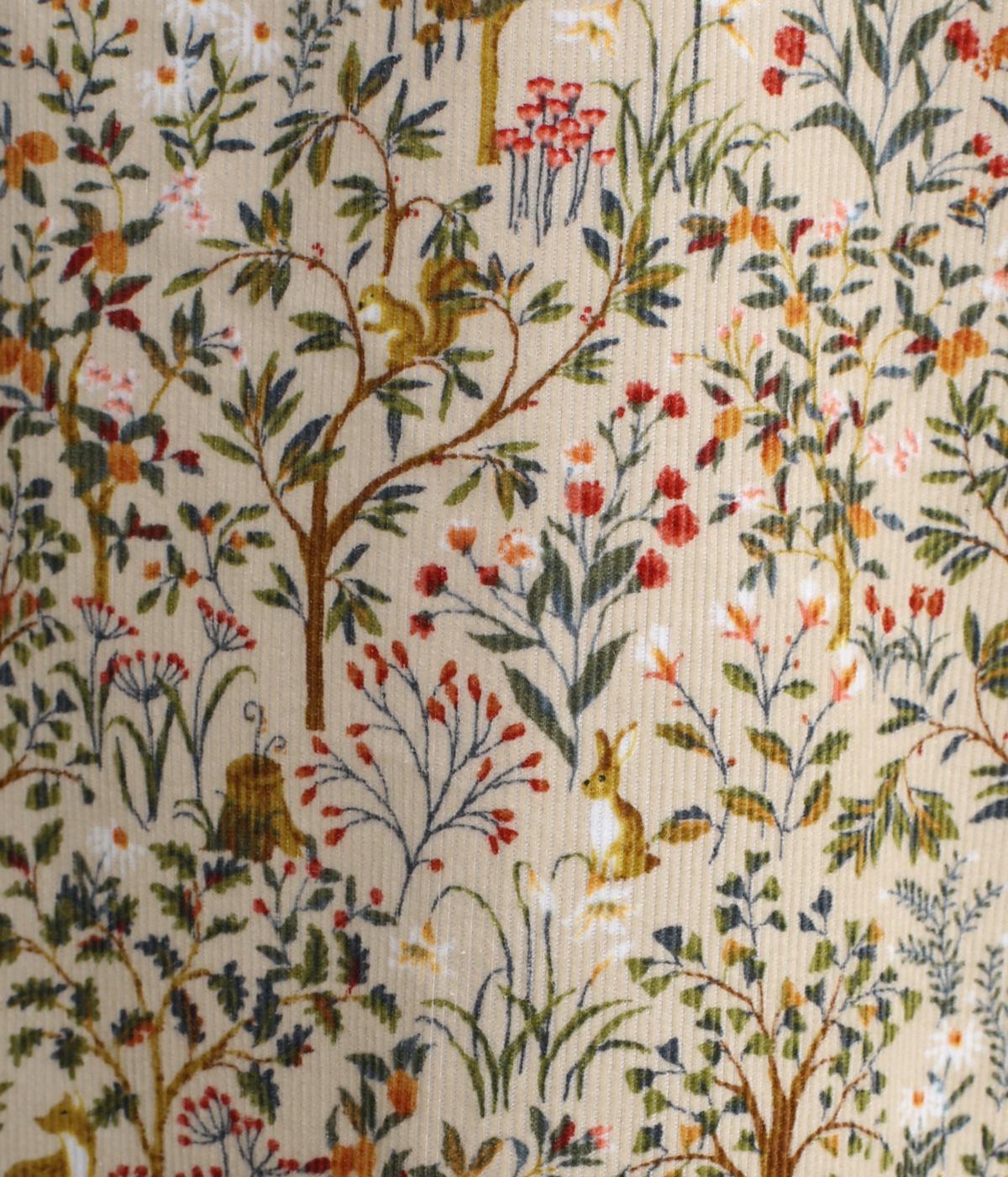 ぬくもりある起毛感とやわらかな風合いが特徴のコットンコーデュロイに、ノスタルジックなforest柄をあしらいました。かさばりがちな秋冬にうれしい、軽い生地感です。