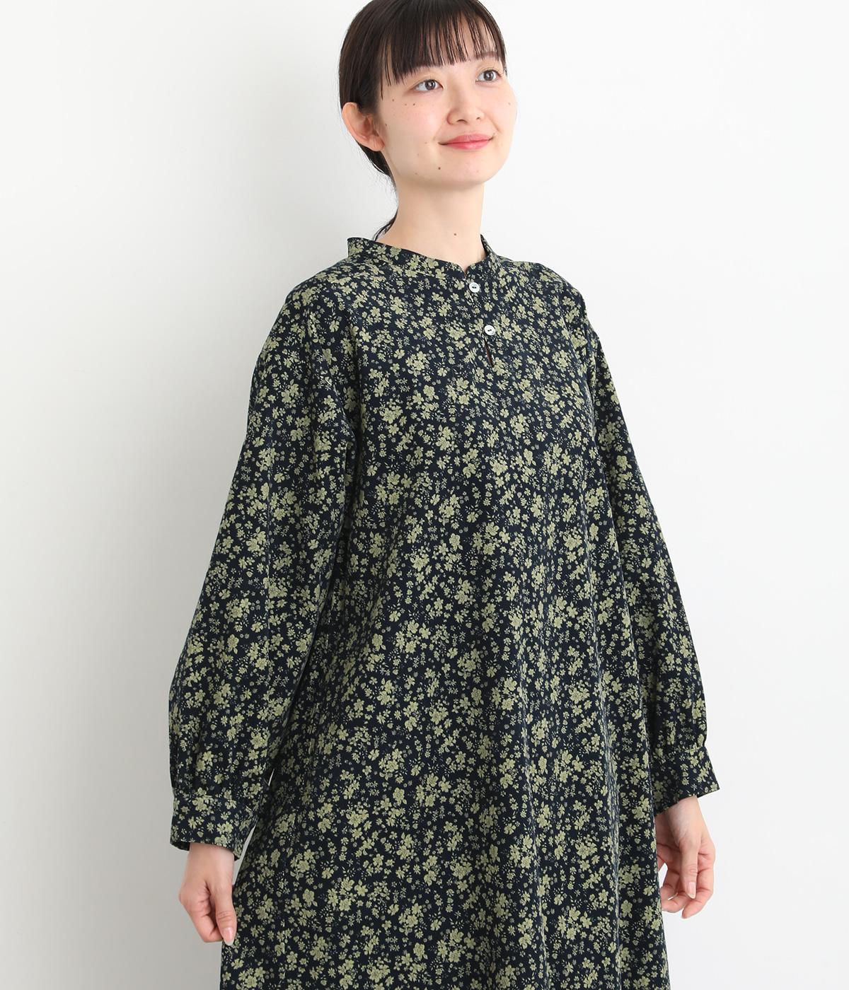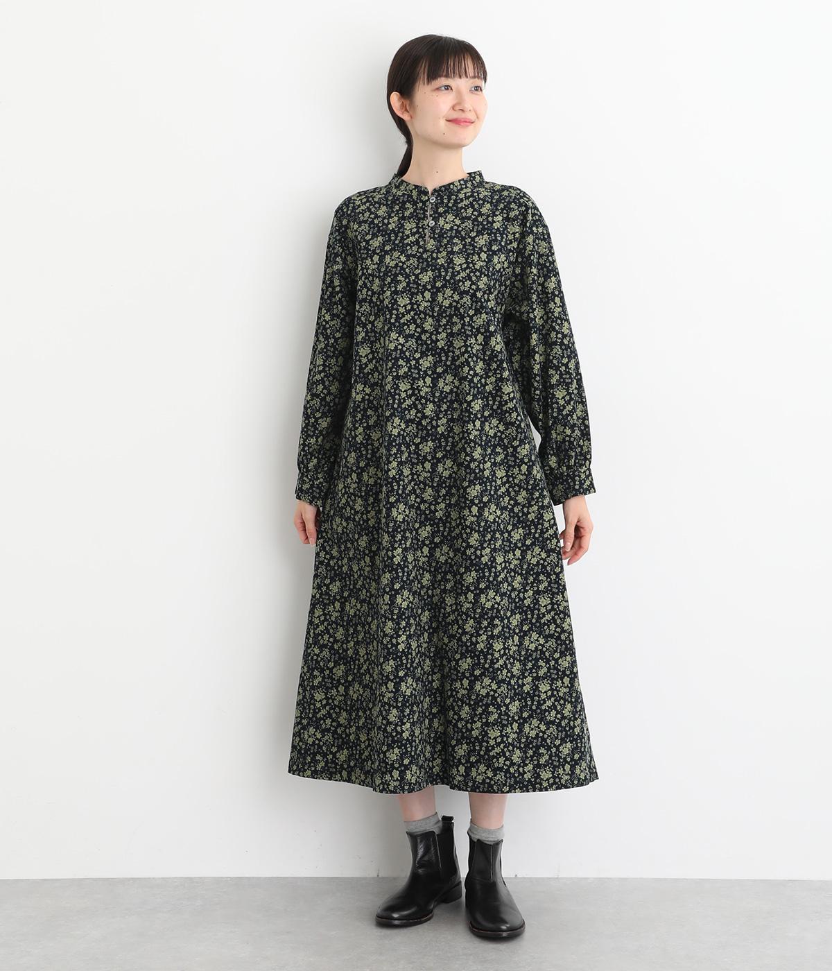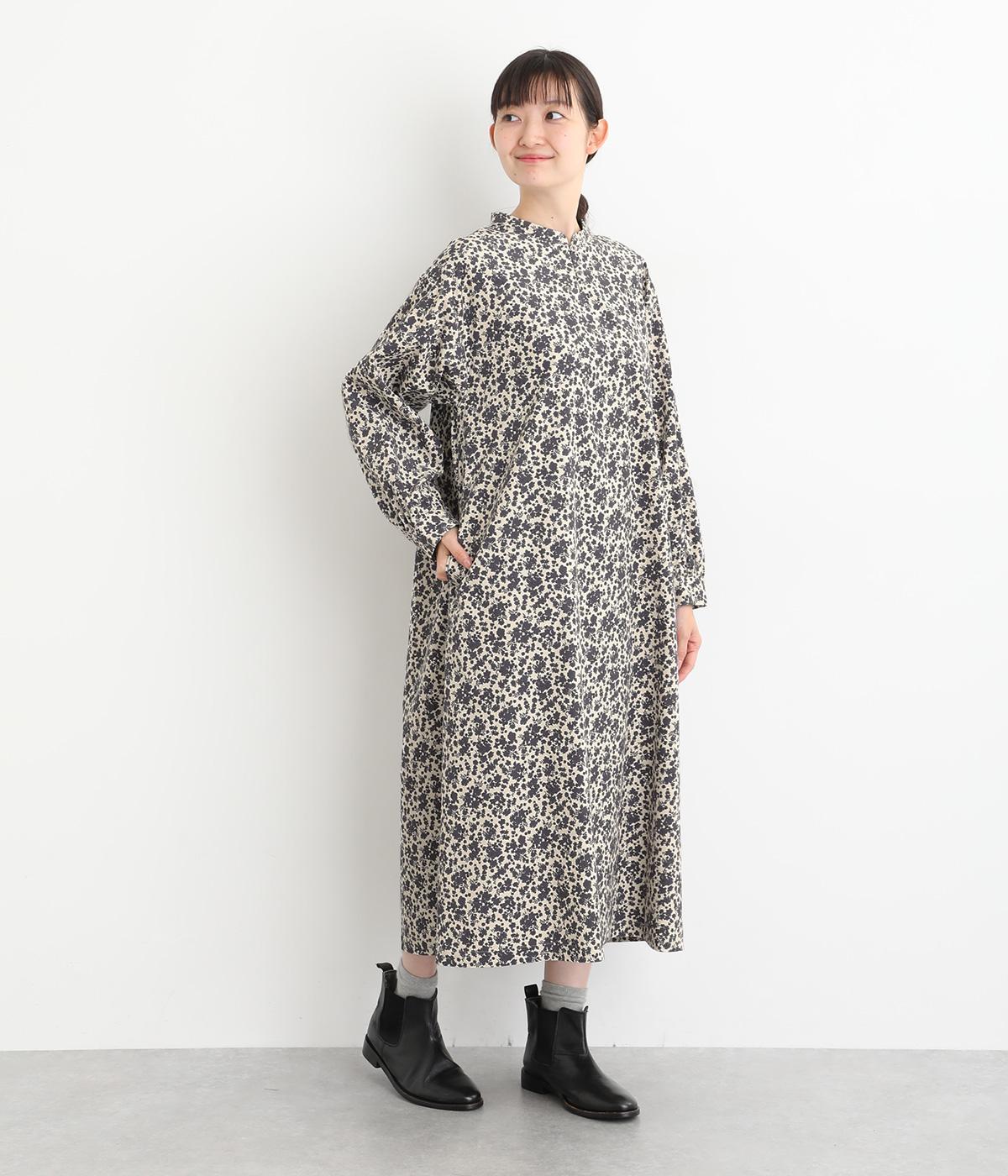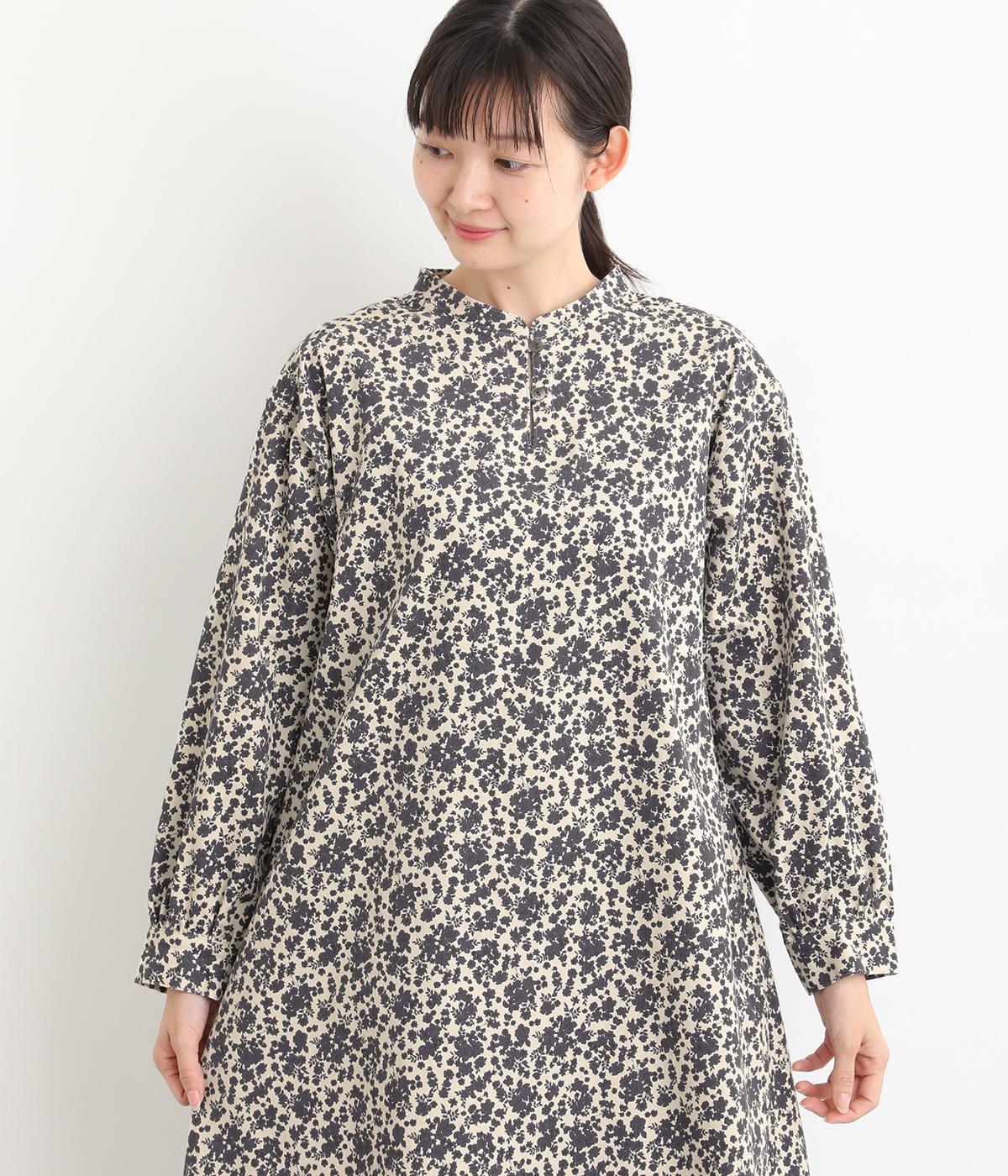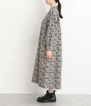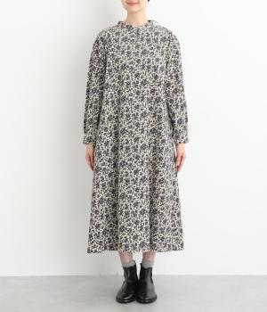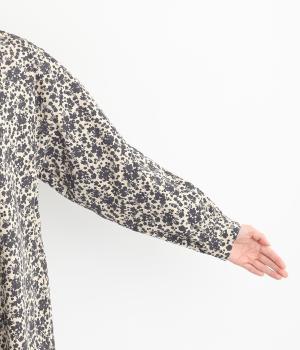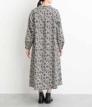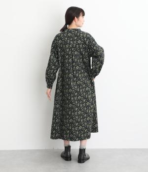 シックな小花柄とフレアシルエットが女性らしいワンピース。袖口にギャザーを入れて、ふっくらとさせた袖のフォルムも素敵です。クラシカルな襟元にはスリットを入れ、ループボタンをつけてアクセントに。一枚で華やかな着こなしが完成します。