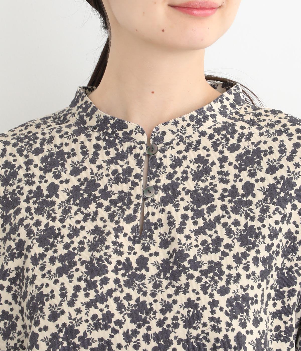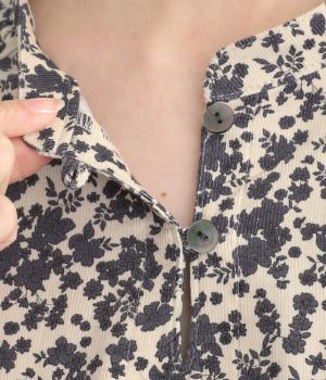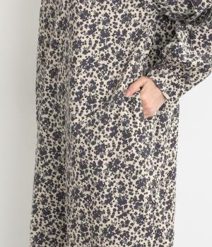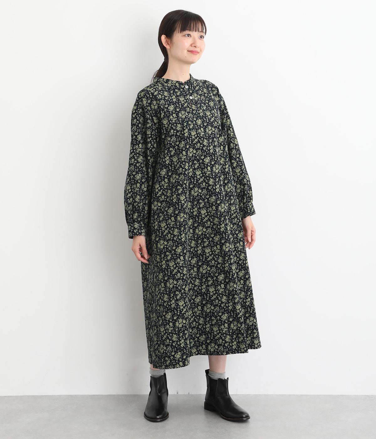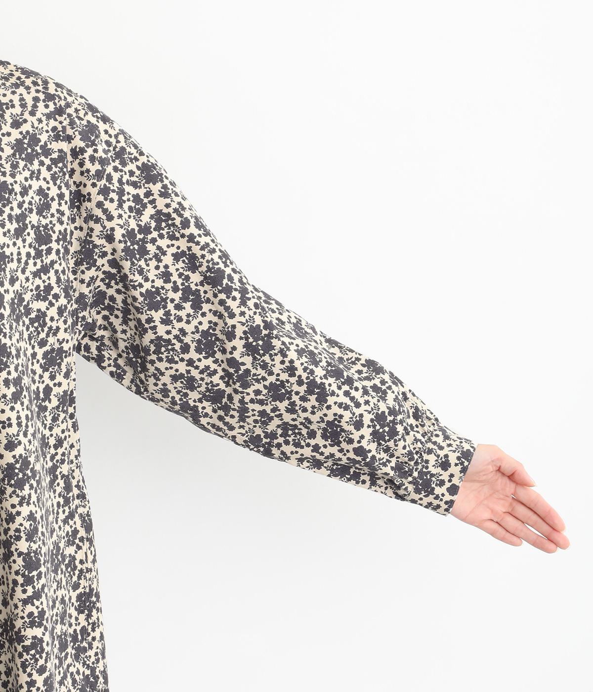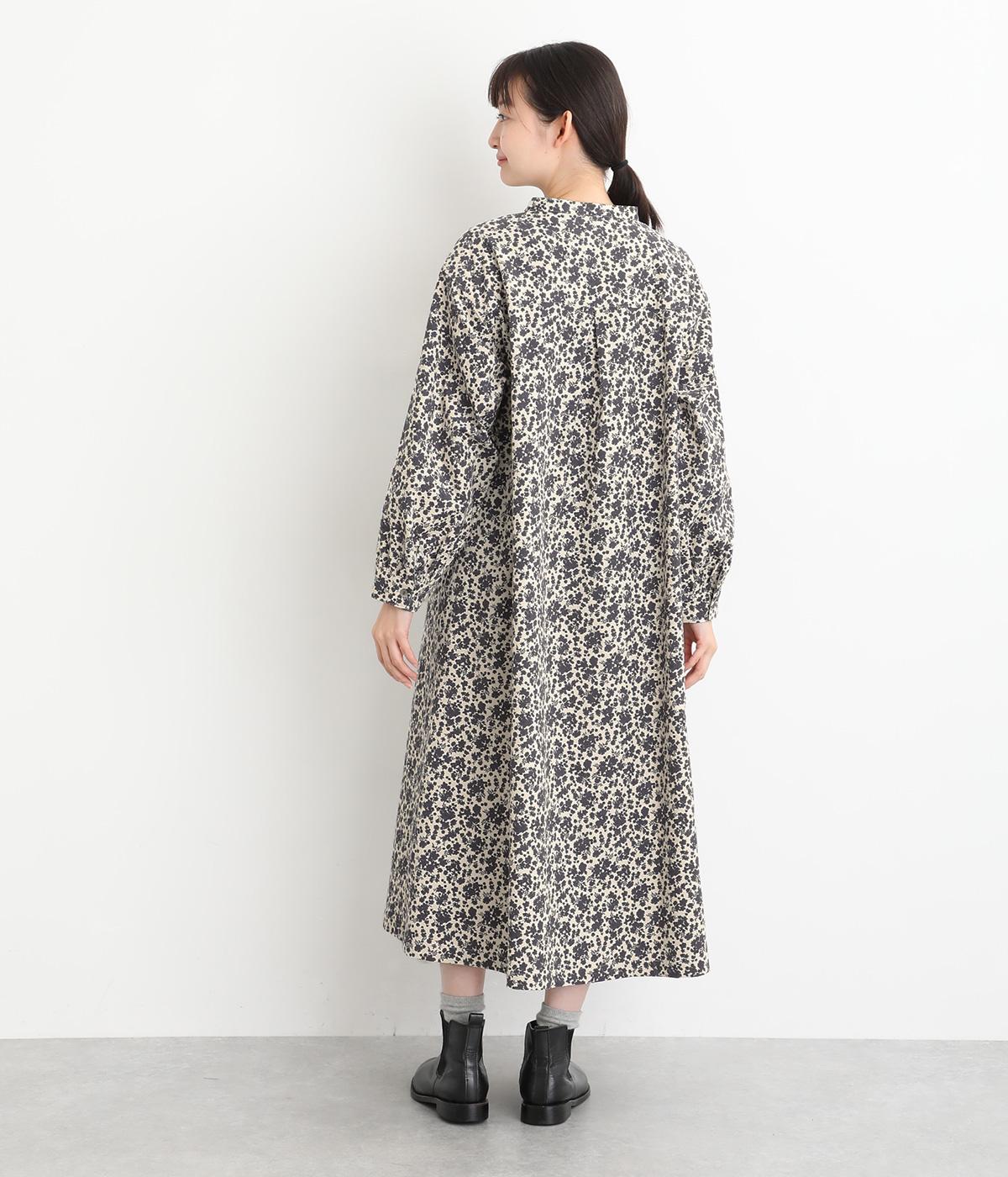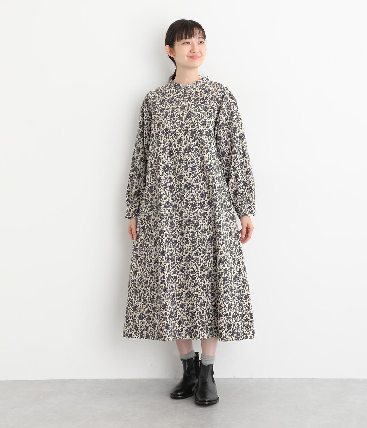 シックな小花柄とフレアシルエットが女性らしいワンピース。袖口にギャザーを入れて、ふっくらとさせた袖のフォルムも素敵です。クラシカルな襟元にはスリットを入れ、ループボタンをつけてアクセントに。一枚で華やかな着こなしが完成します。