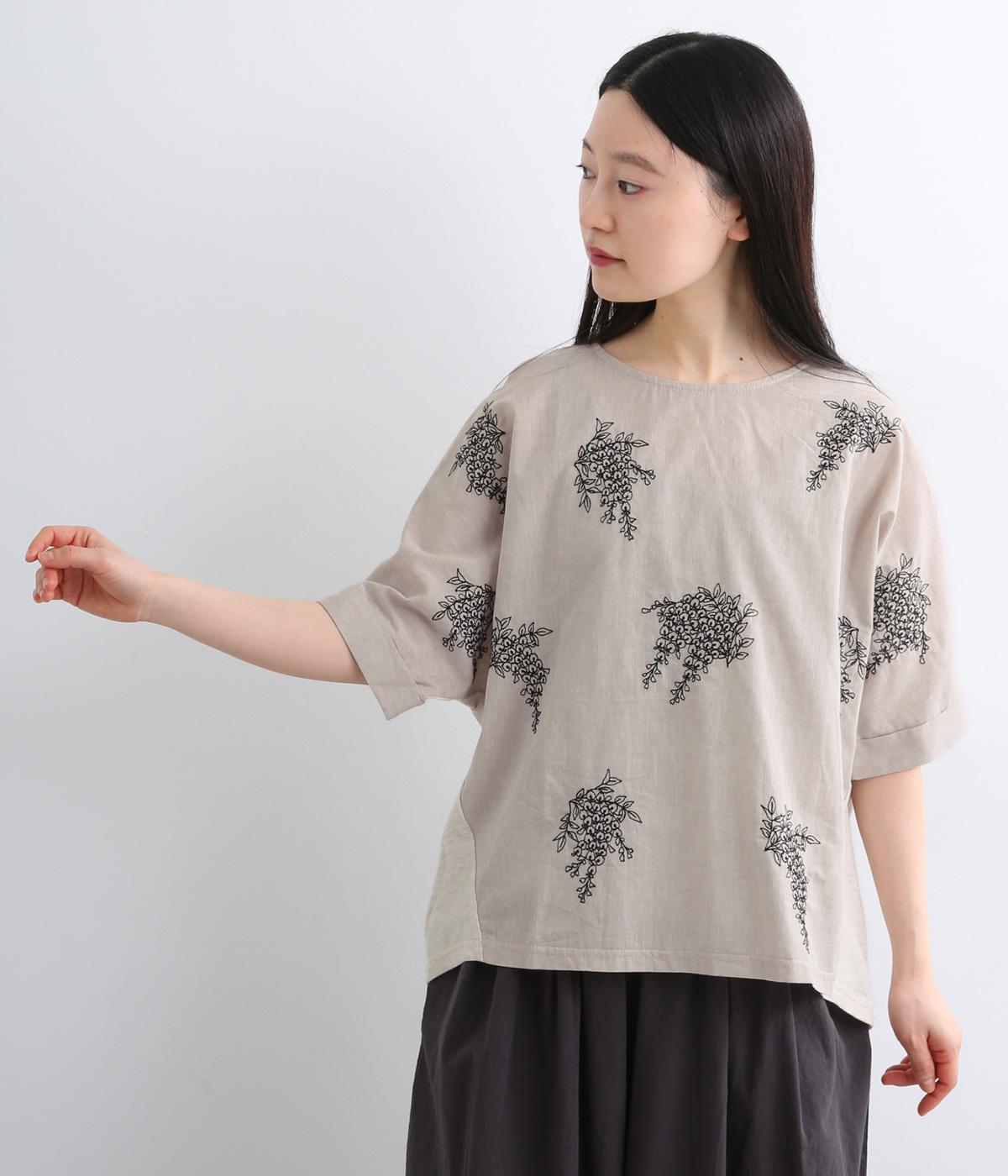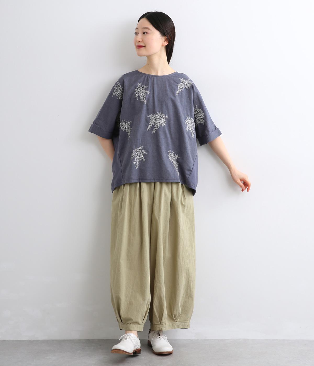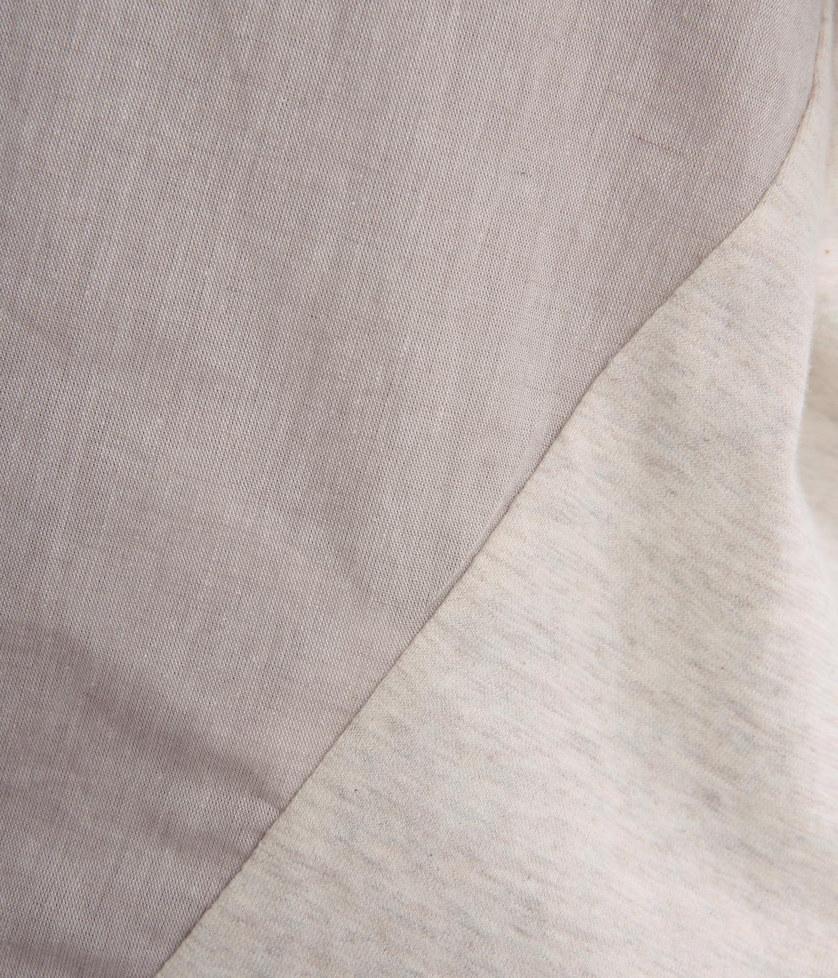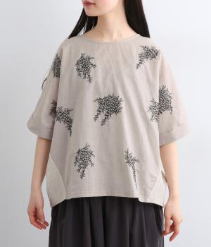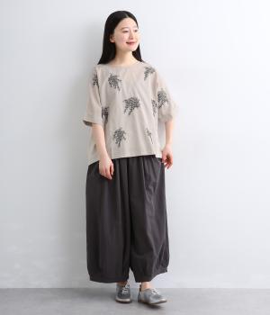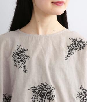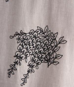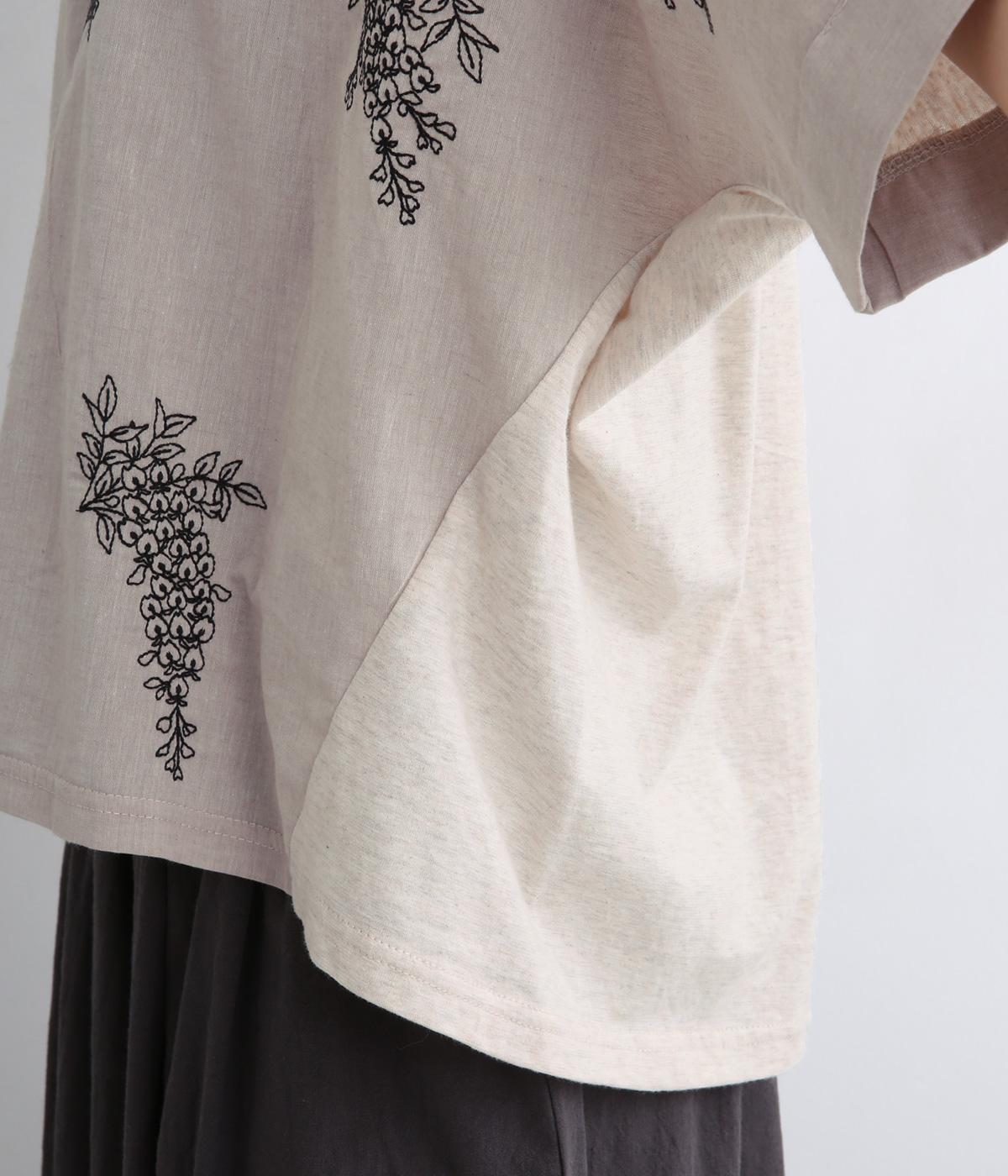 さらりとしたコットンリネンの布帛とソフトな肌ざわりのコットンカットソーを切り替えました。花柄は贅沢に刺しゅうで表現しています。通気性のよい快適な着心地の生地です。