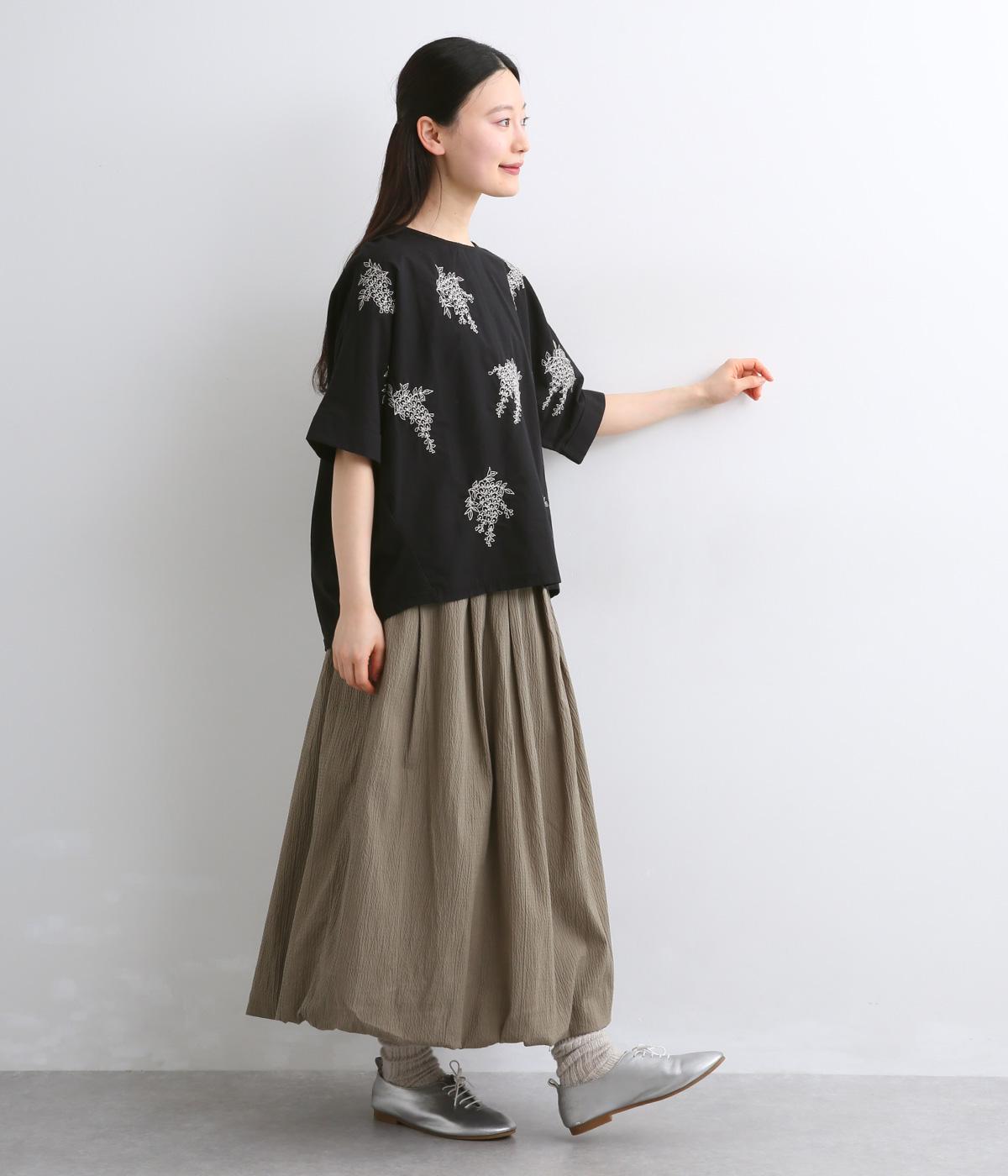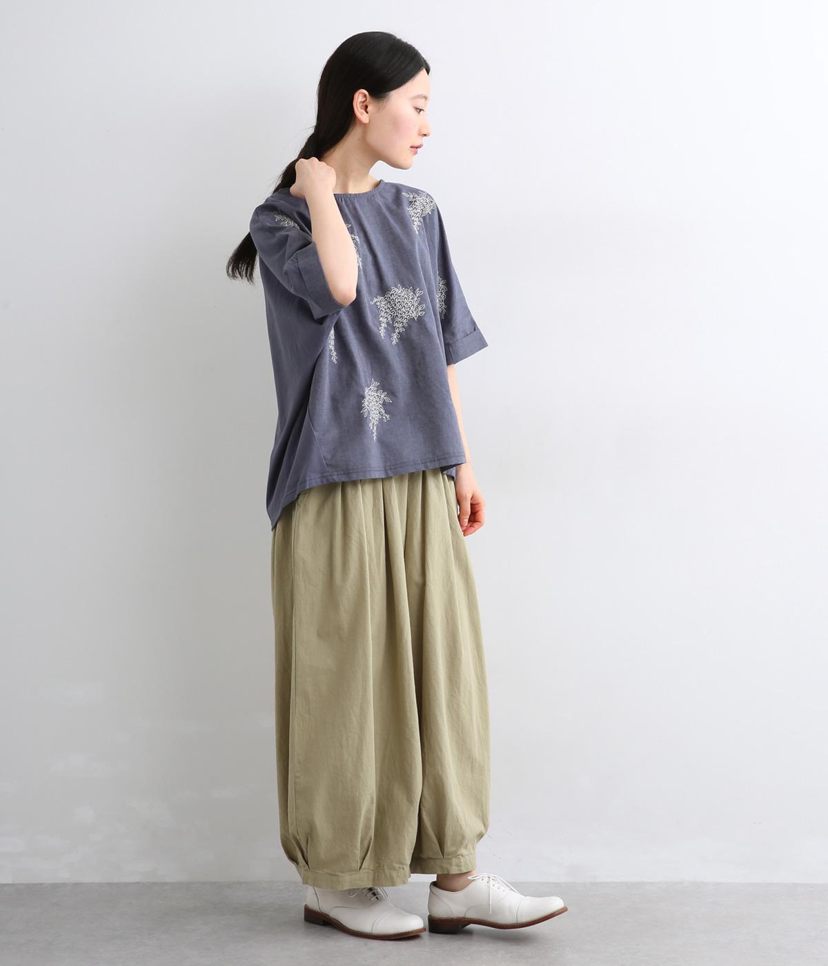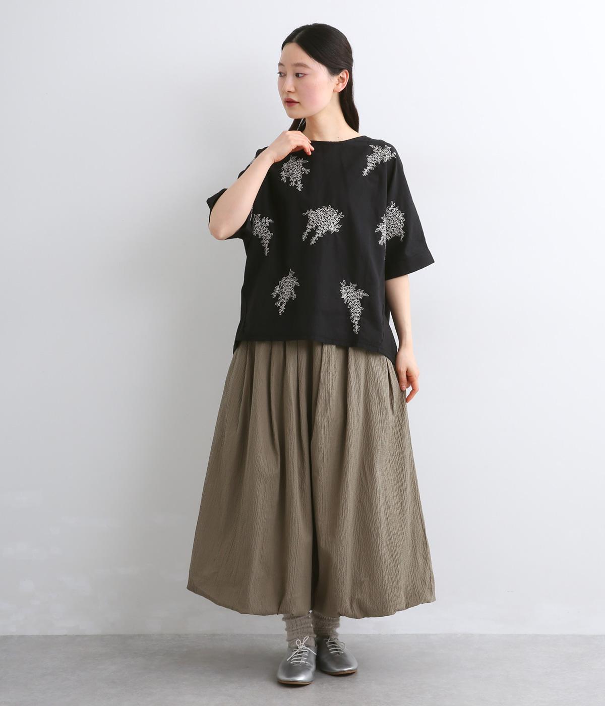 さらりとしたコットンリネンの布帛とソフトな肌ざわりのコットンカットソーを切り替えました。花柄は贅沢に刺しゅうで表現しています。通気性のよい快適な着心地の生地です。