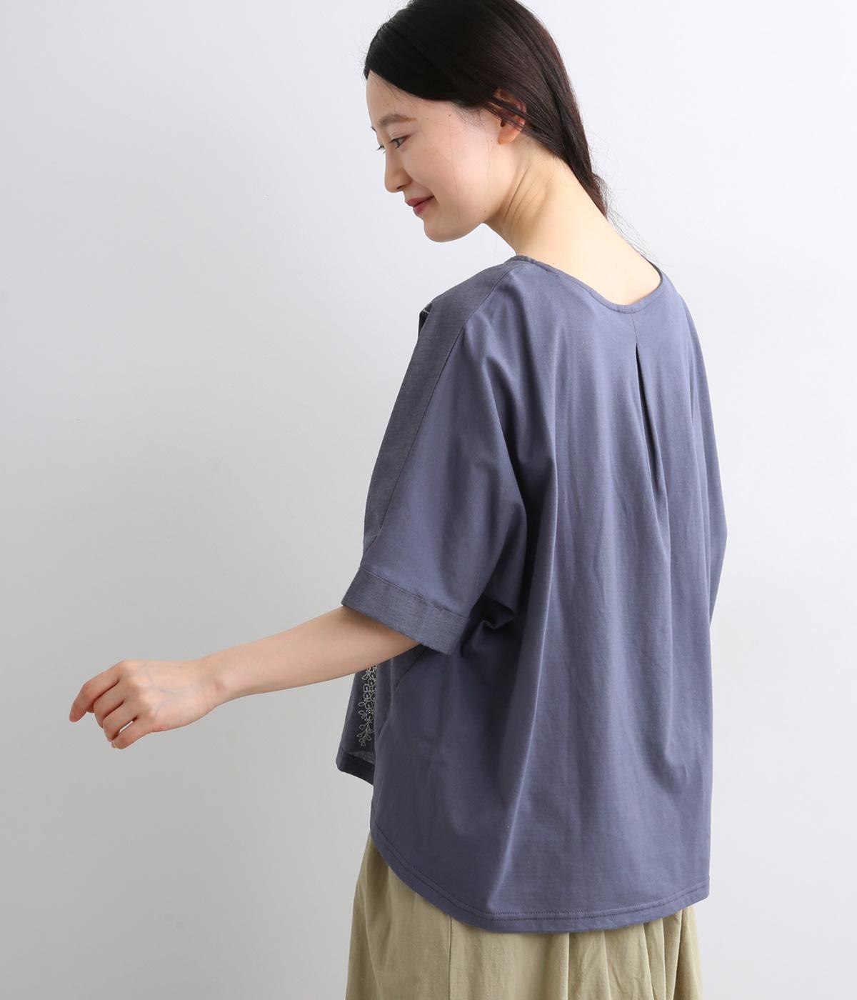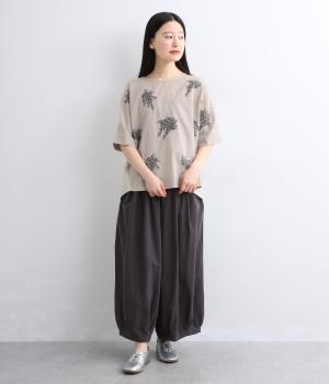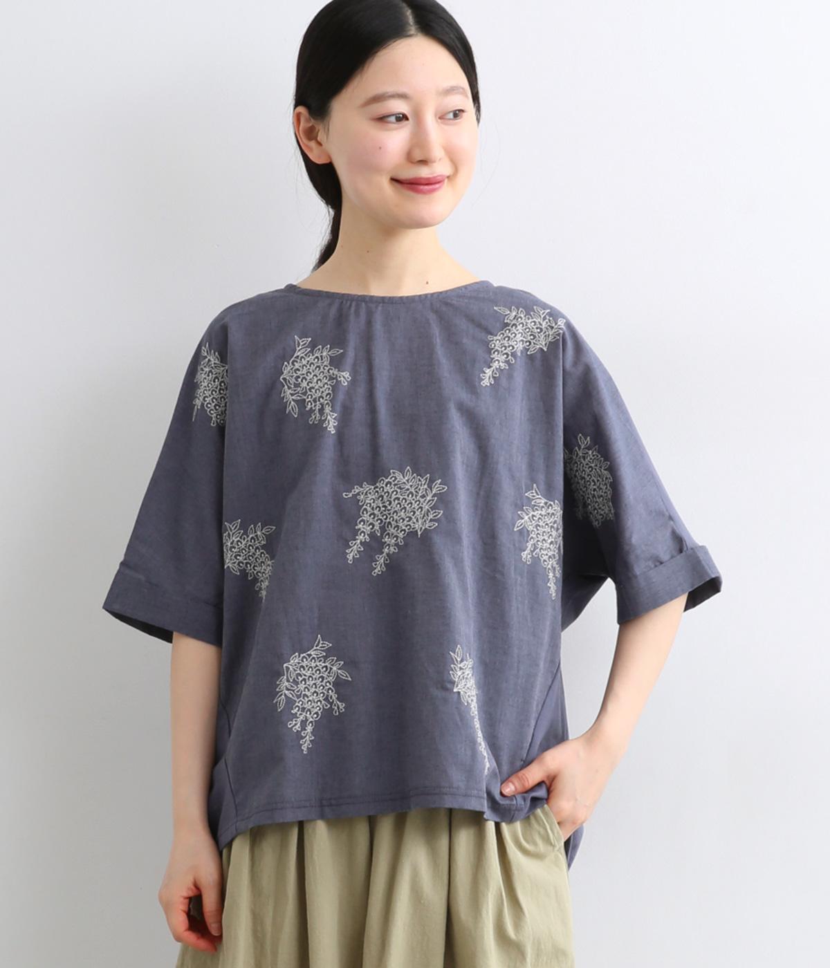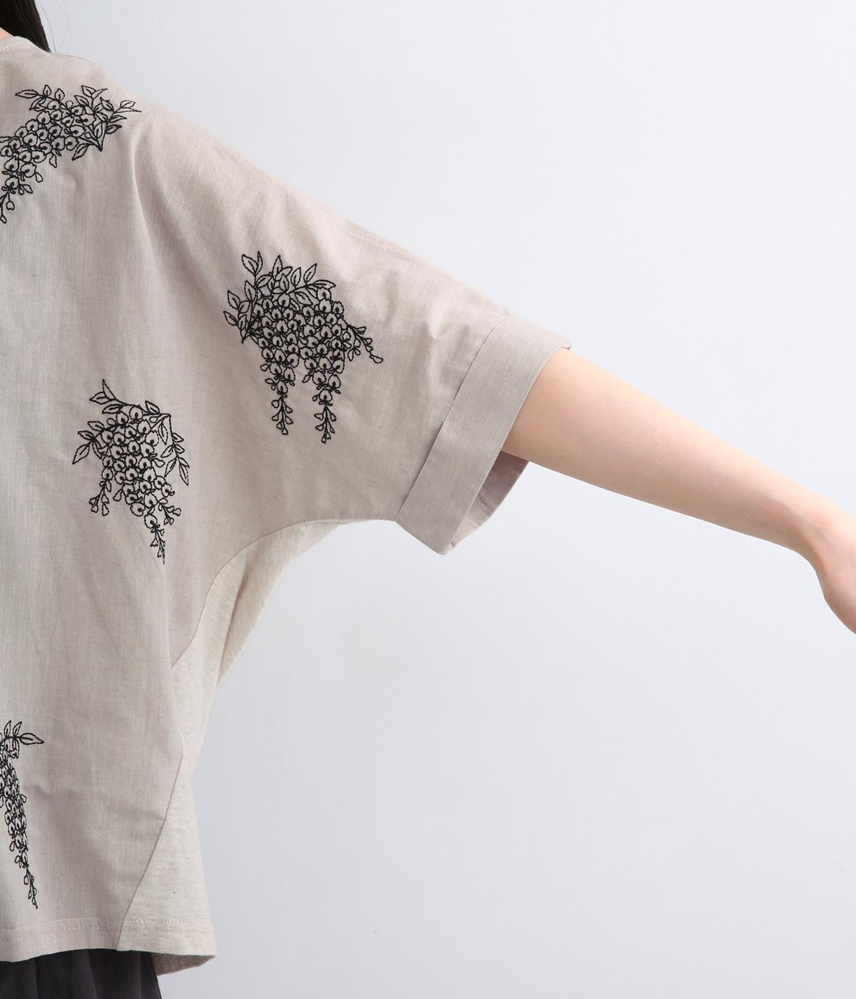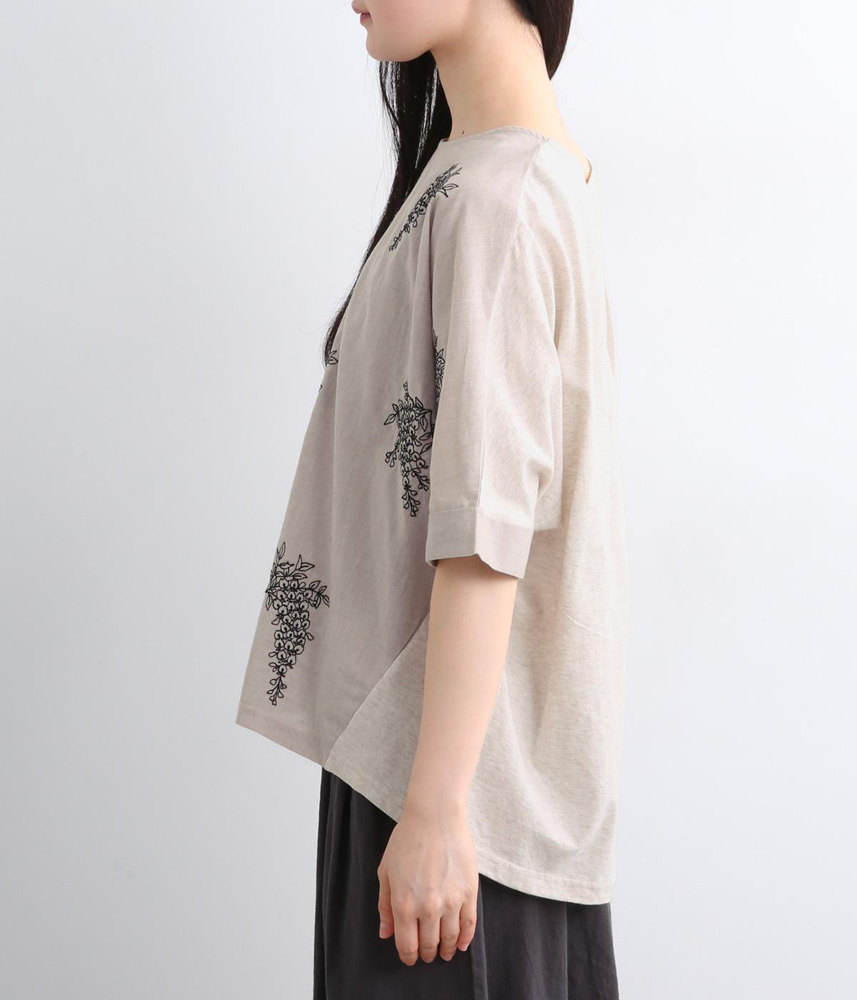 さらりとしたコットンリネンの布帛とソフトな肌ざわりのコットンカットソーを切り替えました。花柄は贅沢に刺しゅうで表現しています。通気性のよい快適な着心地の生地です。