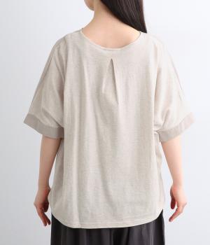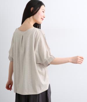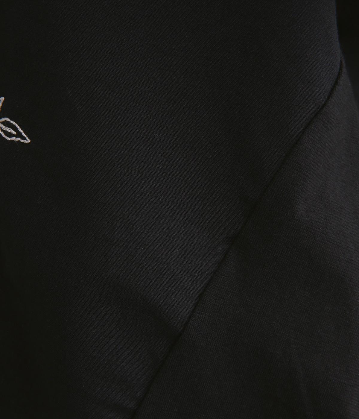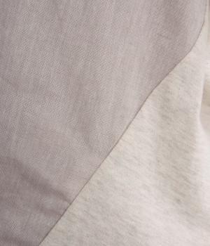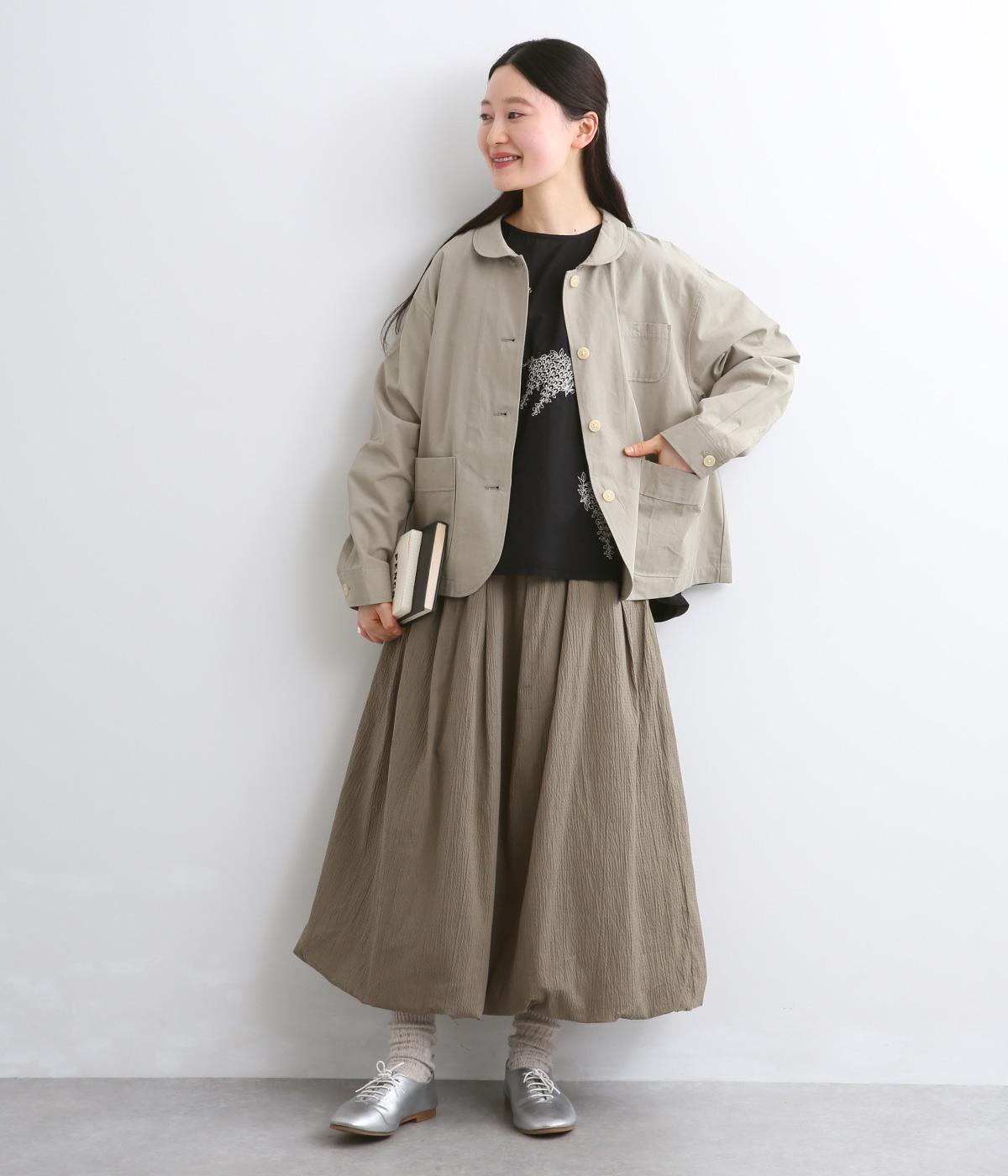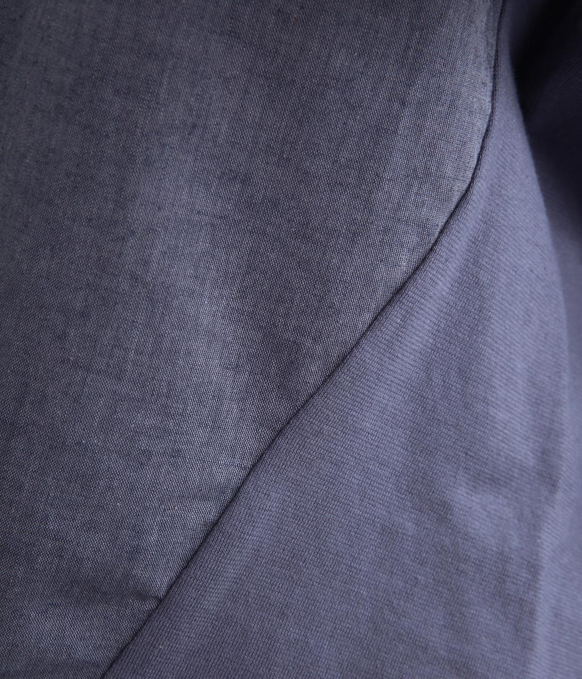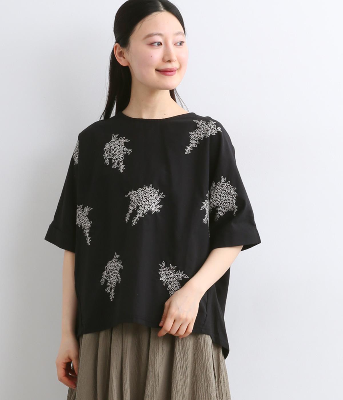 さらりとしたコットンリネンの布帛とソフトな肌ざわりのコットンカットソーを切り替えました。花柄は贅沢に刺しゅうで表現しています。通気性のよい快適な着心地の生地です。