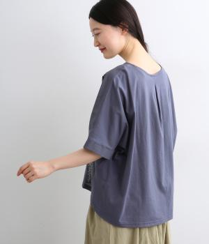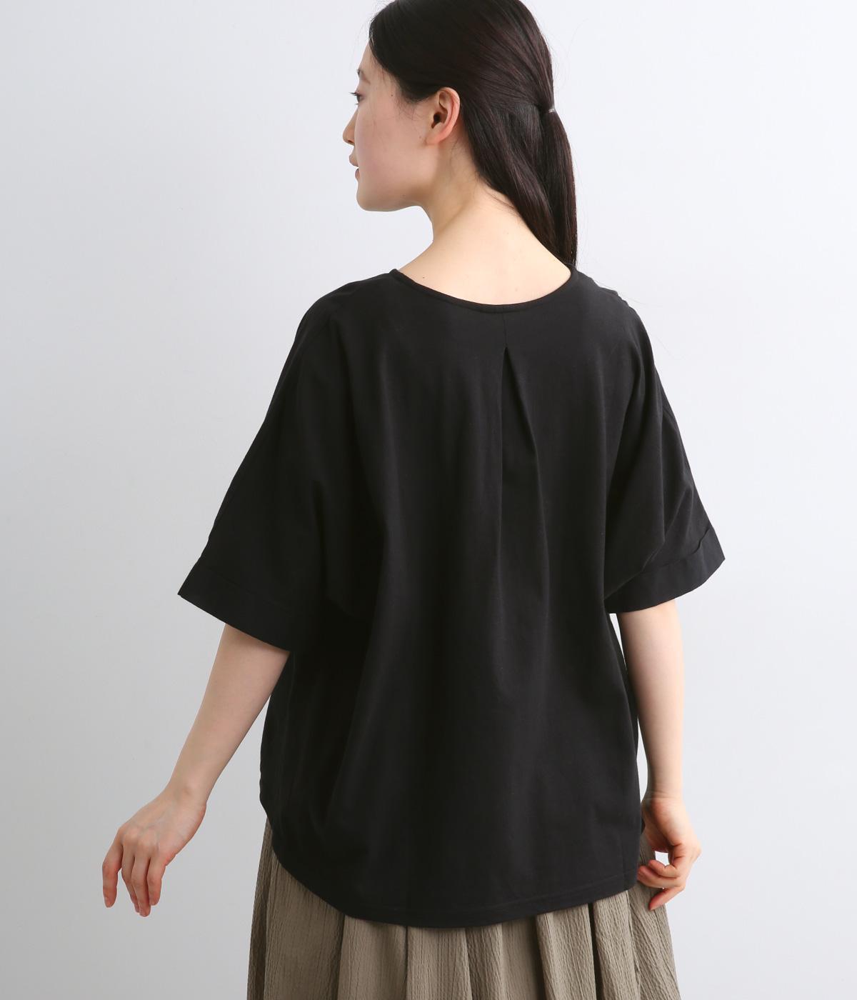 前後で異素材を切り替えたブラウスです。前身頃の布帛には大ぶりな花柄刺しゅうをあしらって華やかな雰囲気に。プレーンな背中にはタックをほどこし、うしろ姿にもアクセントを添えました。一枚でスタイリングが完成する着映えトップスです。