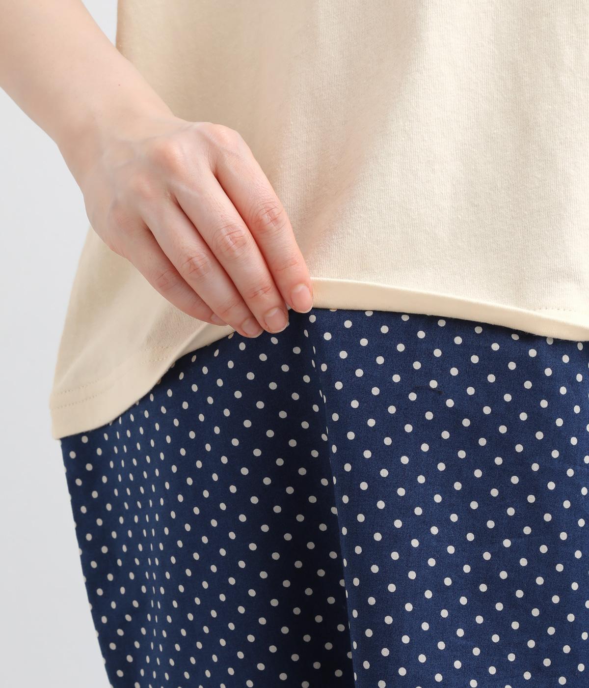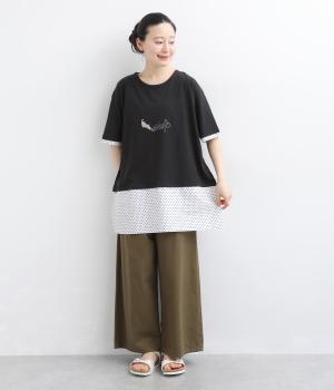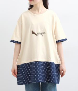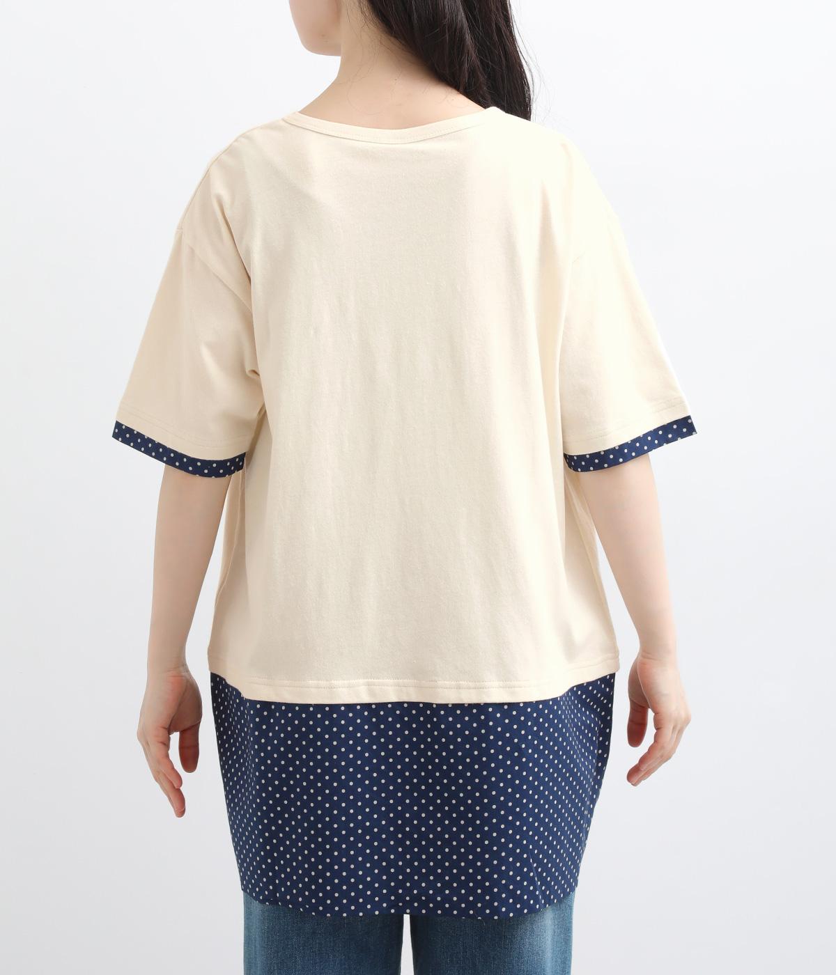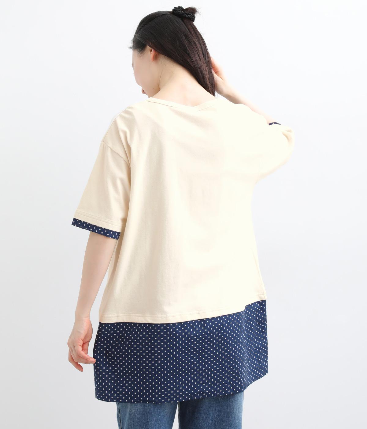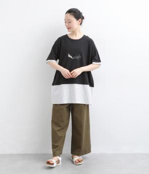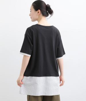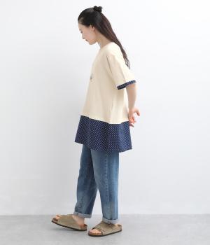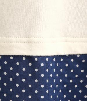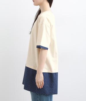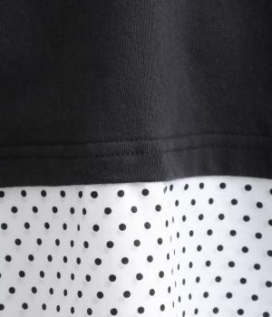 コットン裏毛無地+先染めコットン布帛ドット柄プリント入り異素材切替チュニック