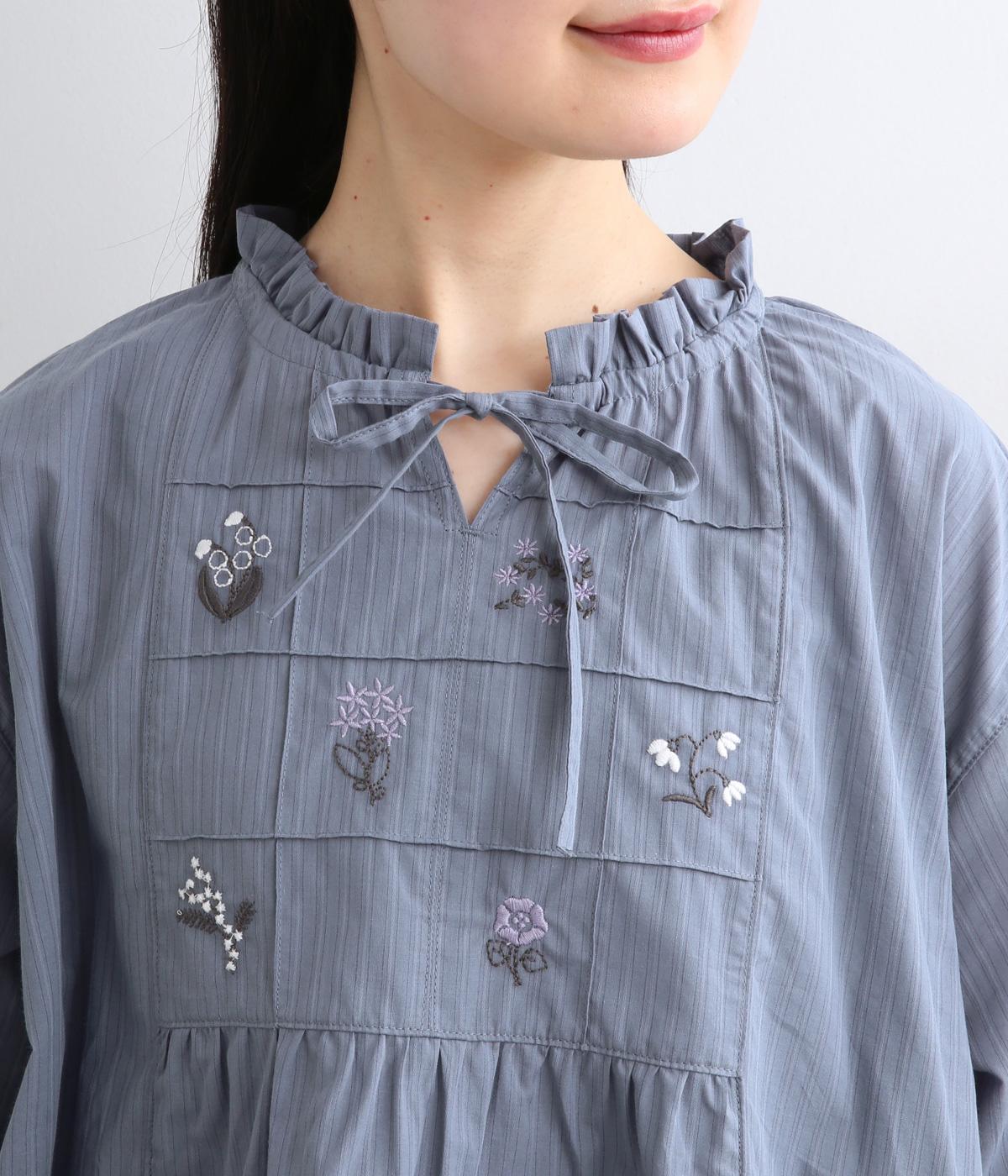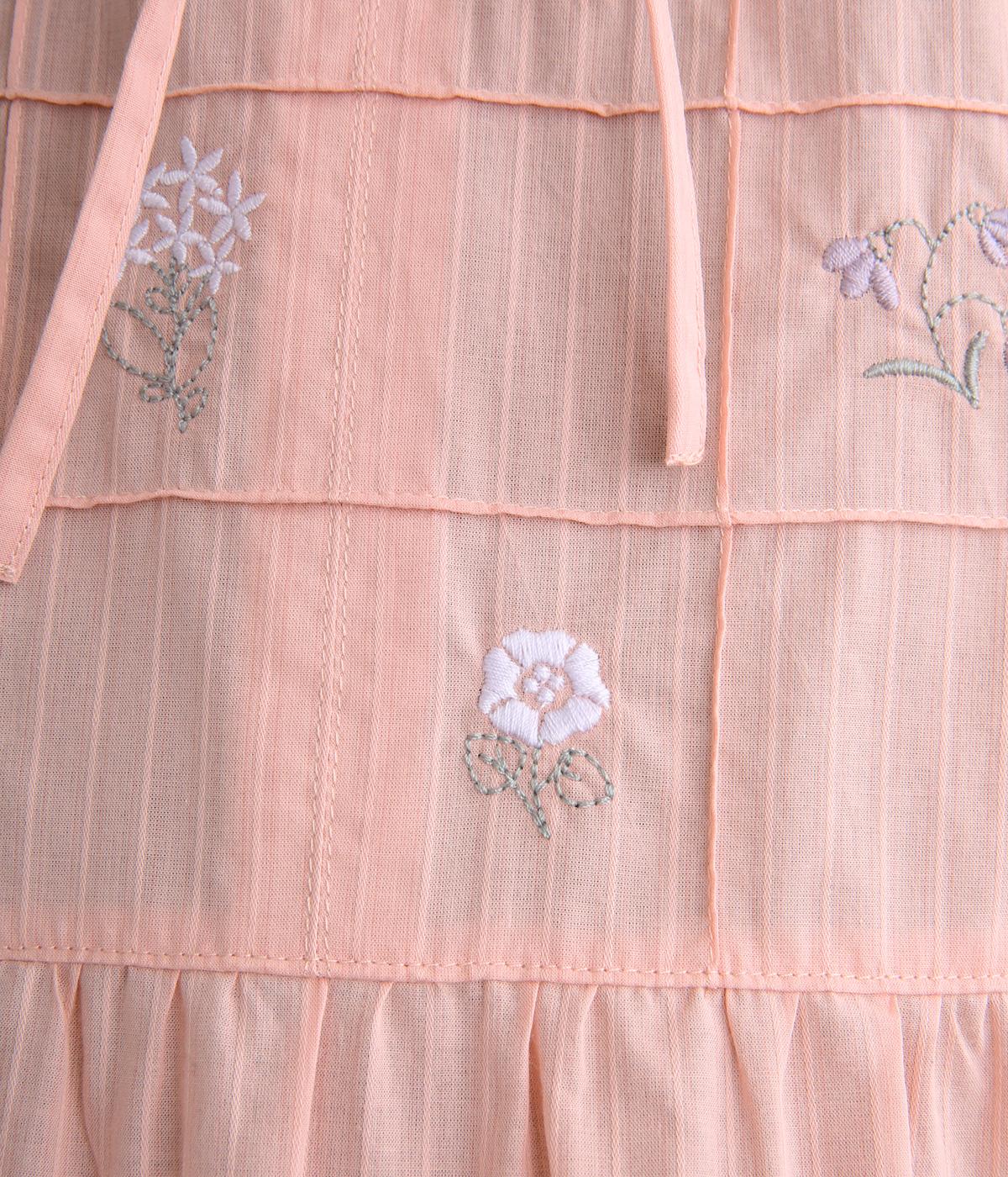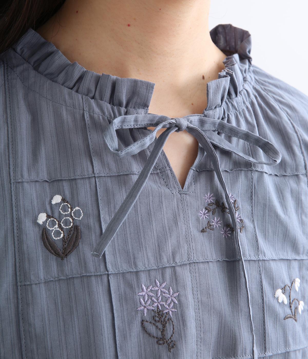 胸元に花柄と格子を刺しゅうで立体的に表現しました。フリルネックと首元の紐がかわいらしいアクセントを添えています。軽やかな生地がふんわりと広がるシルエットで、華やかな雰囲気を引き立てる仕上がりです。