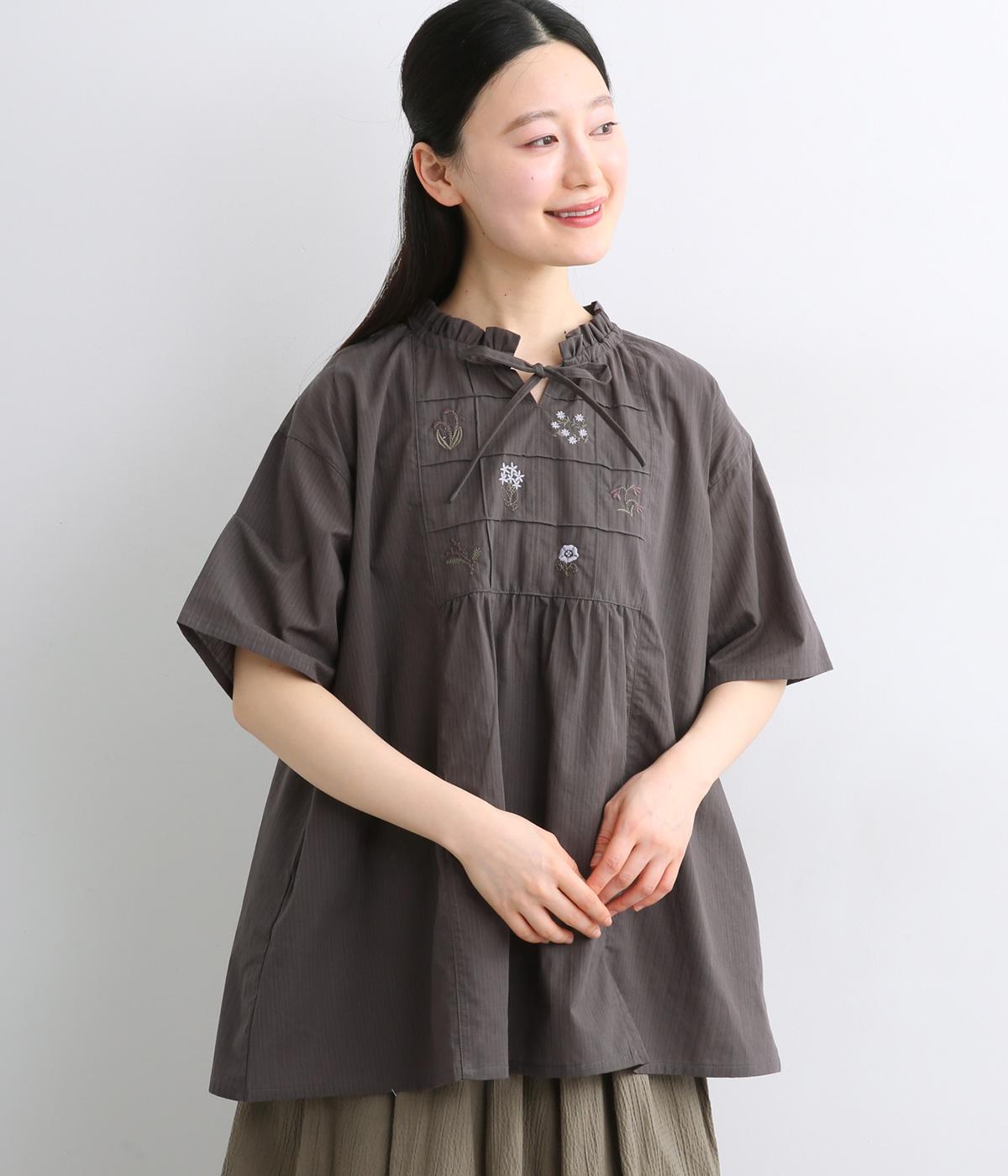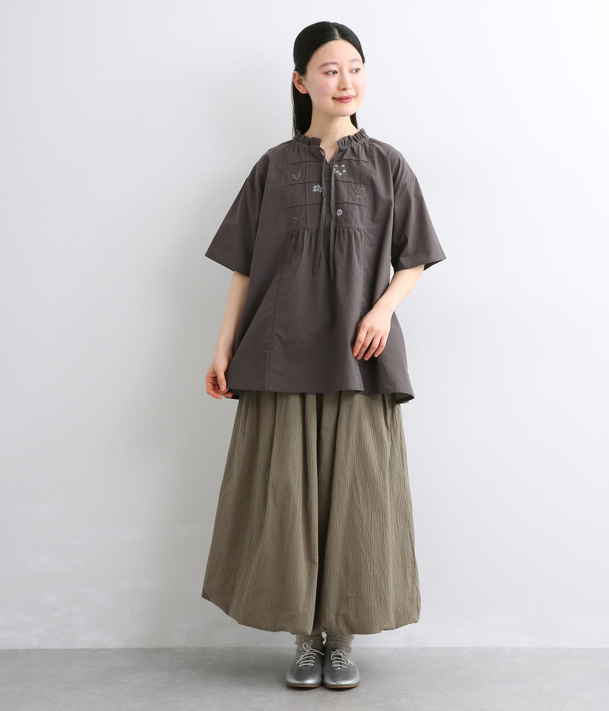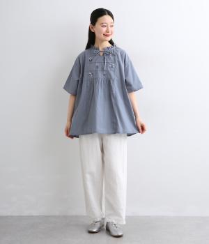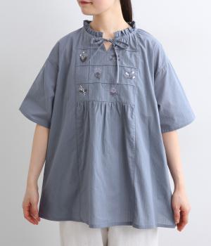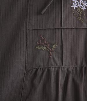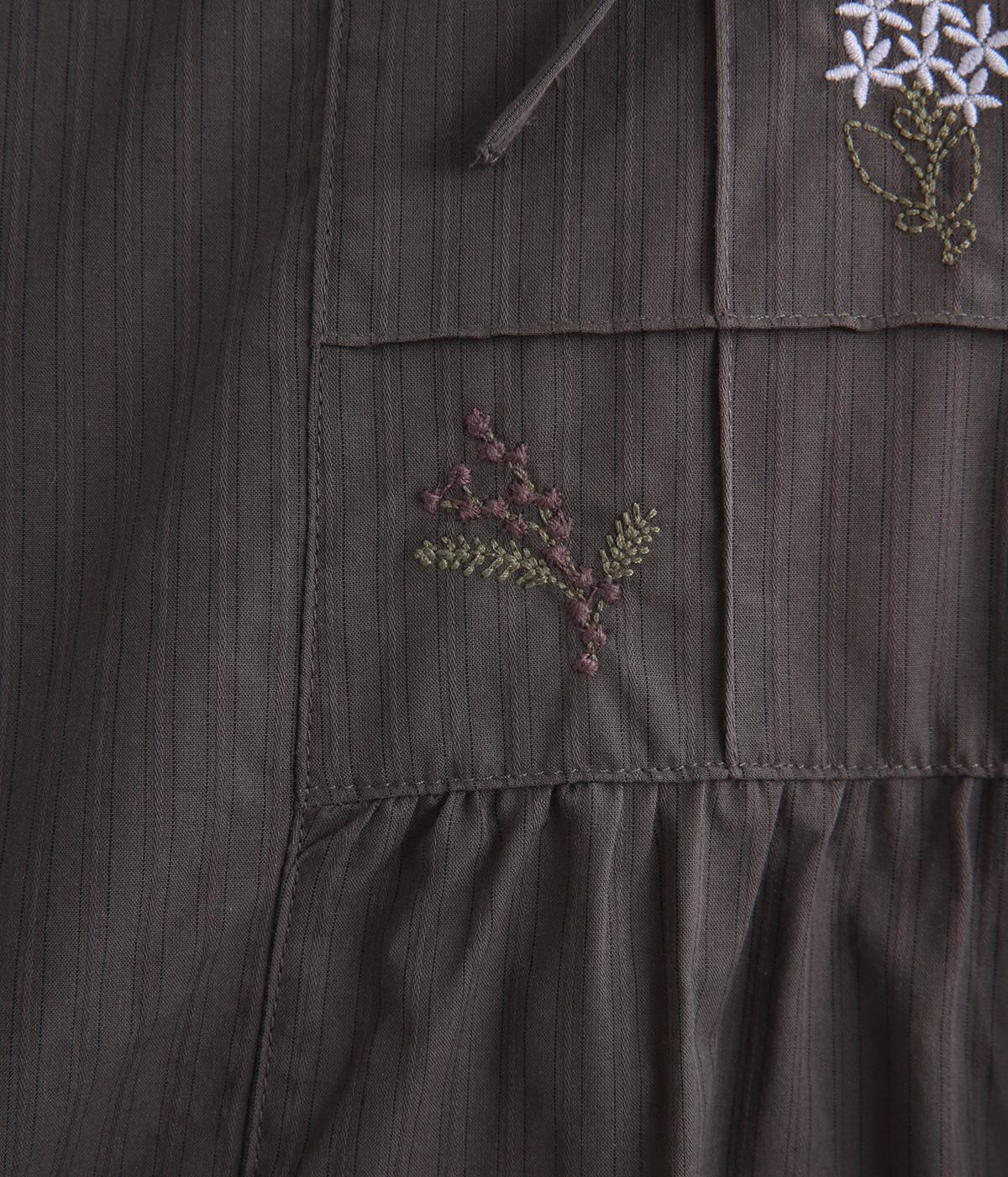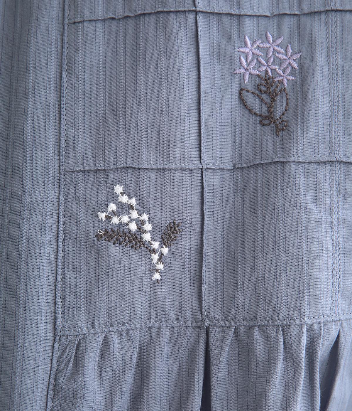 胸元に花柄と格子を刺しゅうで立体的に表現しました。フリルネックと首元の紐がかわいらしいアクセントを添えています。軽やかな生地がふんわりと広がるシルエットで、華やかな雰囲気を引き立てる仕上がりです。
