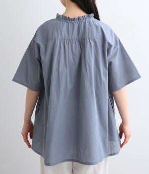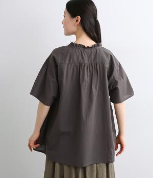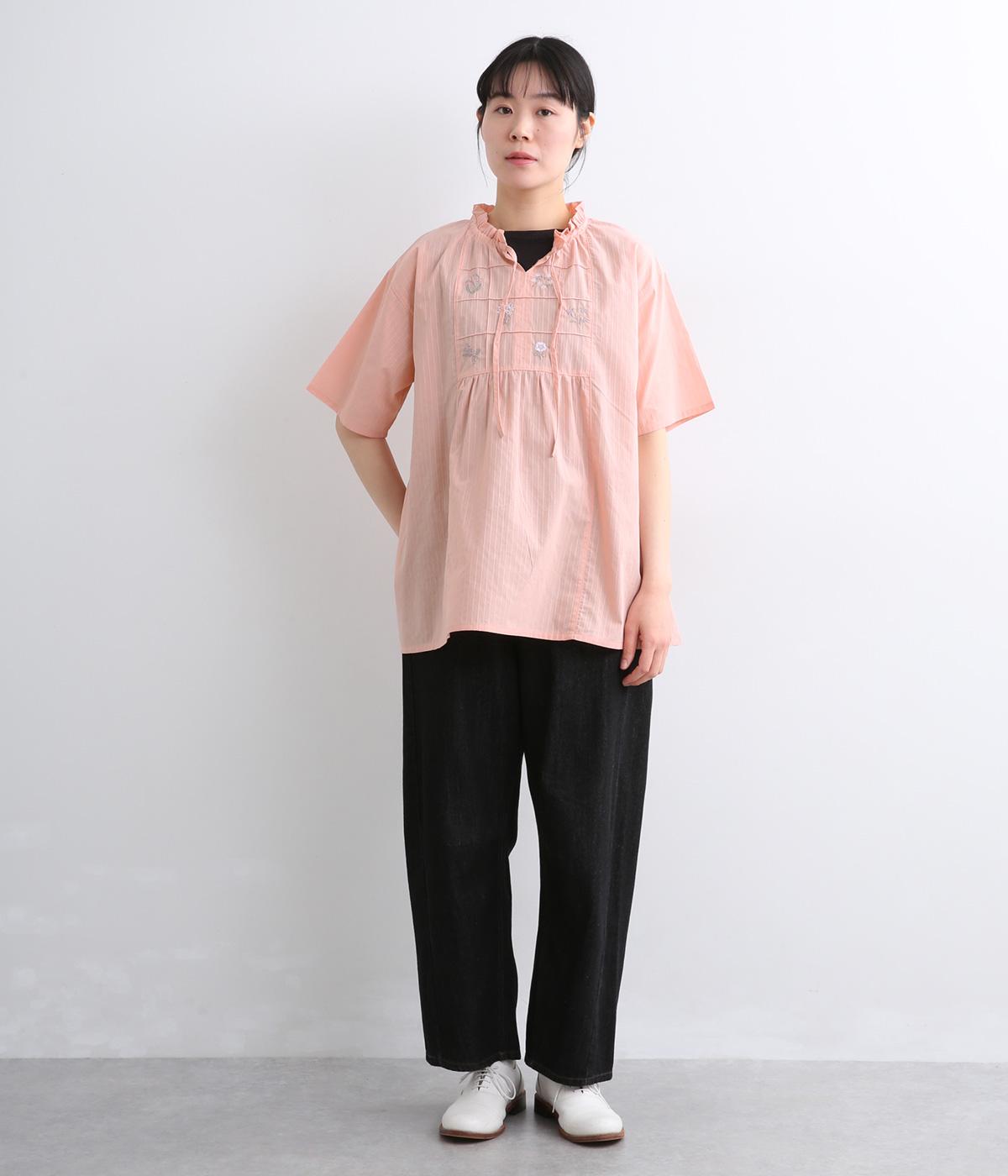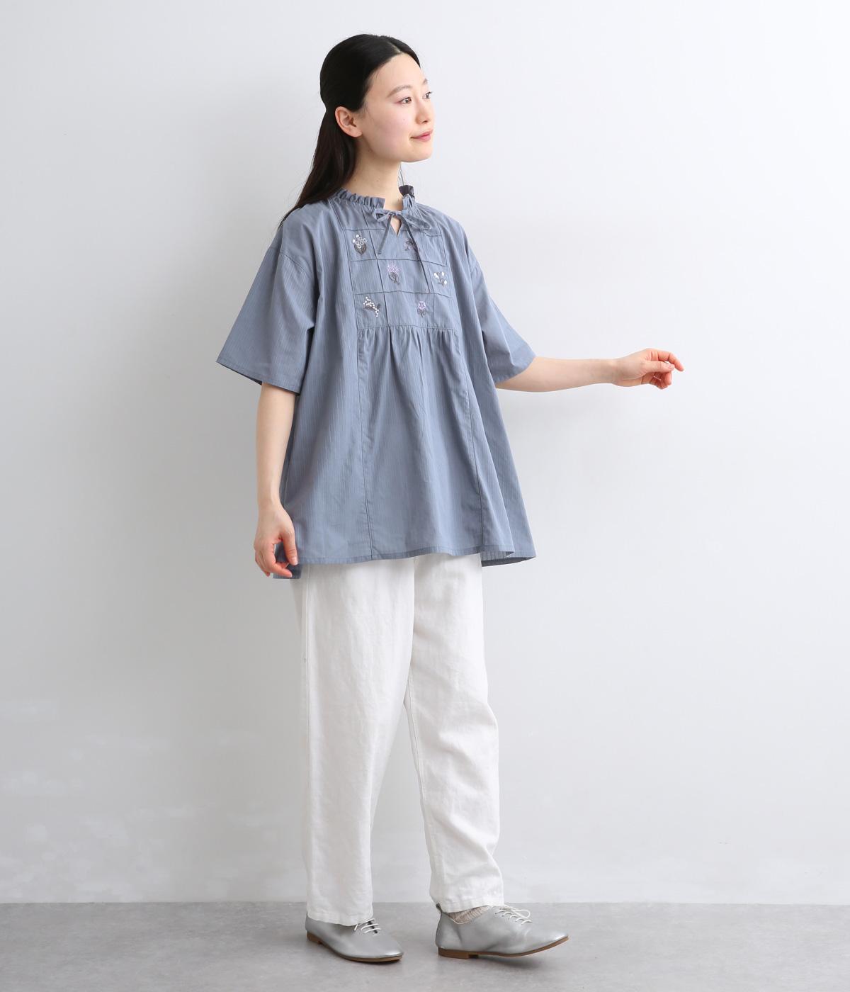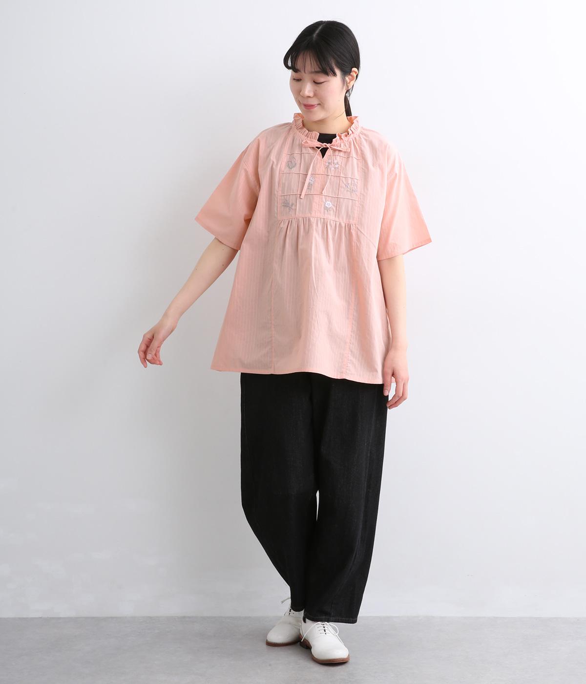 胸元に花柄と格子を刺しゅうで立体的に表現しました。フリルネックと首元の紐がかわいらしいアクセントを添えています。軽やかな生地がふんわりと広がるシルエットで、華やかな雰囲気を引き立てる仕上がりです。
