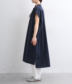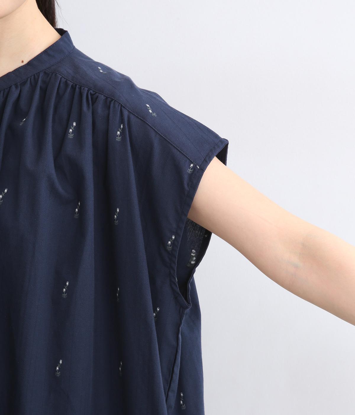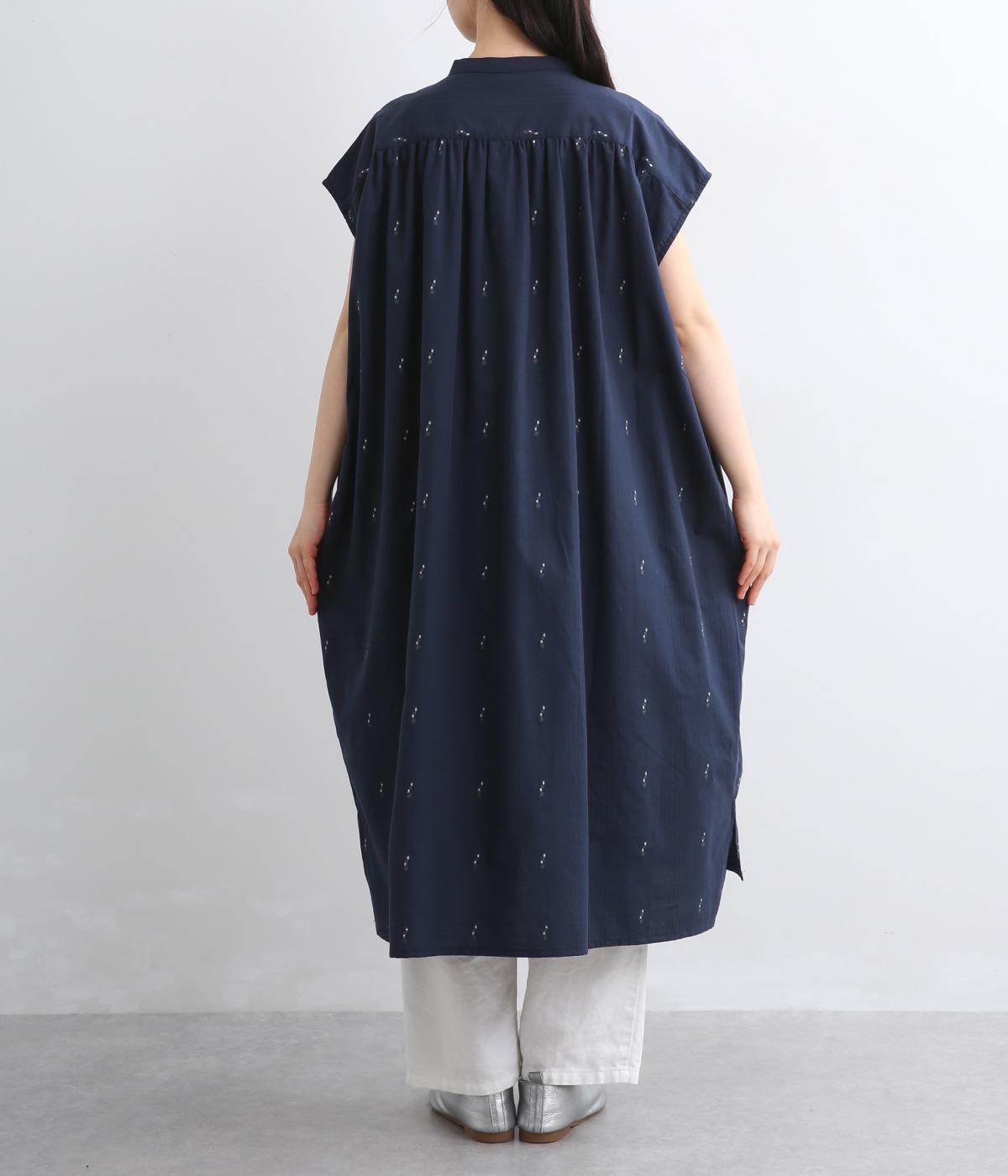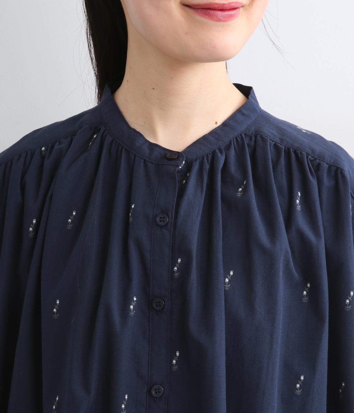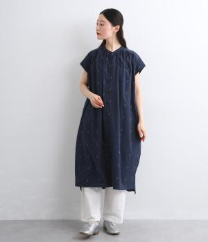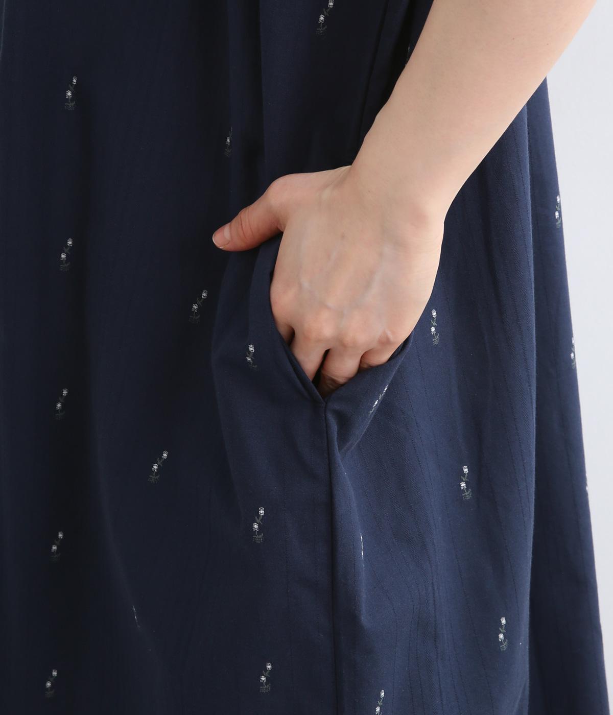 コットンジャカードストライプ×花柄 ギャザーワンピース(ネイビー-F)