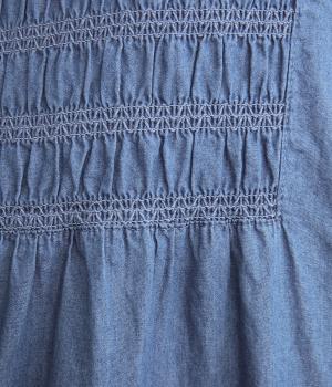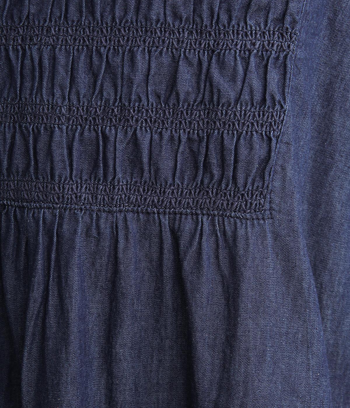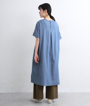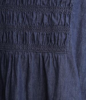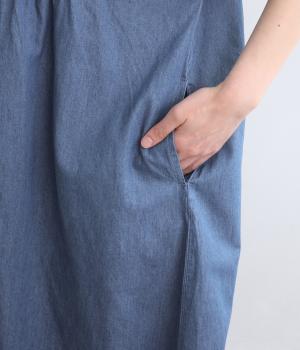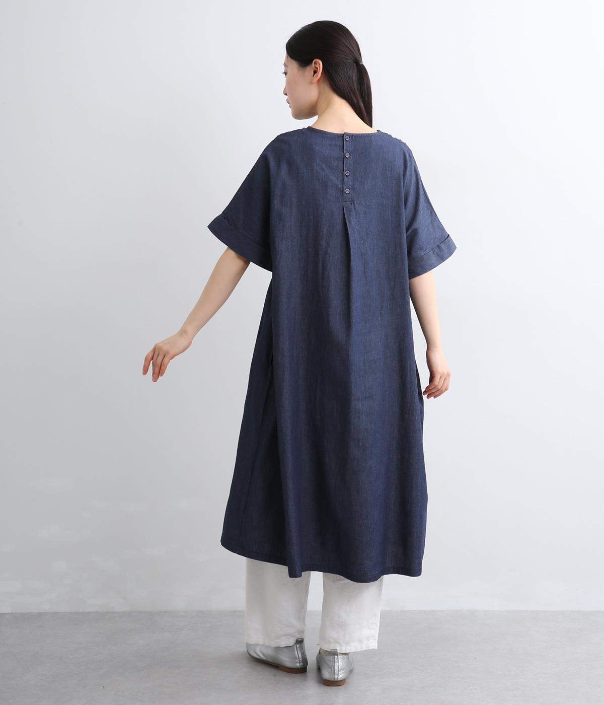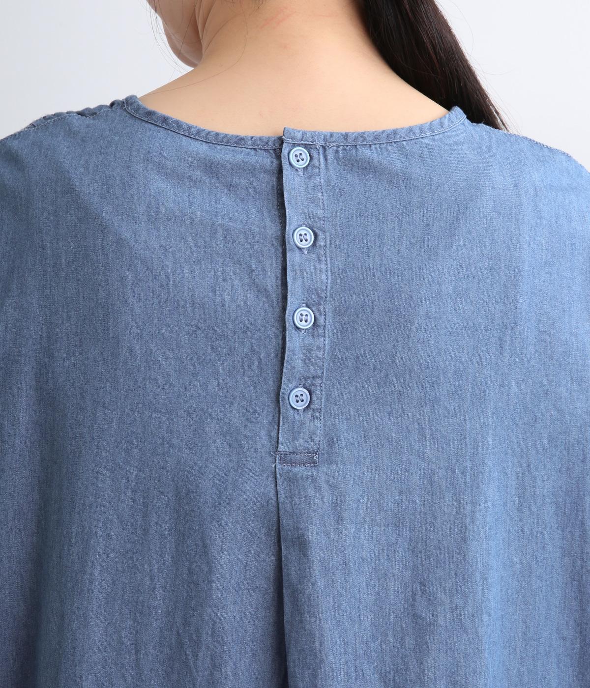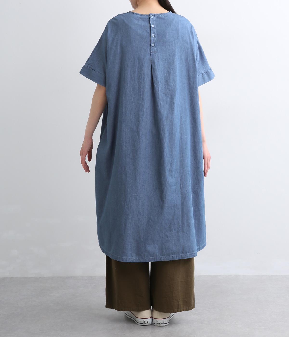薄手で軽やかなコットンデニム生地。やわらかさとほどよいハリを備え、身体のラインを拾いにくく、インディゴ染めのナチュラルな風合いがやさしい印象を添えます。