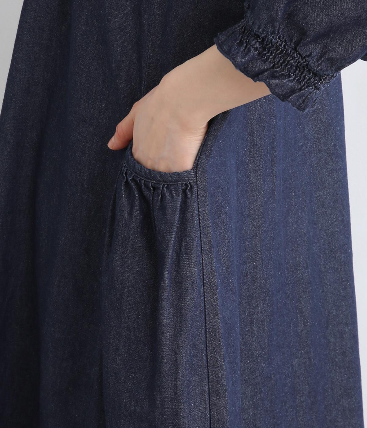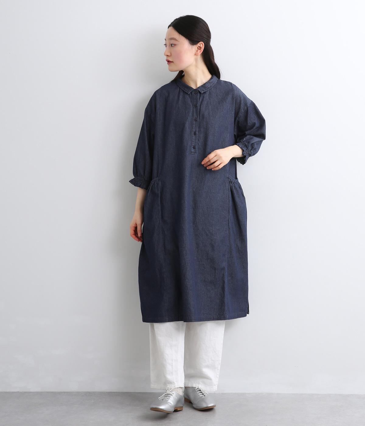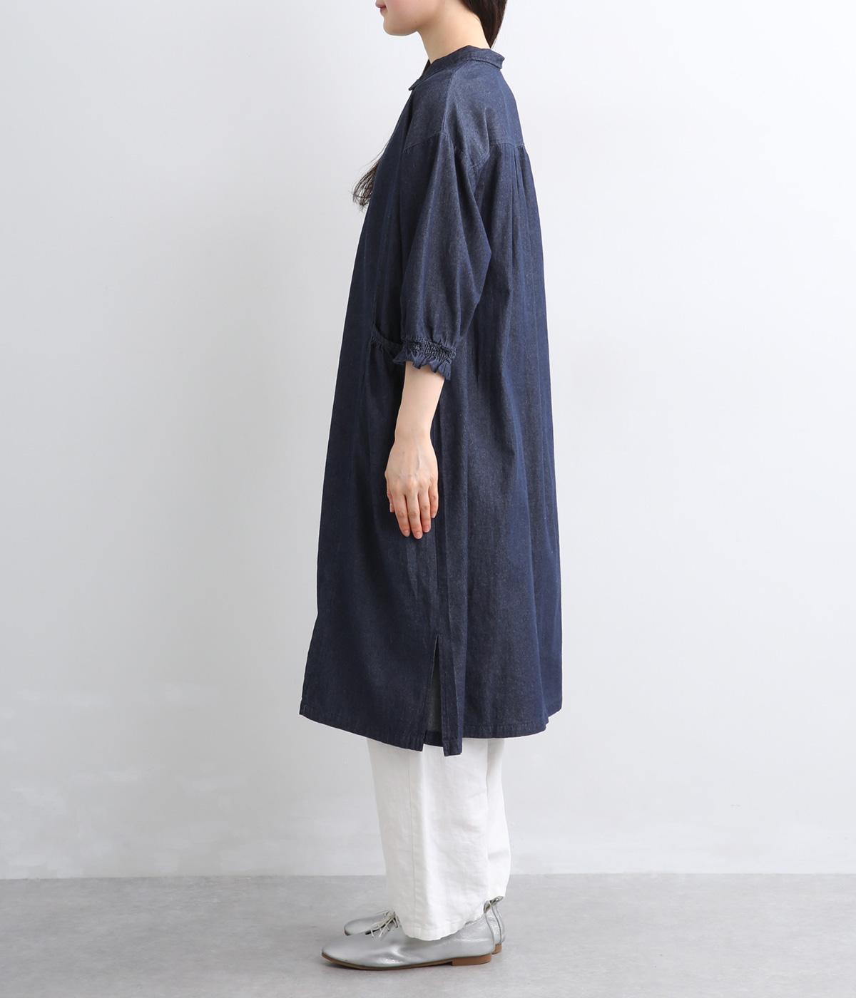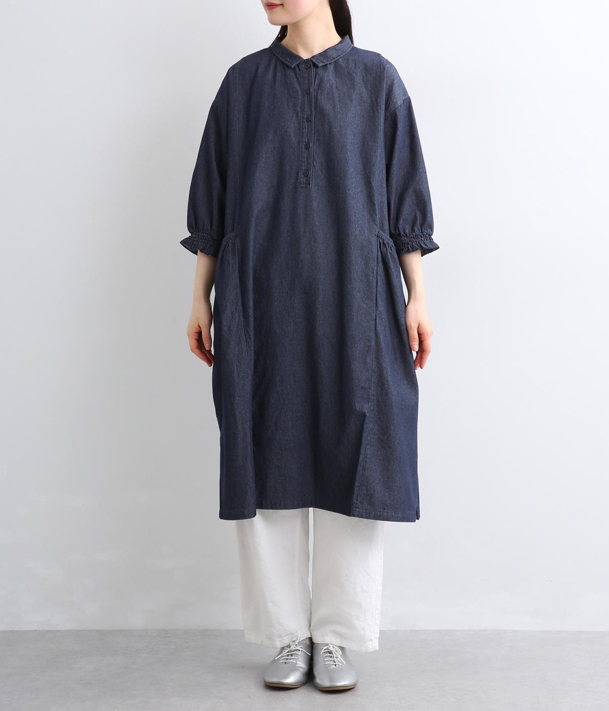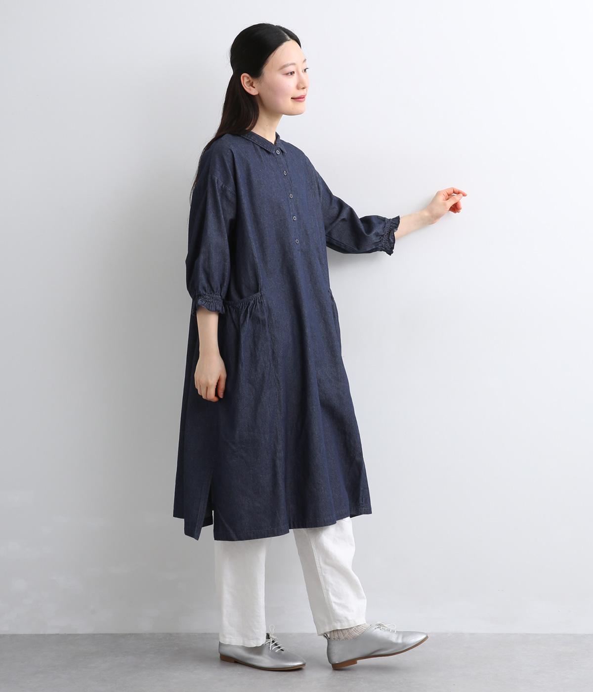 袖口とポケットに寄せたギャザーがかわいらしさを添えるワンピース。コットンデニムの素材感やヘンリーネックが大人のデイリーカジュアルに寄り添います。七分袖やサイドスリットでほどよい抜け感を加え、レイヤードスタイルにもおすすめの一枚です。
