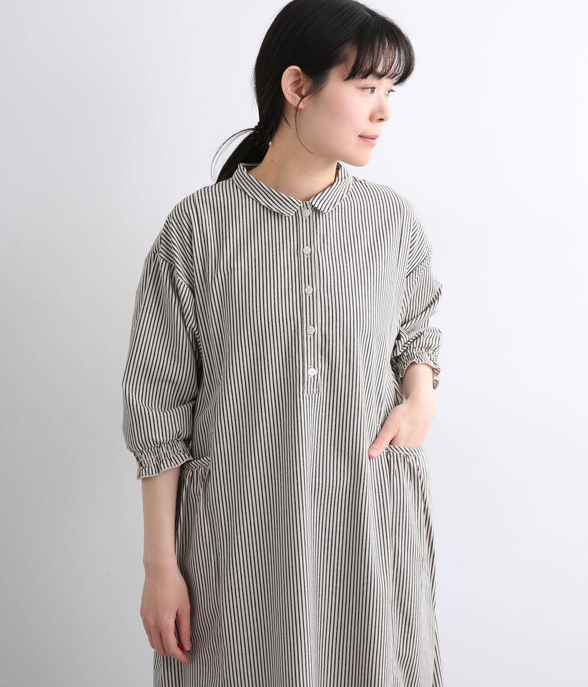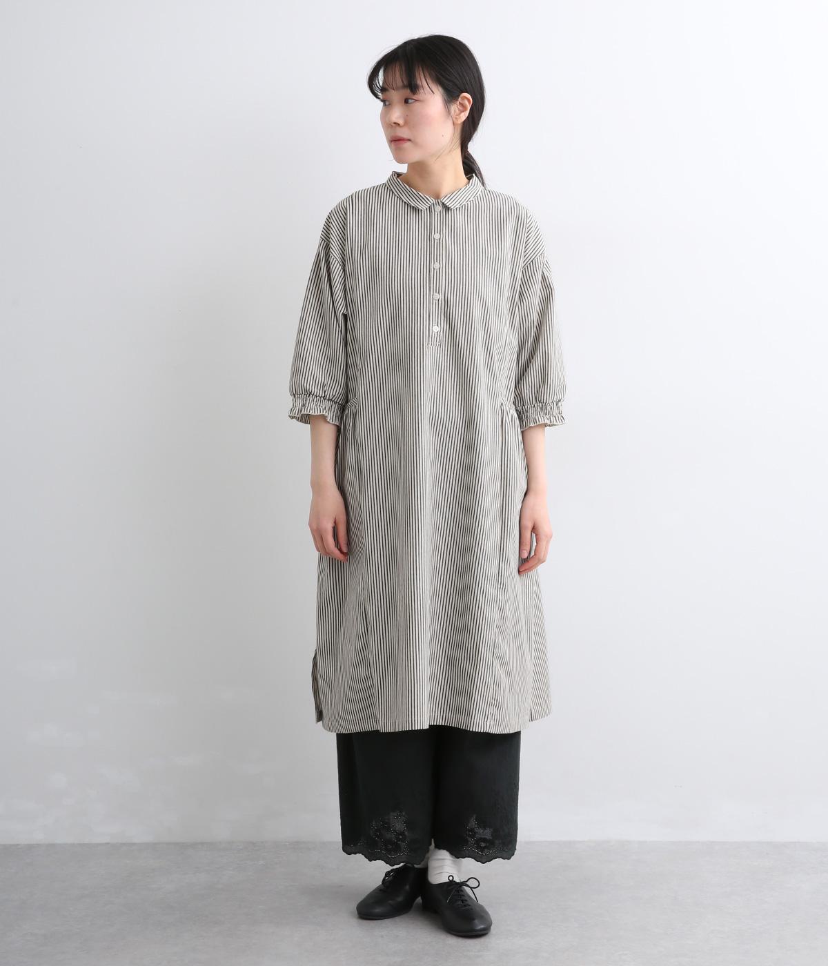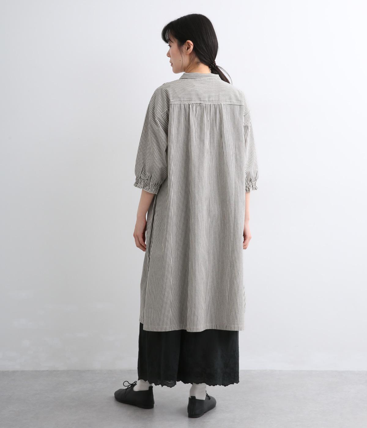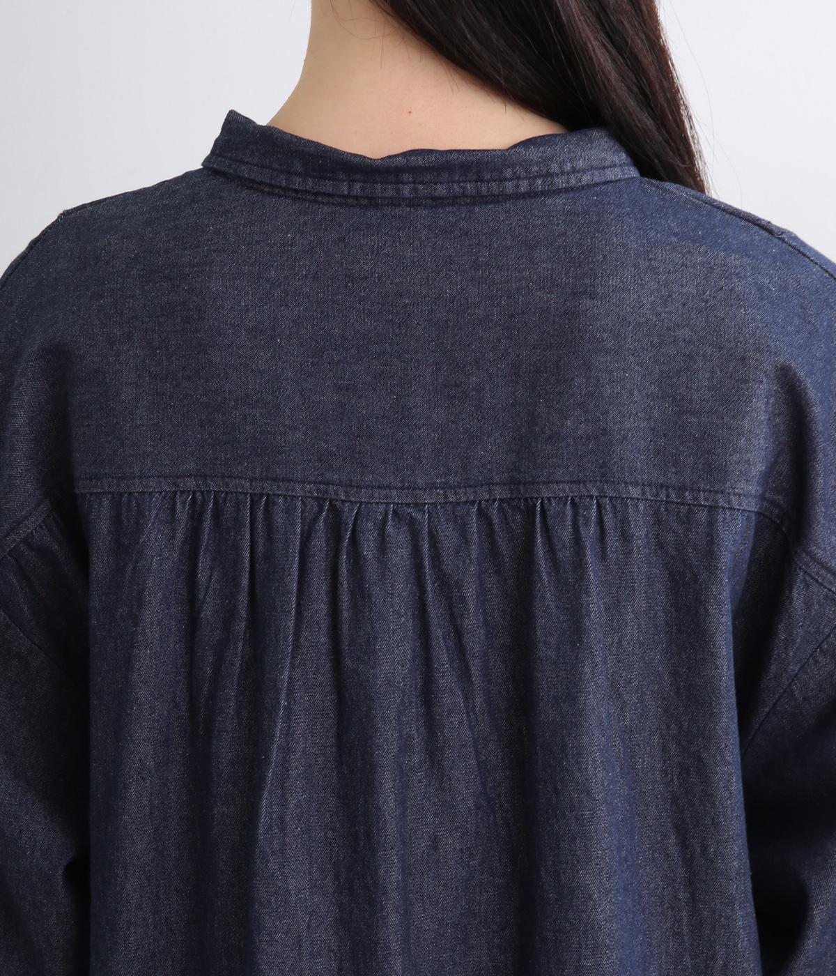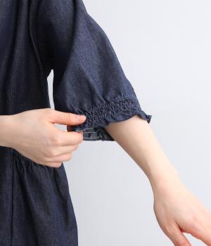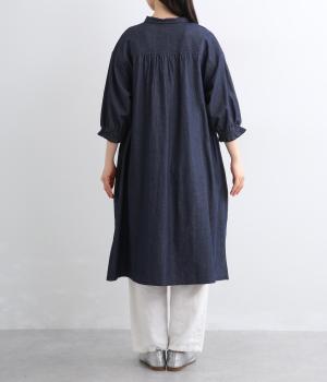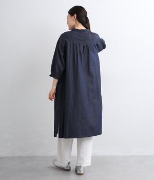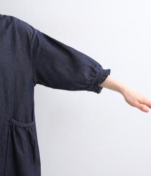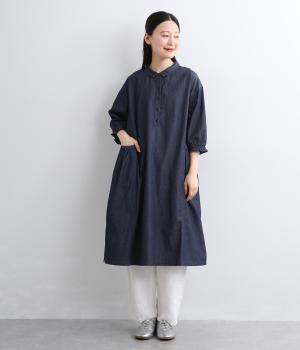 袖口とポケットに寄せたギャザーがかわいらしさを添えるワンピース。コットンデニムの素材感やヘンリーネックが大人のデイリーカジュアルに寄り添います。七分袖やサイドスリットでほどよい抜け感を加え、レイヤードスタイルにもおすすめの一枚です。