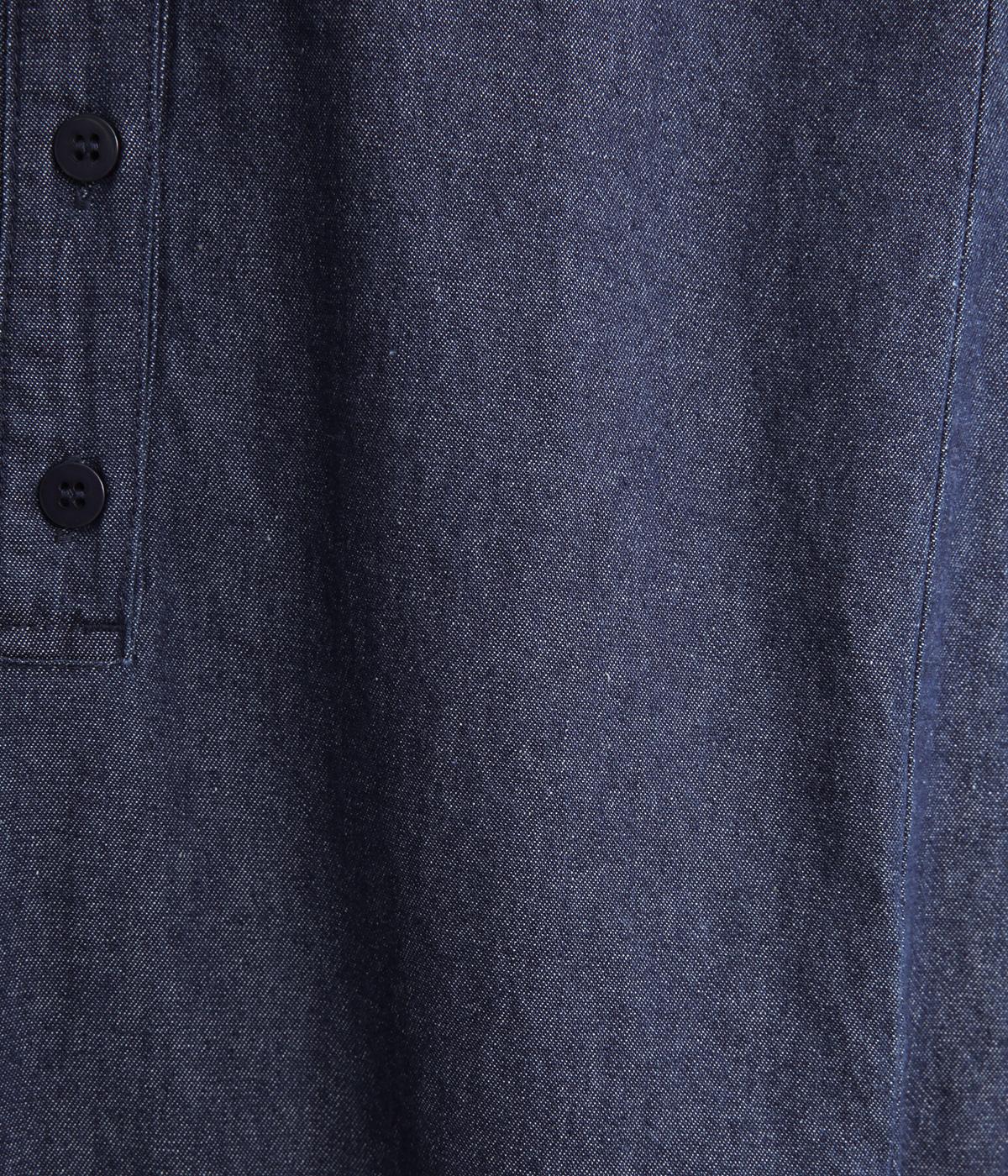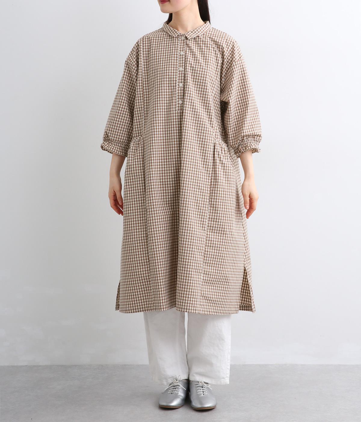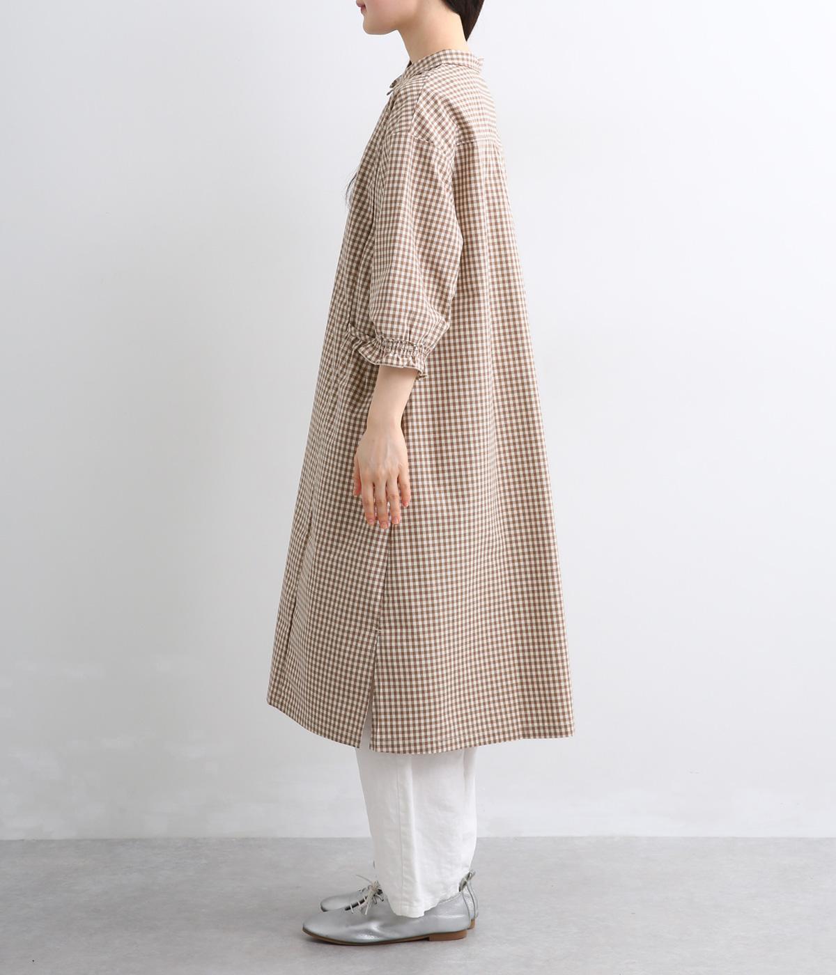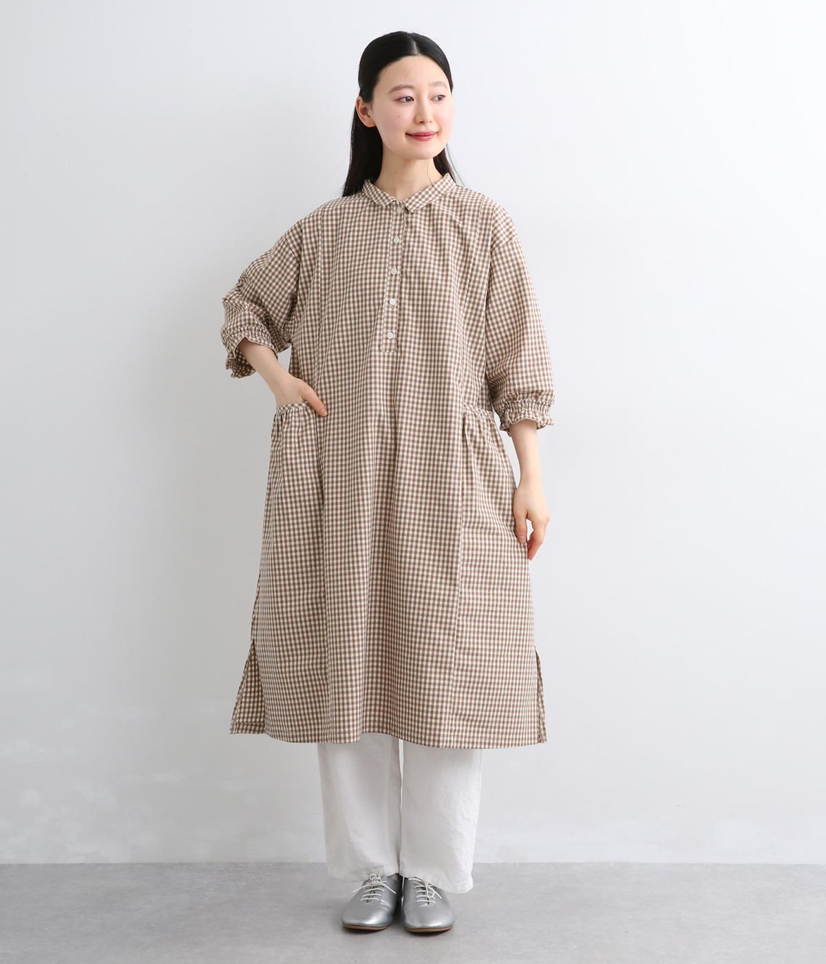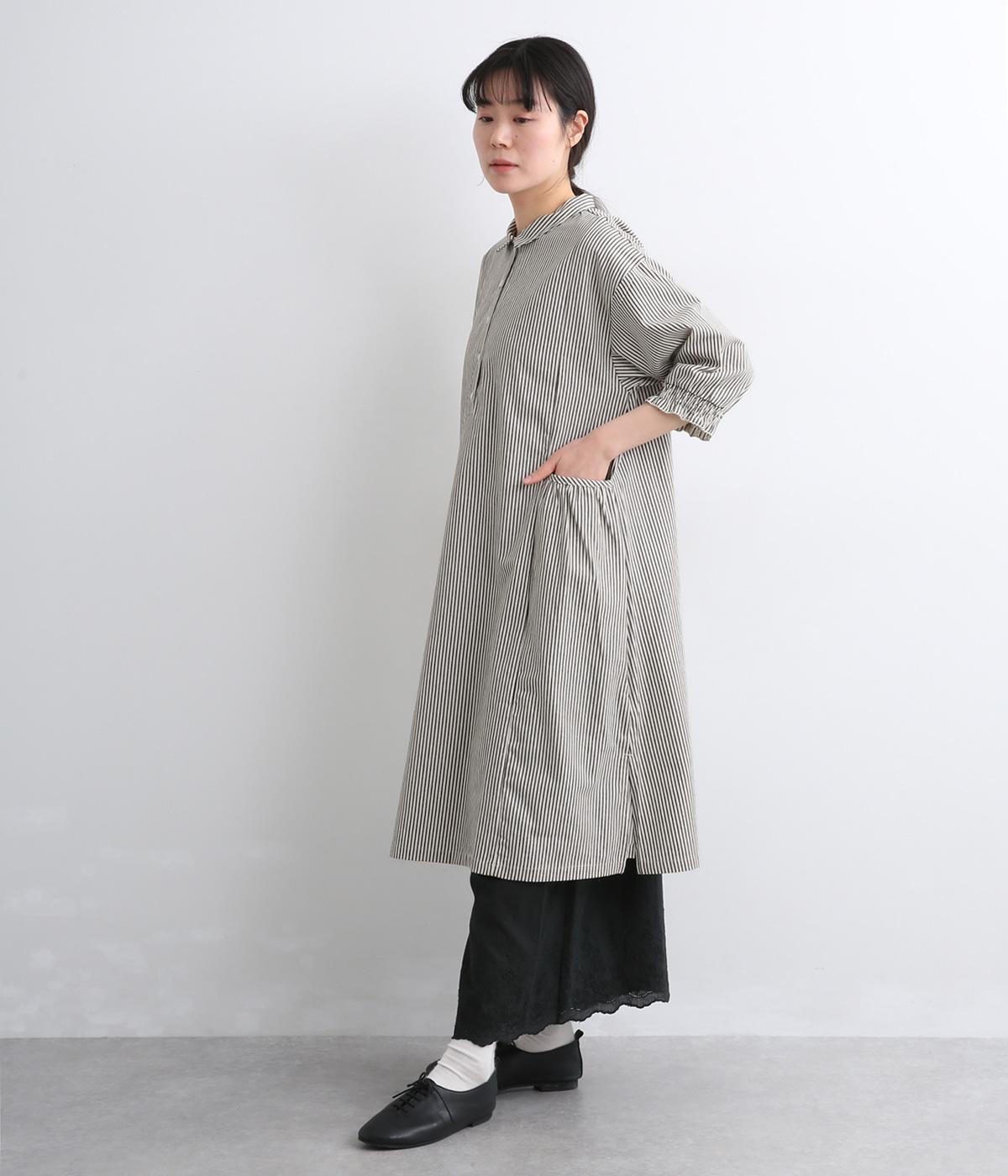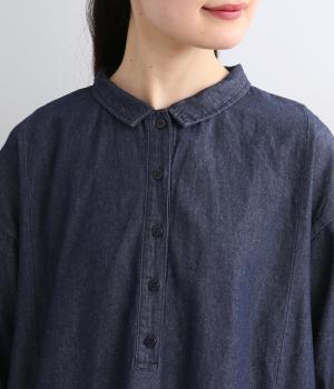 袖口とポケットに寄せたギャザーがかわいらしさを添えるワンピース。コットンデニムの素材感やヘンリーネックが大人のデイリーカジュアルに寄り添います。七分袖やサイドスリットでほどよい抜け感を加え、レイヤードスタイルにもおすすめの一枚です。
