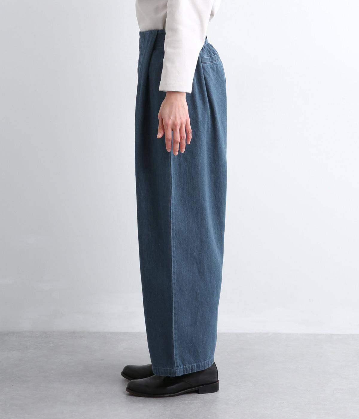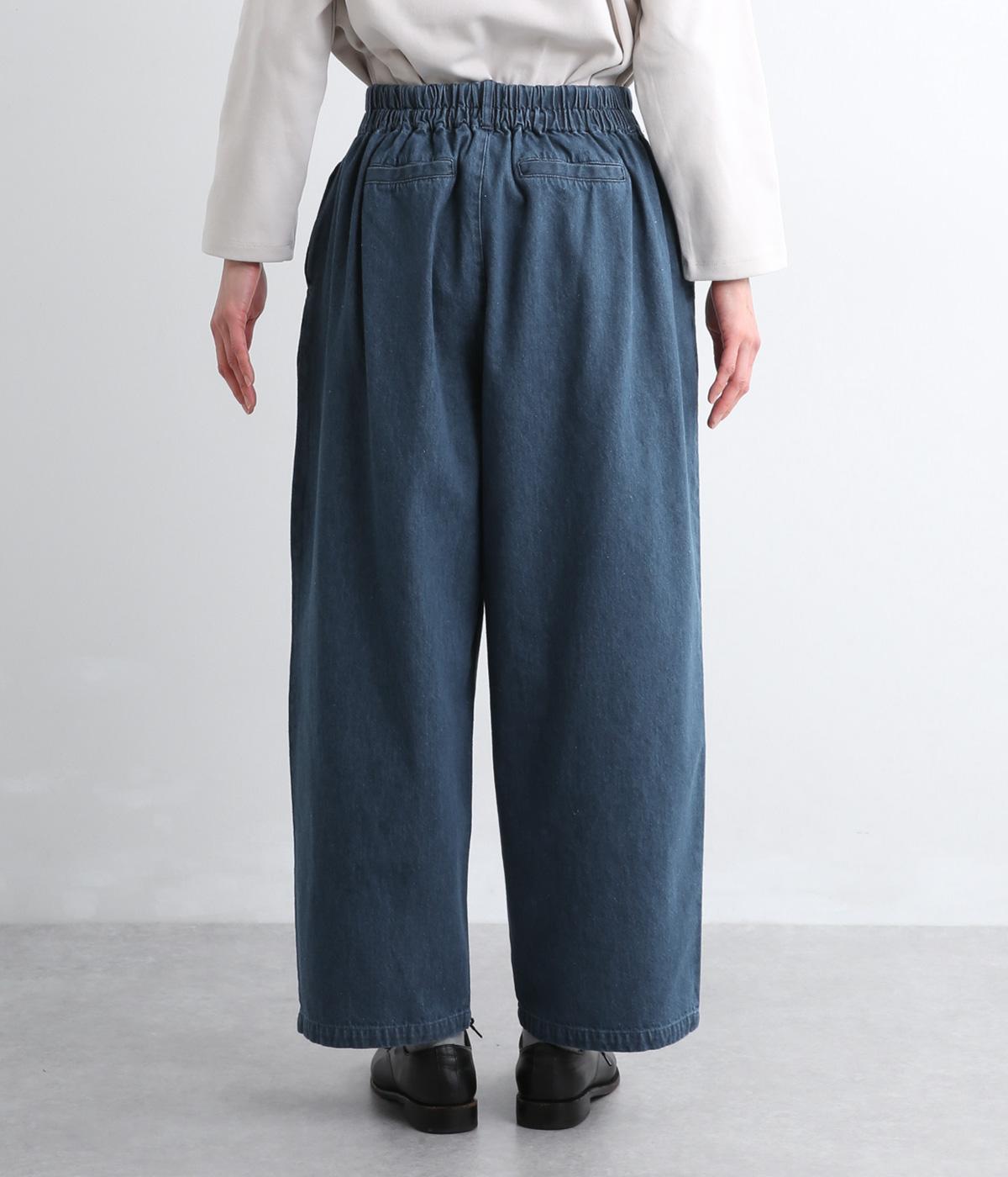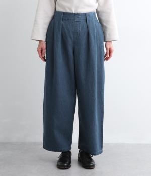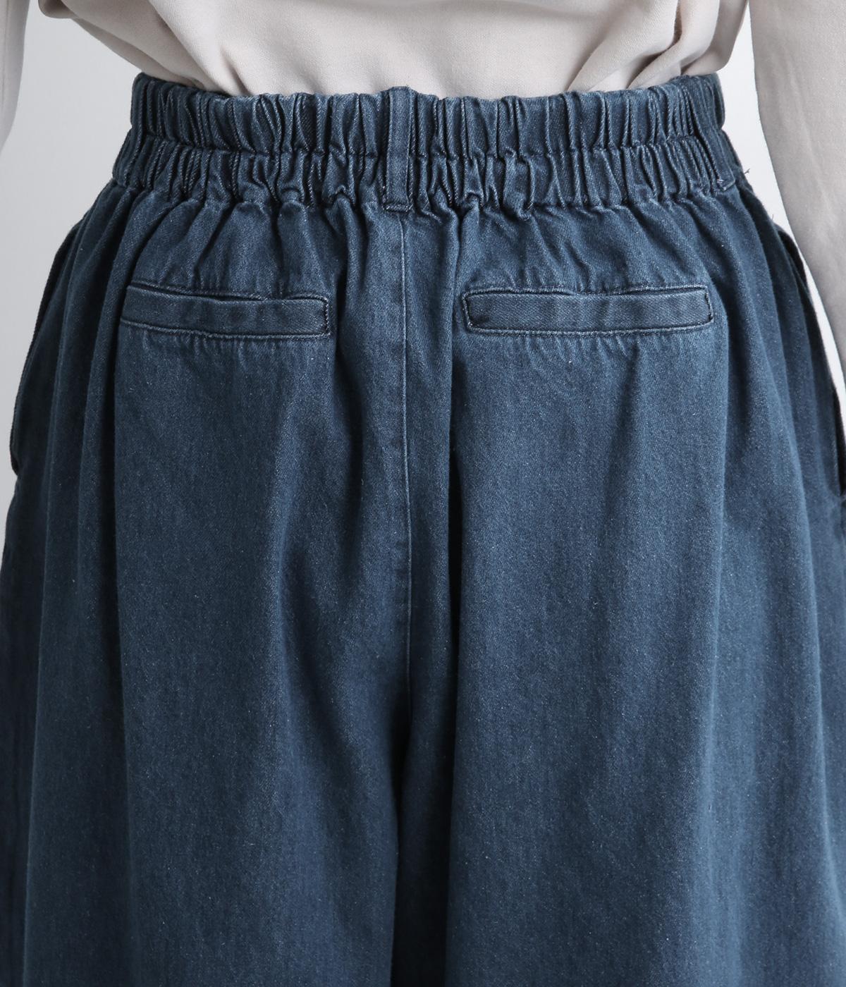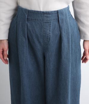 はき口からタックを入れた特徴的なデザインが定番デニムスタイルを新鮮に魅せます。脚のラインを拾いにくいゆったりとしたシルエットに後ろウエストゴム入りでリラクシーに。気負いのないカジュアルな装いに活躍。