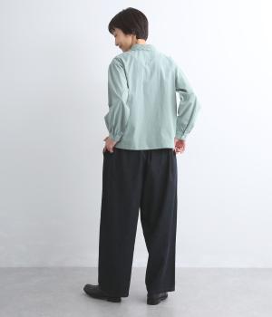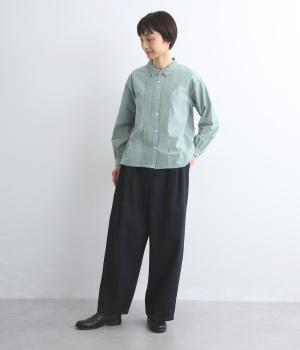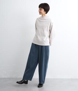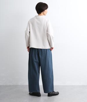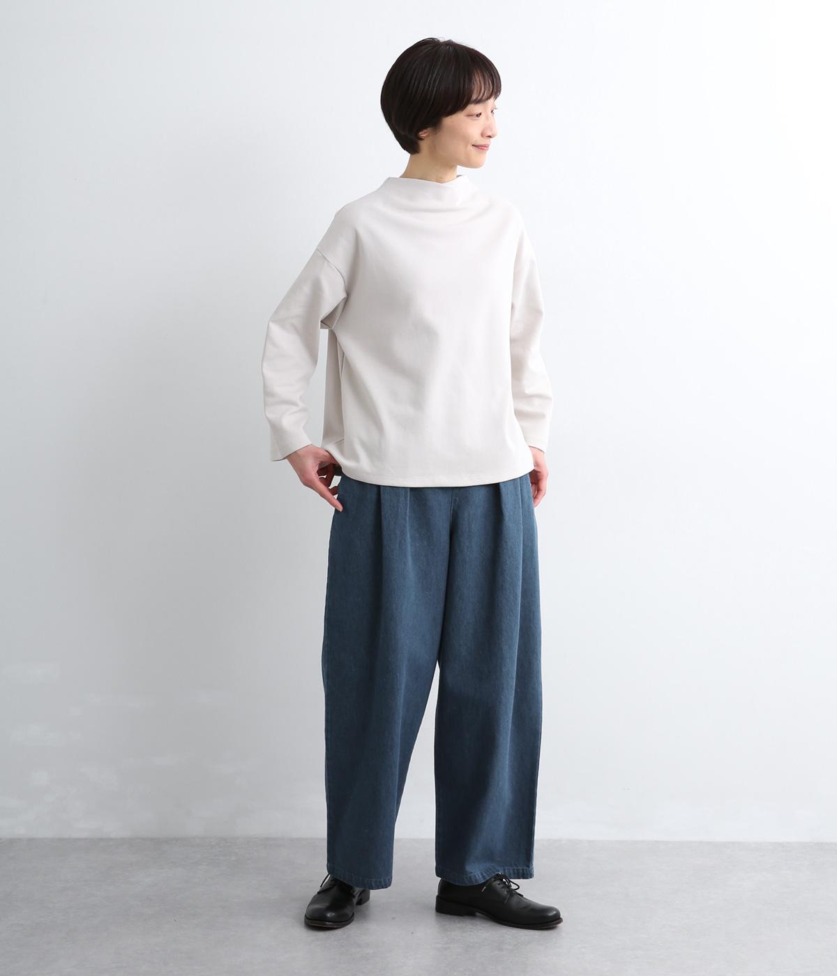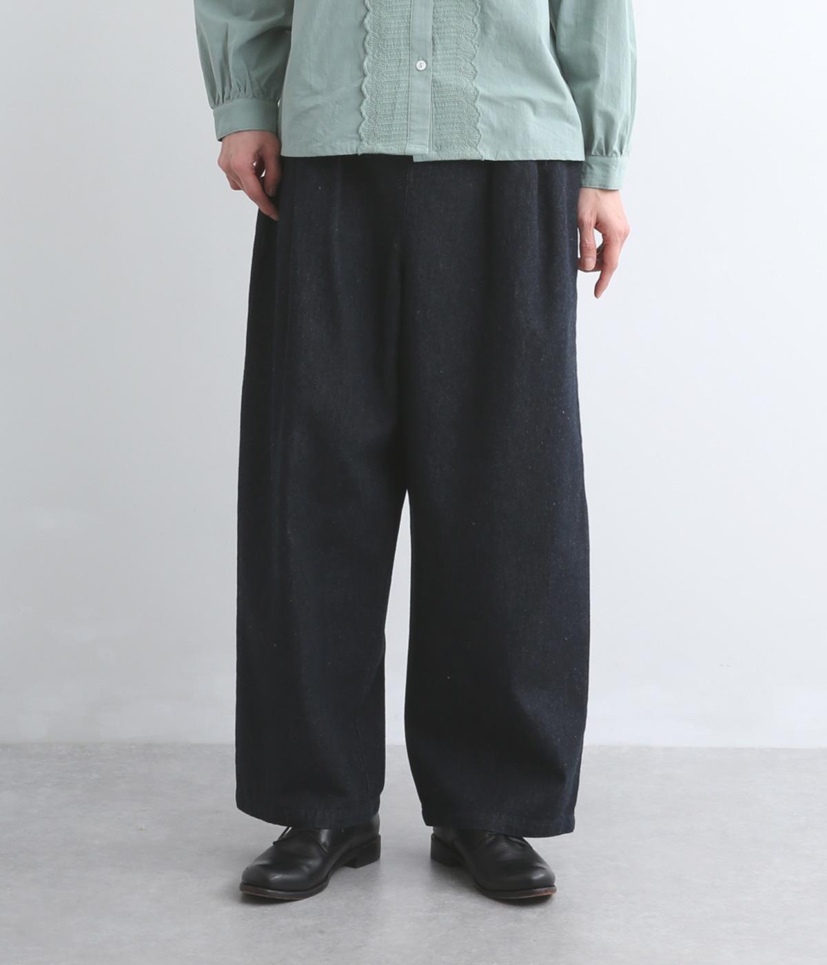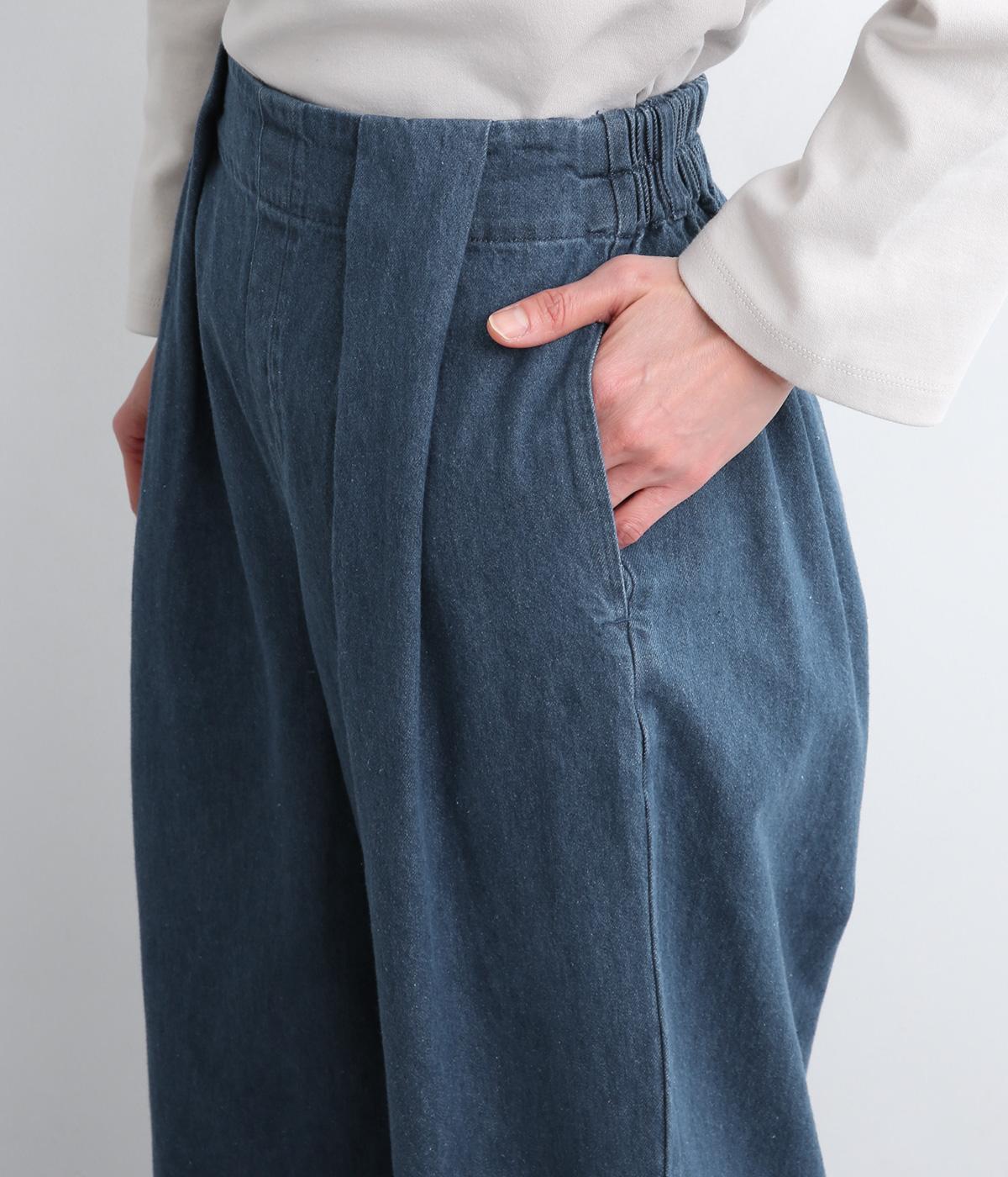 はき口からタックを入れた特徴的なデザインが定番デニムスタイルを新鮮に魅せます。脚のラインを拾いにくいゆったりとしたシルエットに後ろウエストゴム入りでリラクシーに。気負いのないカジュアルな装いに活躍。