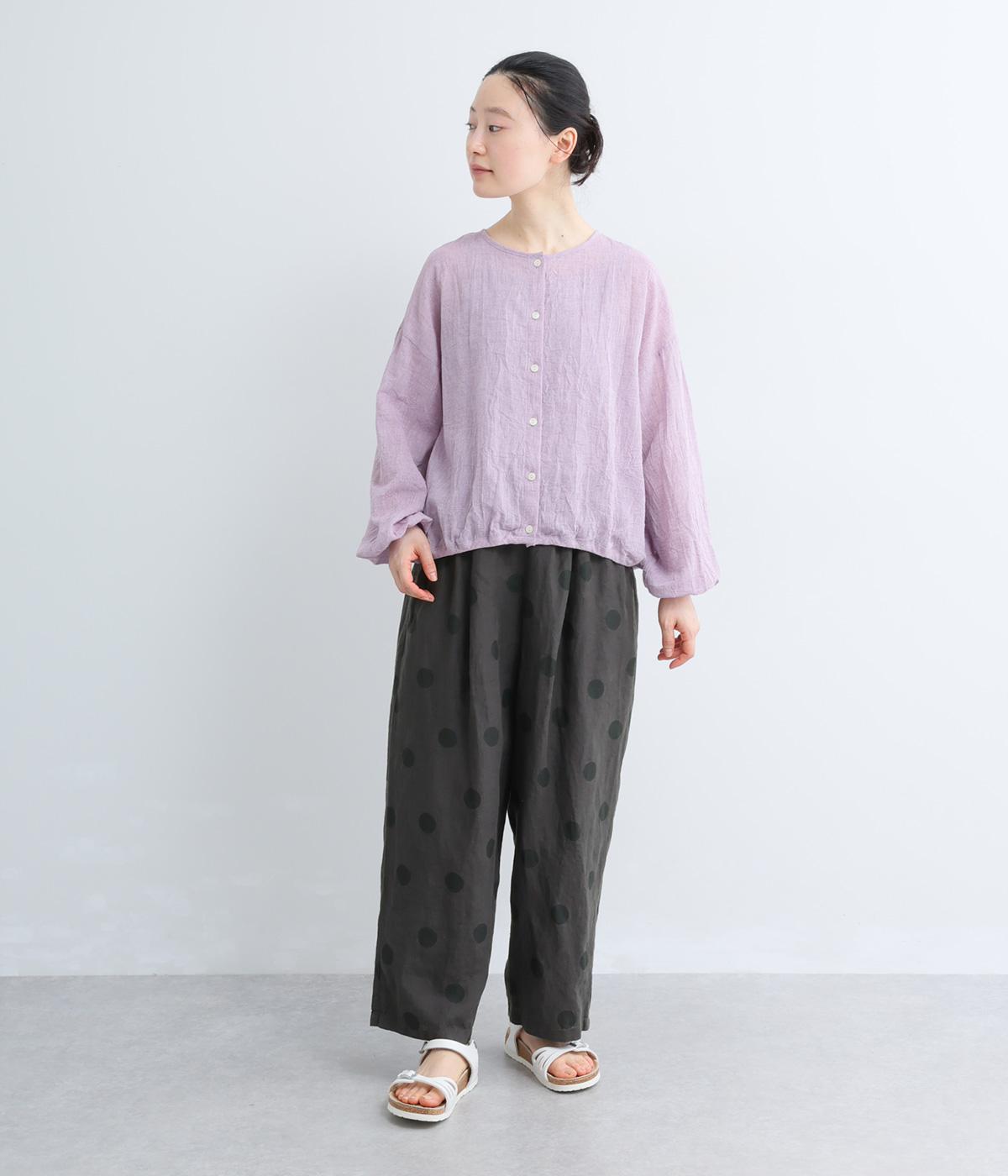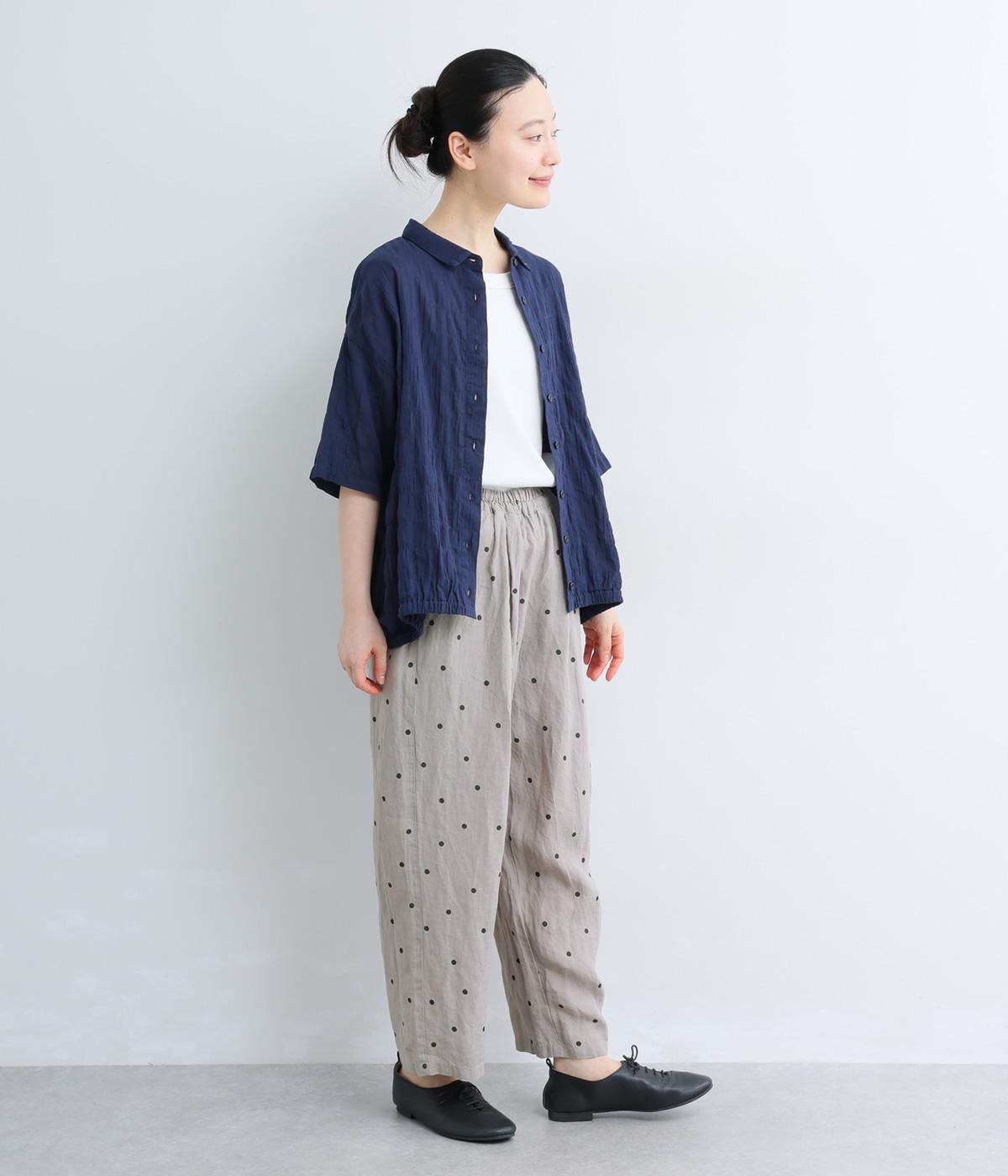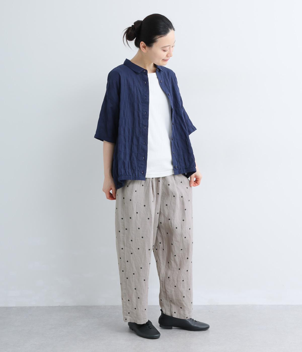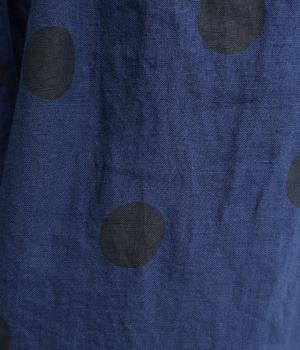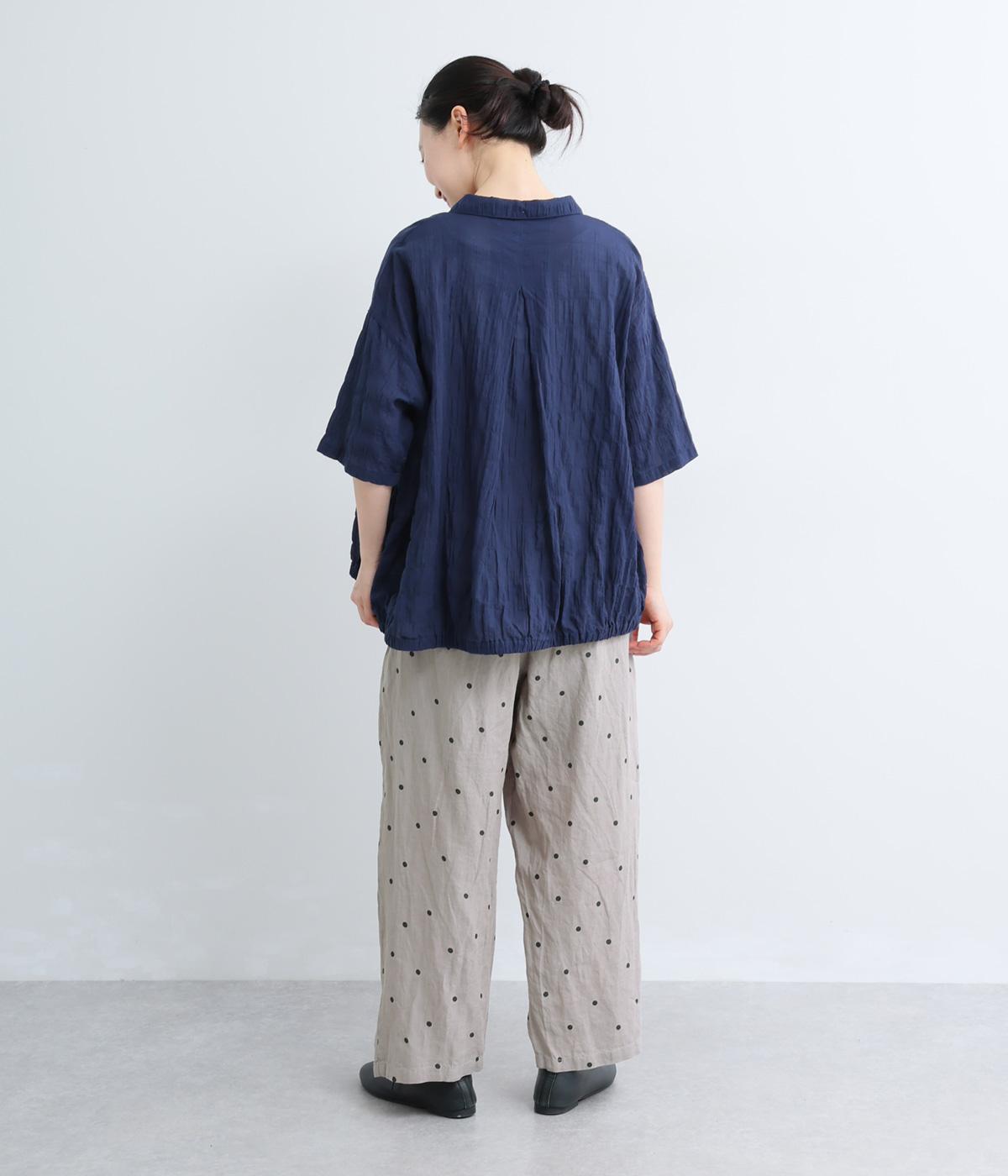 先染めコットン裾ゴム入り前あきブラウス(ネイビー)