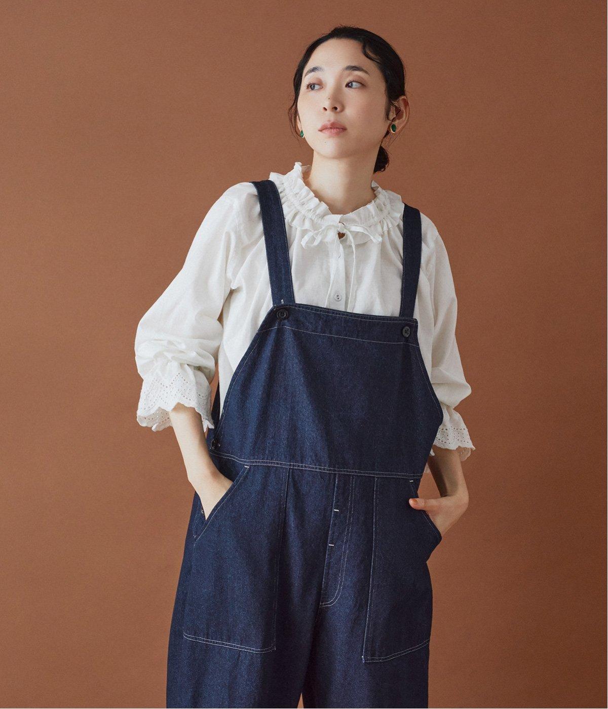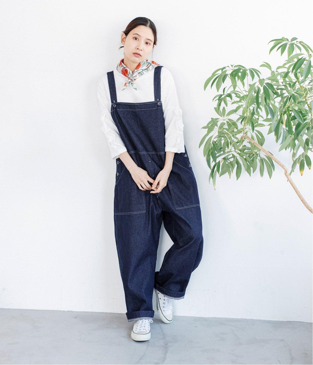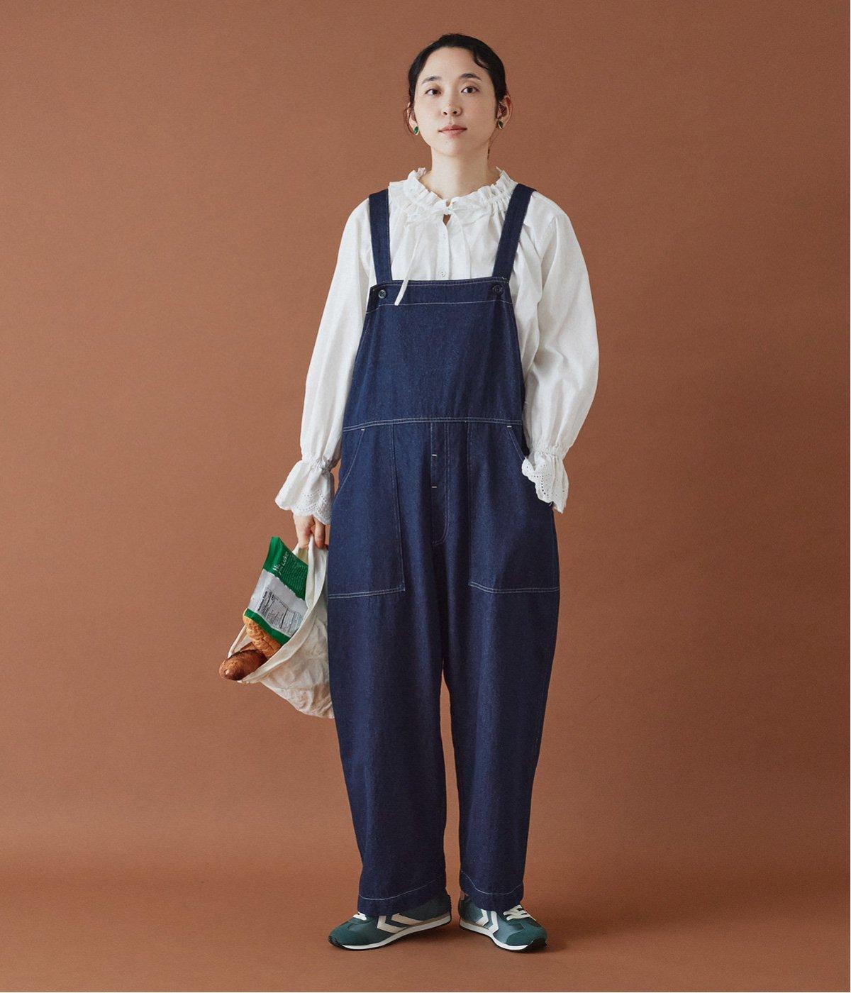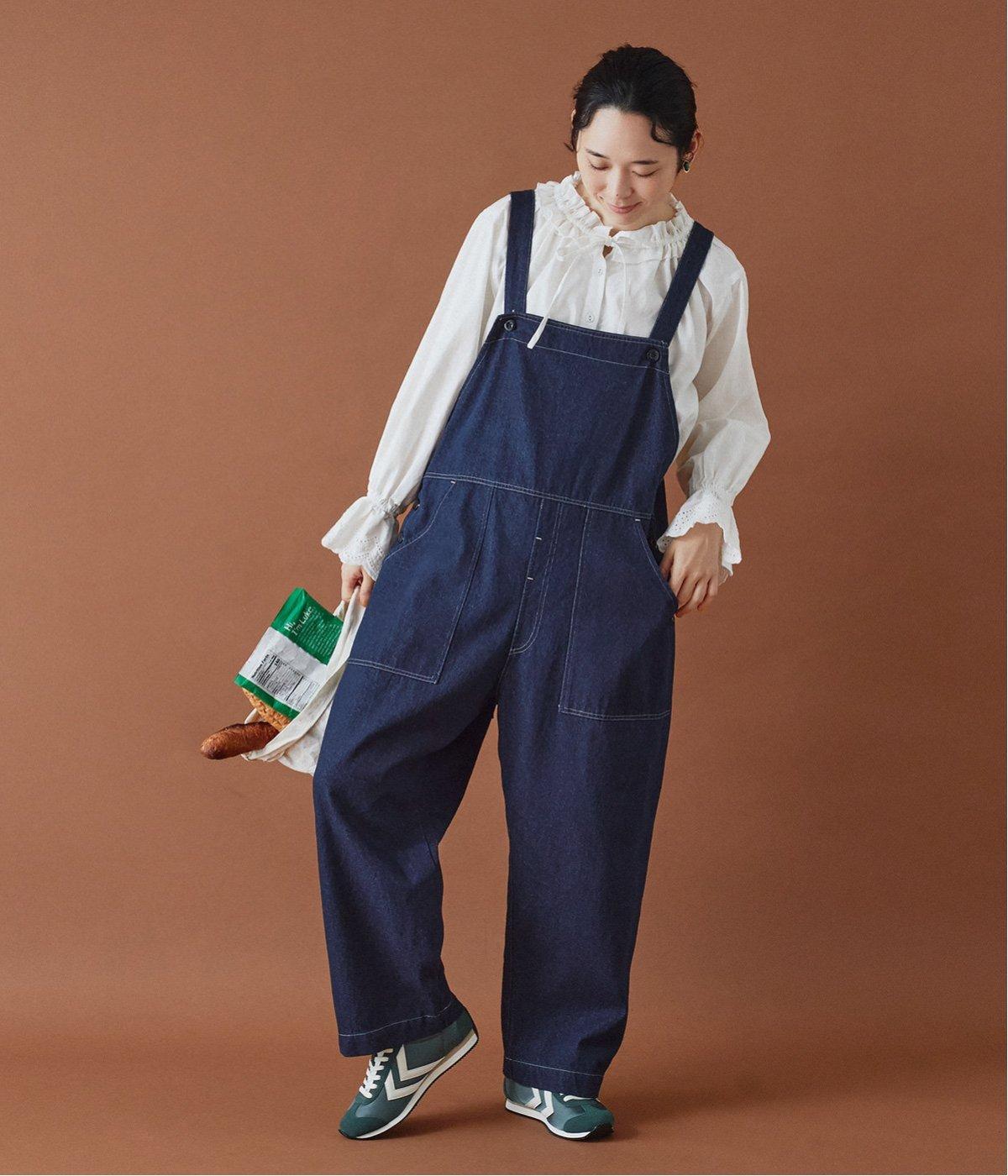 サロペットのワークテイストに、フリルブラウスの可愛げをひとさじ。ナチュラルな雰囲気とほどよい甘さのバランスが目を引く、洗練された着こなしです。