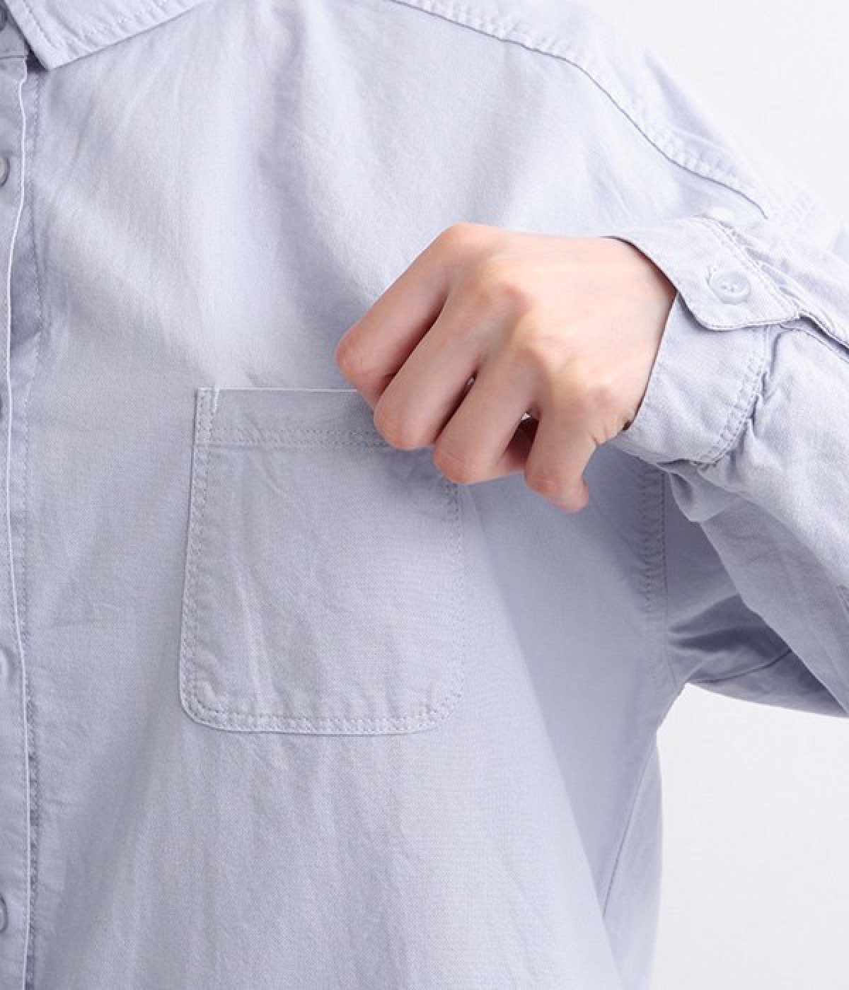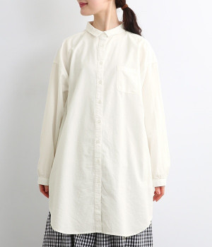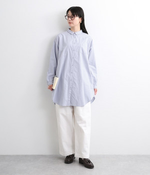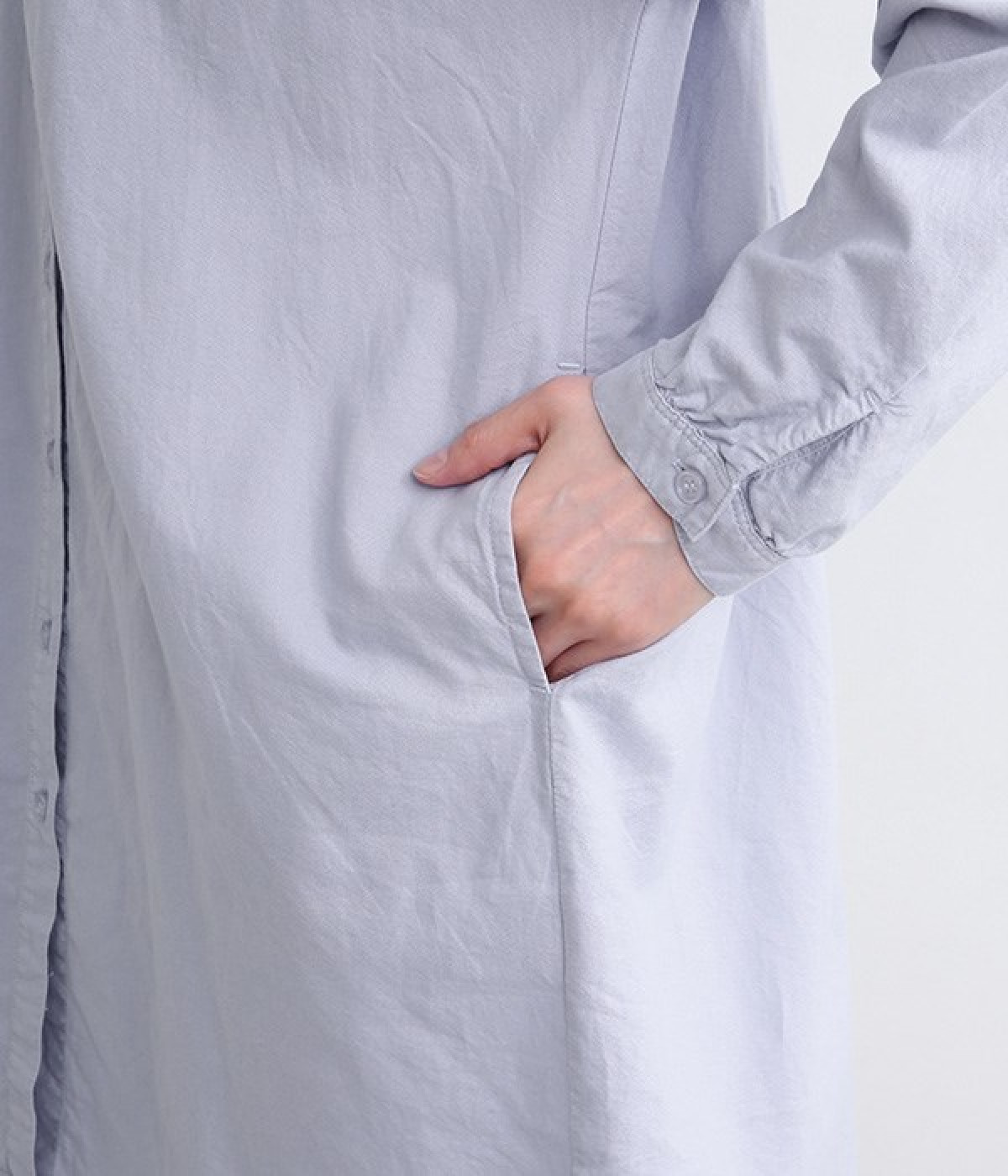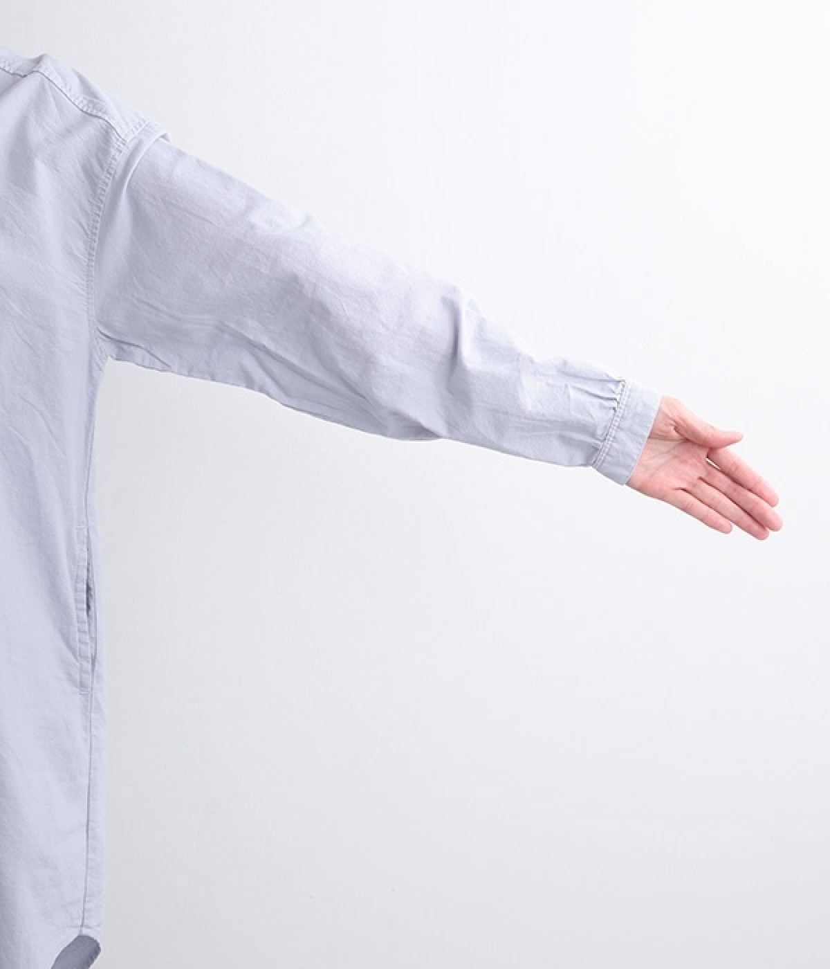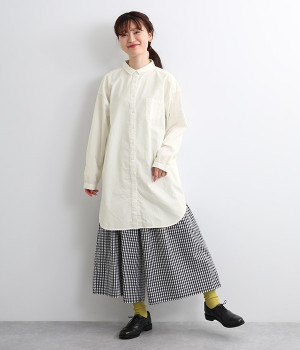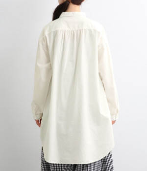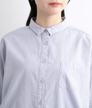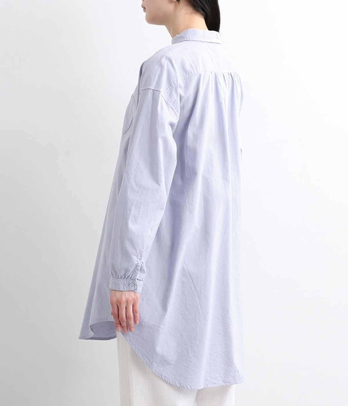 着慣れた一枚のように肌になじむ、やわらかな触り心地のシャツチュニック。縫製のあとに染めの工程を踏んでいるため1点1点の発色が異なり、色ムラやシワ感の出方に味わいを感じます。ゆるっと大きめのシルエットながら、襟つきデザインのきちんと感も併せ持ち、カジュアルに寄りすぎないのも◎。羽織りにしたり、上からトレーナーなどを重ねて裾を見せたりと着まわし方も多彩です。