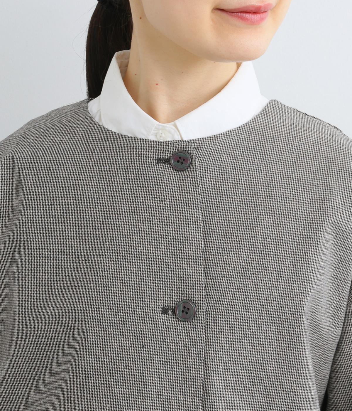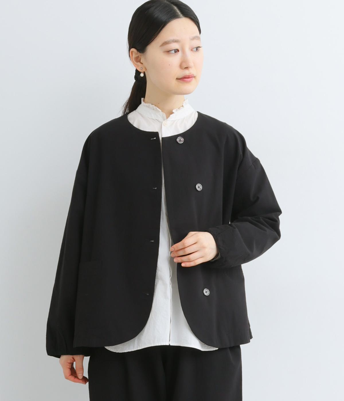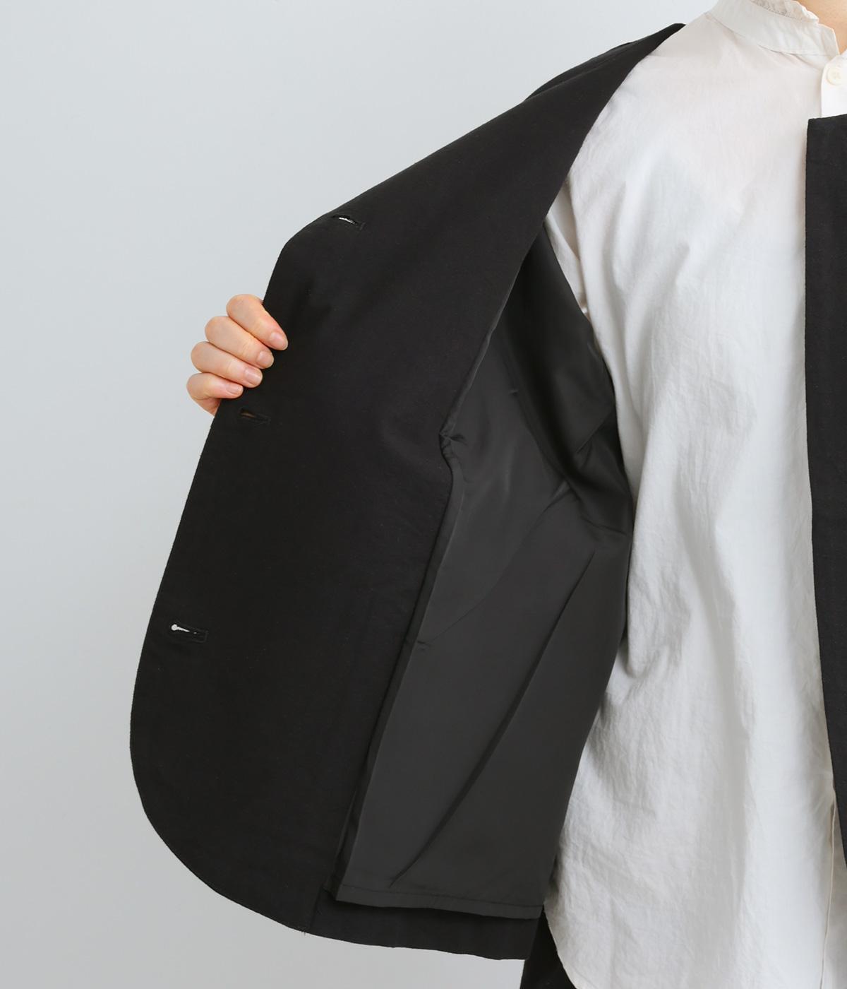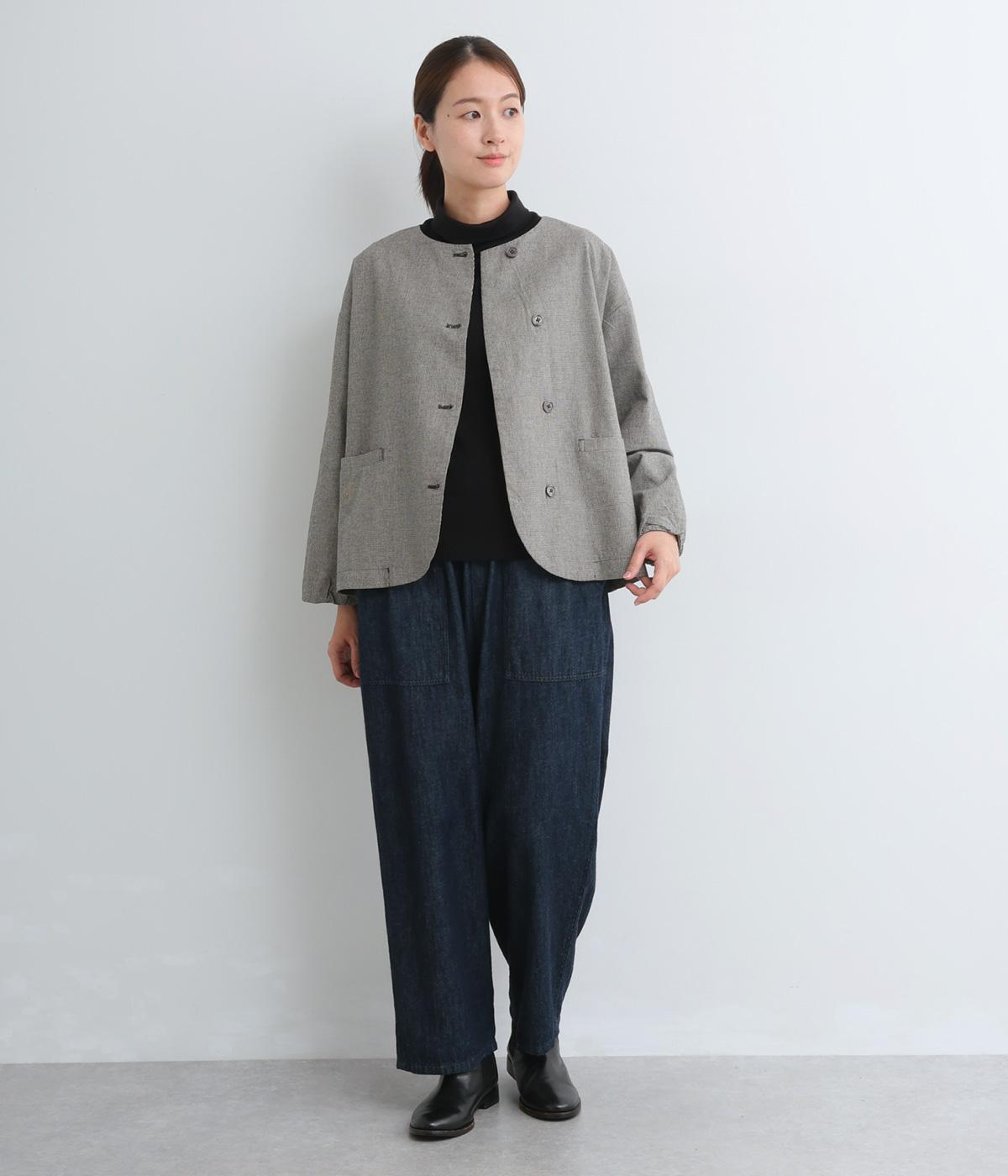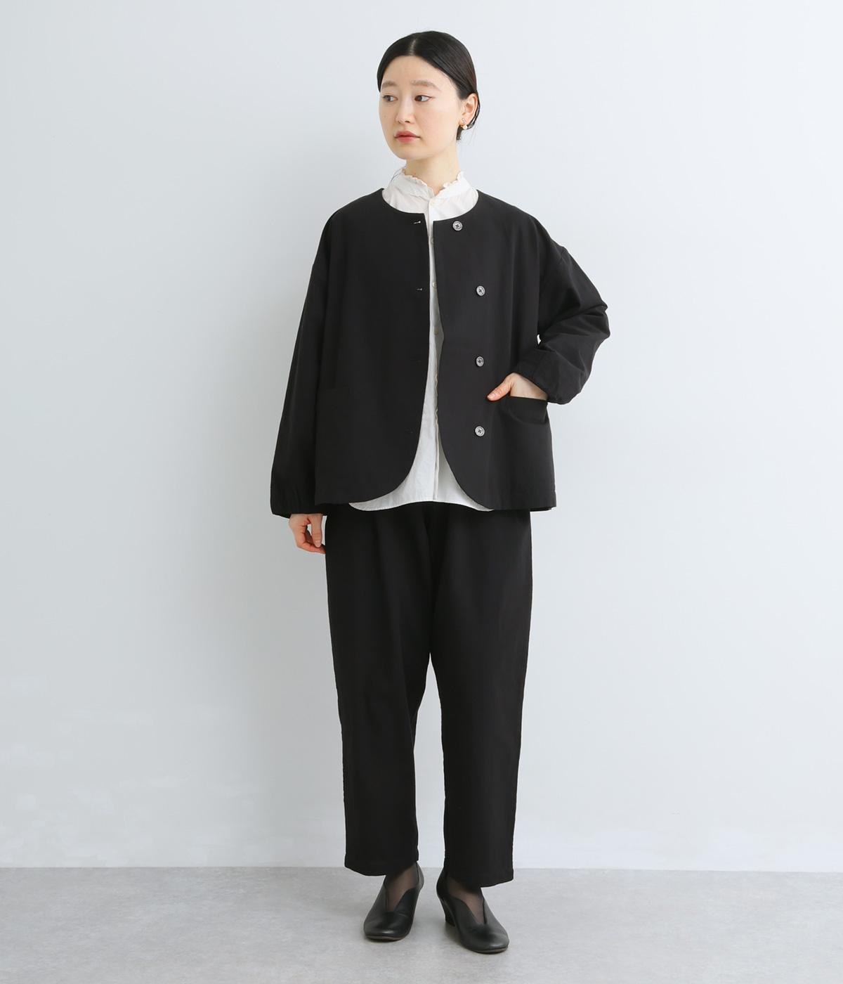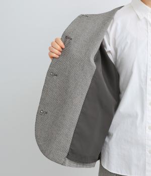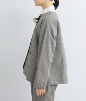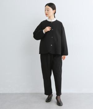 前立てから裾にかけてゆるやかにカーブさせ、きちんと感とやさしい印象を兼ね備えたジャケット。袖口もさり気なく丸みをつけて可愛らしいニュアンスを残しています。すっきりとしたノーカラーでトップス合わせもイージー。