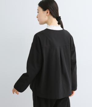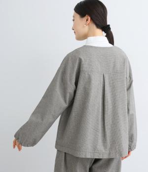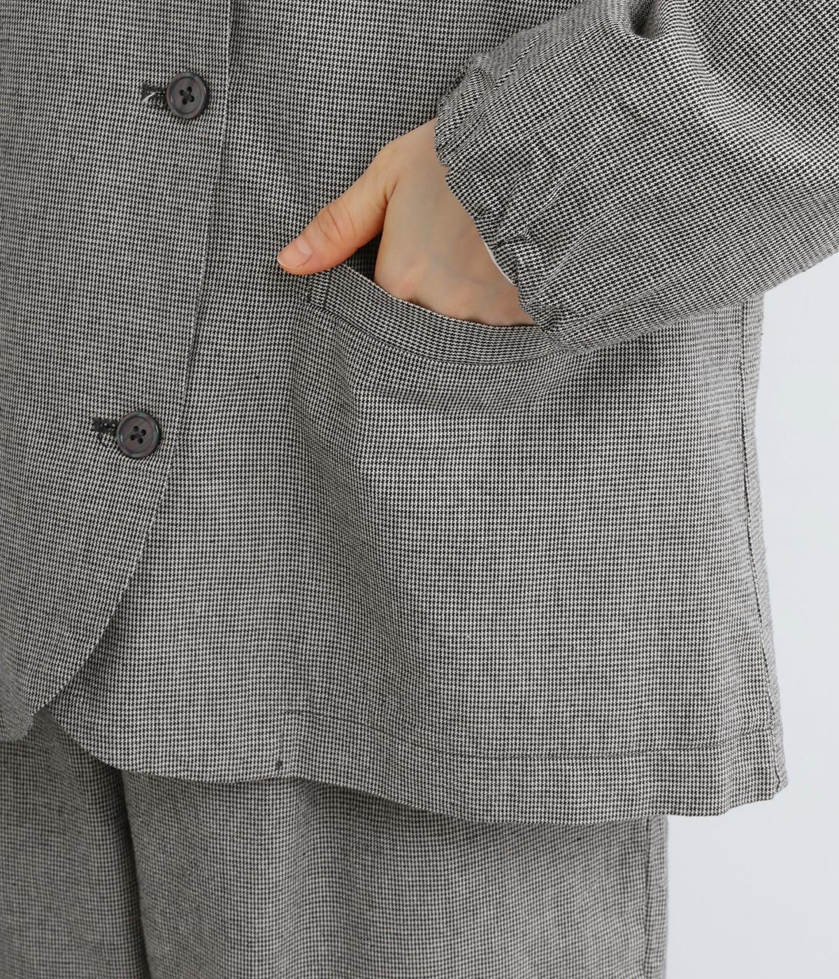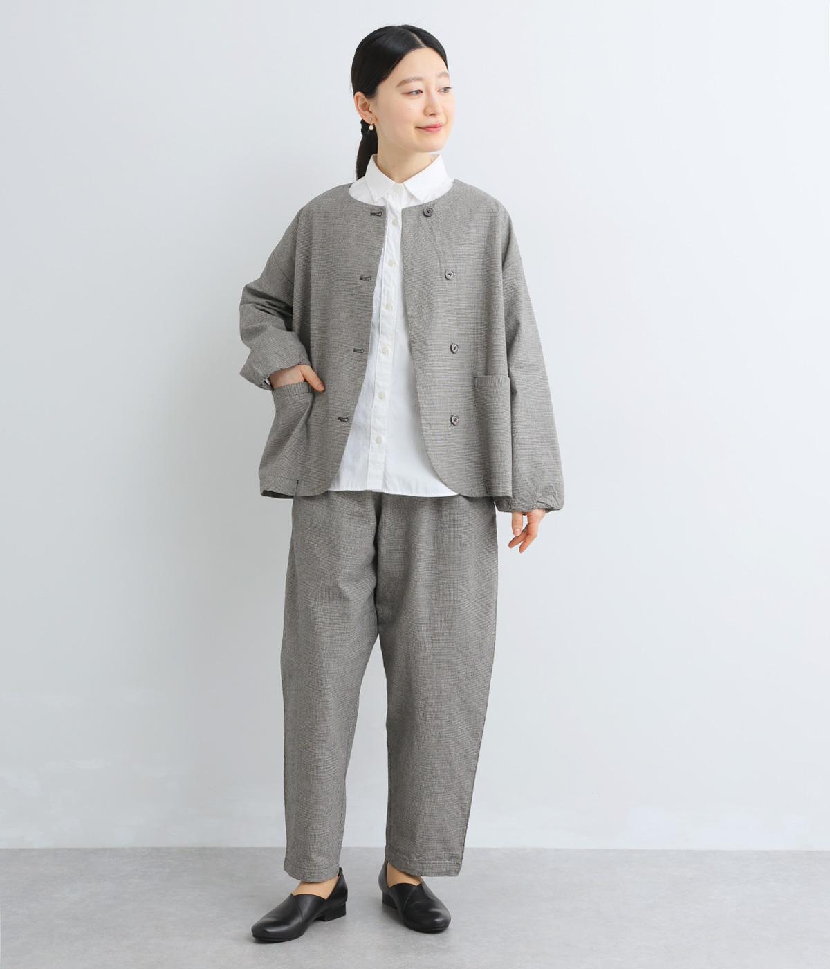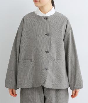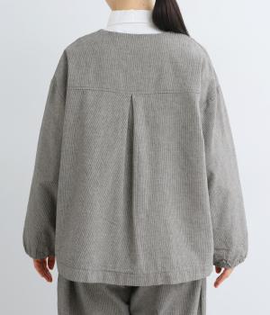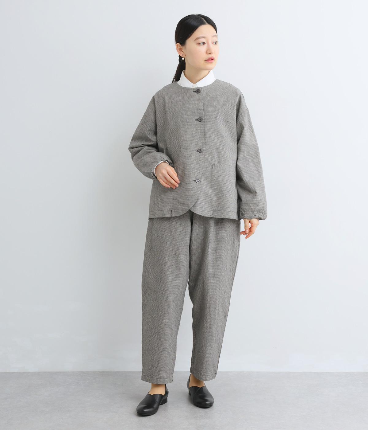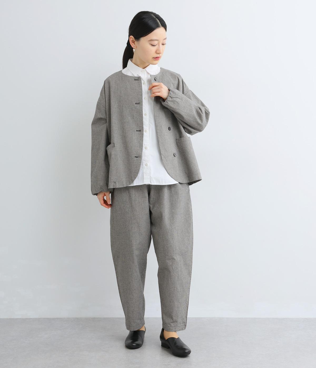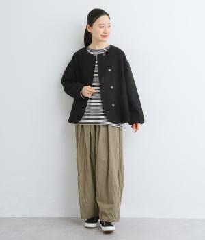 前立てから裾にかけてゆるやかにカーブさせ、きちんと感とやさしい印象を兼ね備えたジャケット。袖口もさり気なく丸みをつけて可愛らしいニュアンスを残しています。すっきりとしたノーカラーでトップス合わせもイージー。