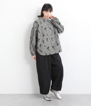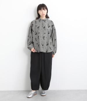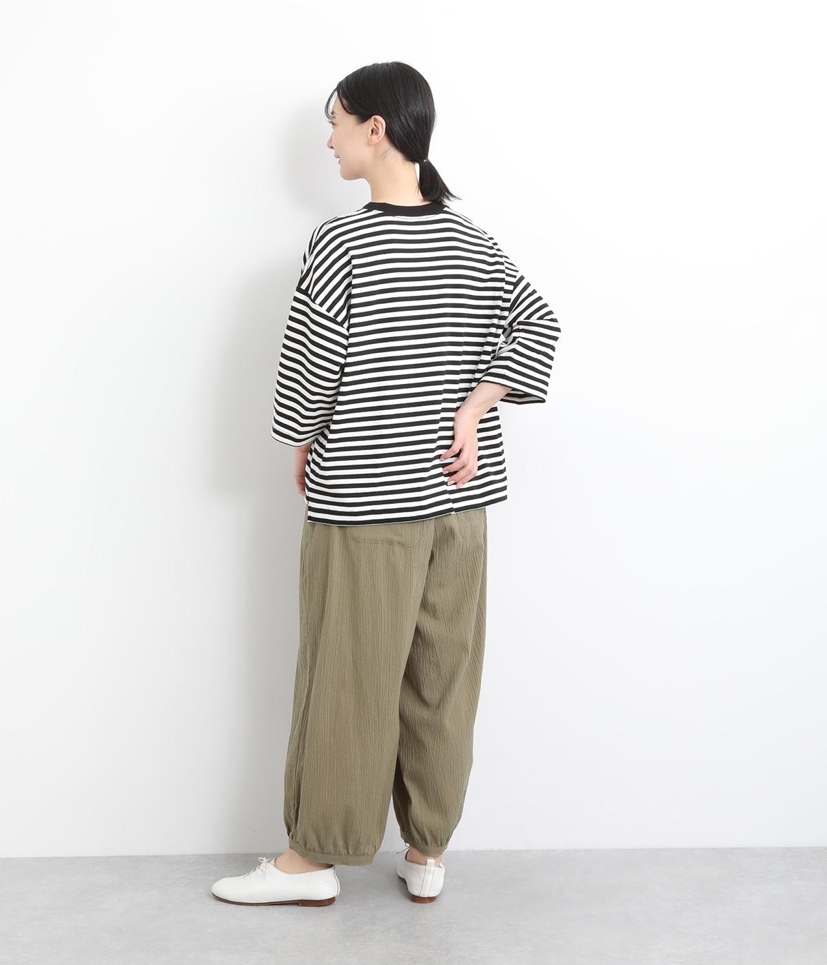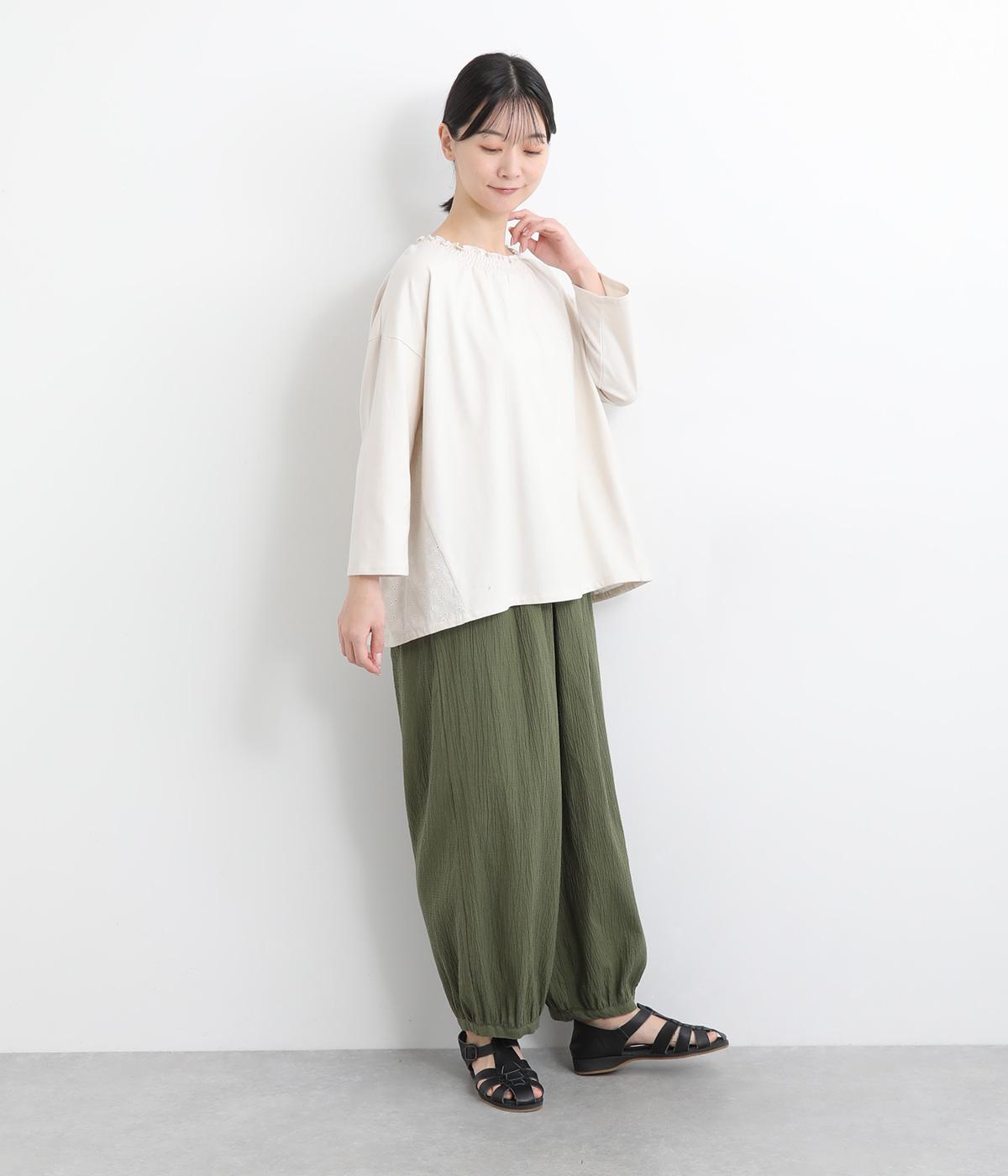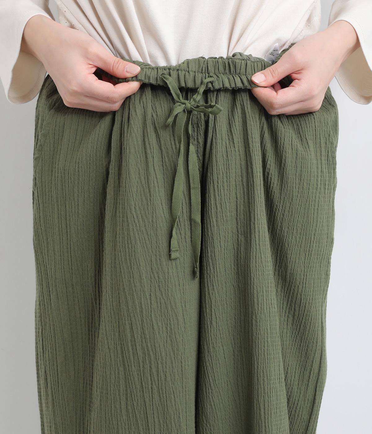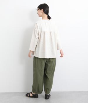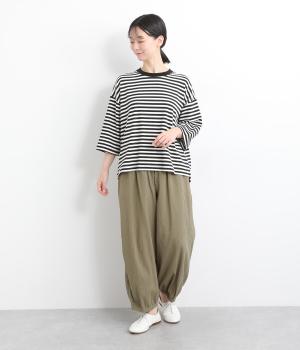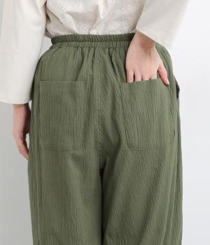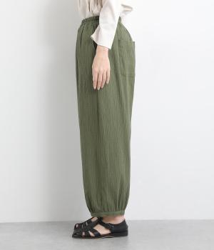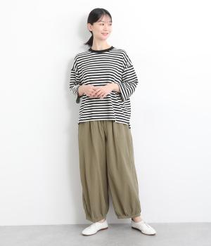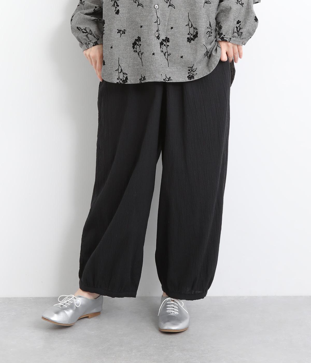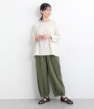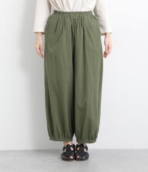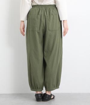 ウエストと裾にギャザーをたっぷりと入れたふんわりと丸みのあるバルーンシルエットが、足のラインをやさしくカバーしてくれるパンツです。ウエストは総ゴムで着脱も楽に。内側に通した紐で微調節も可能です。