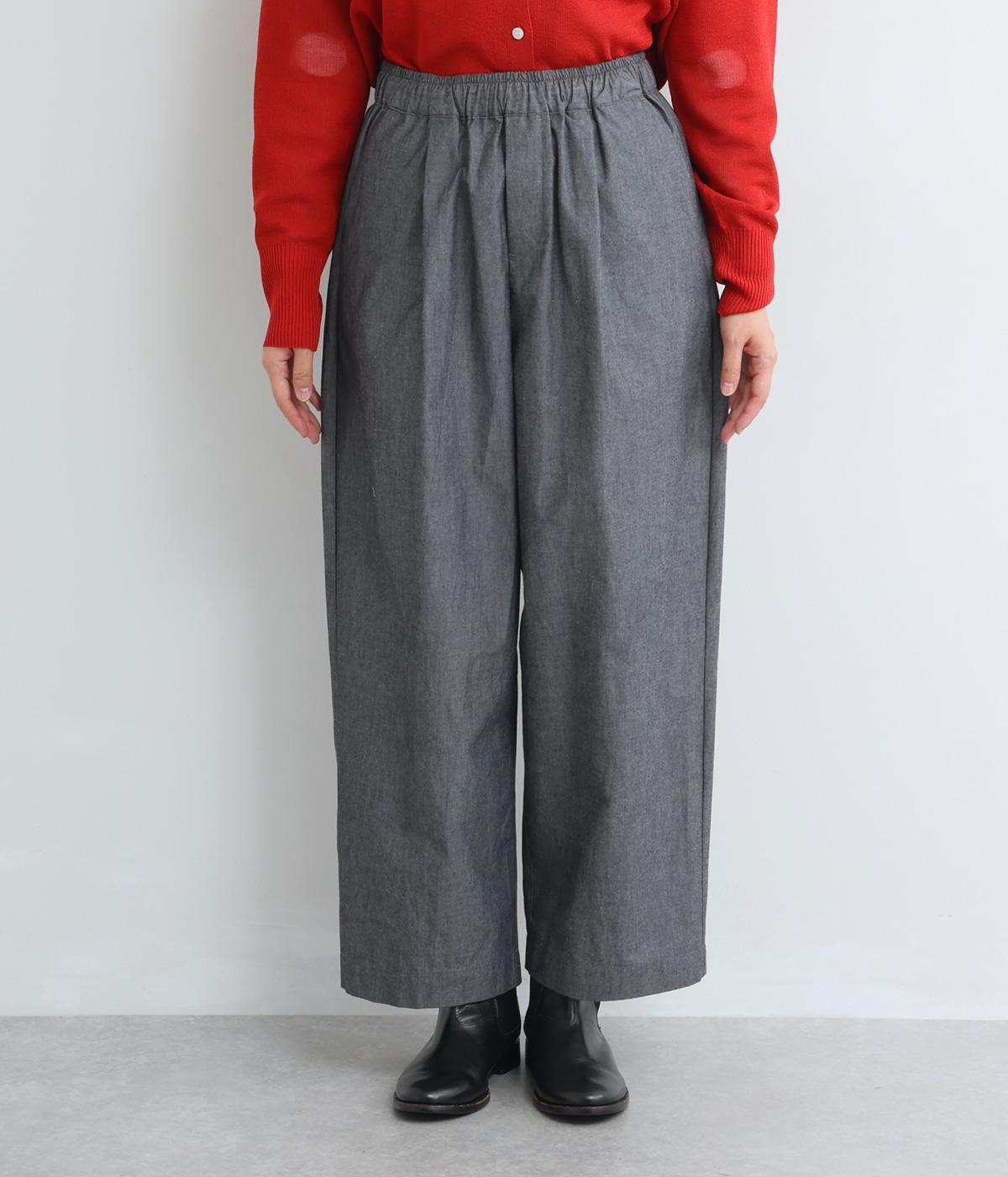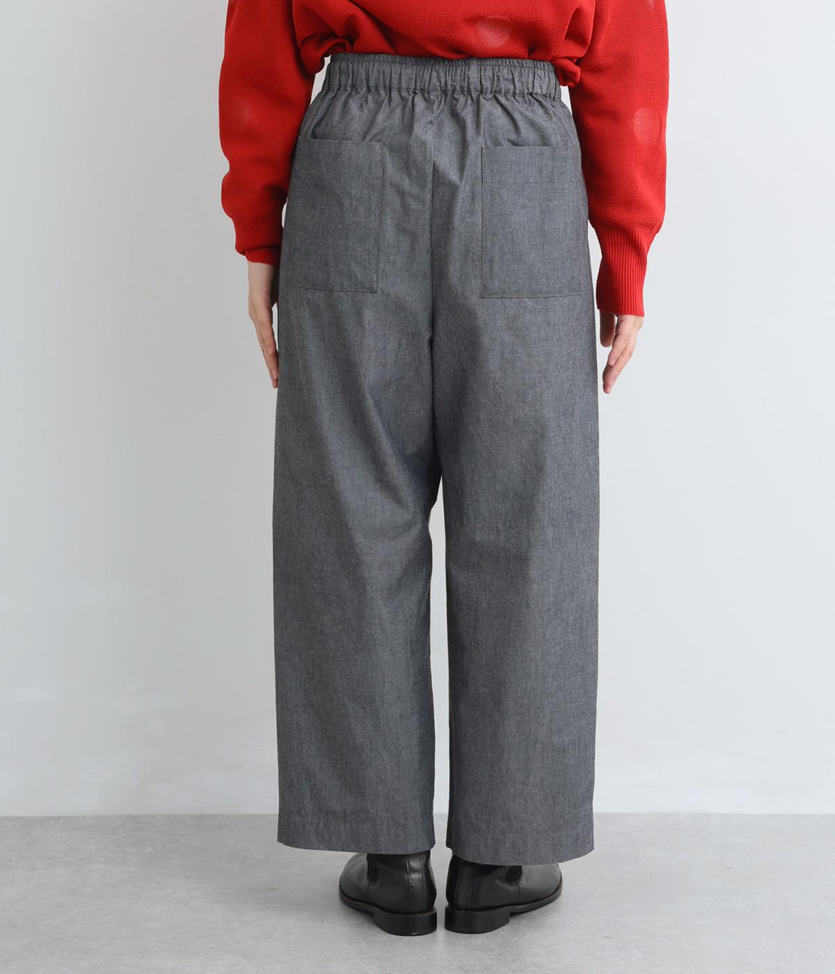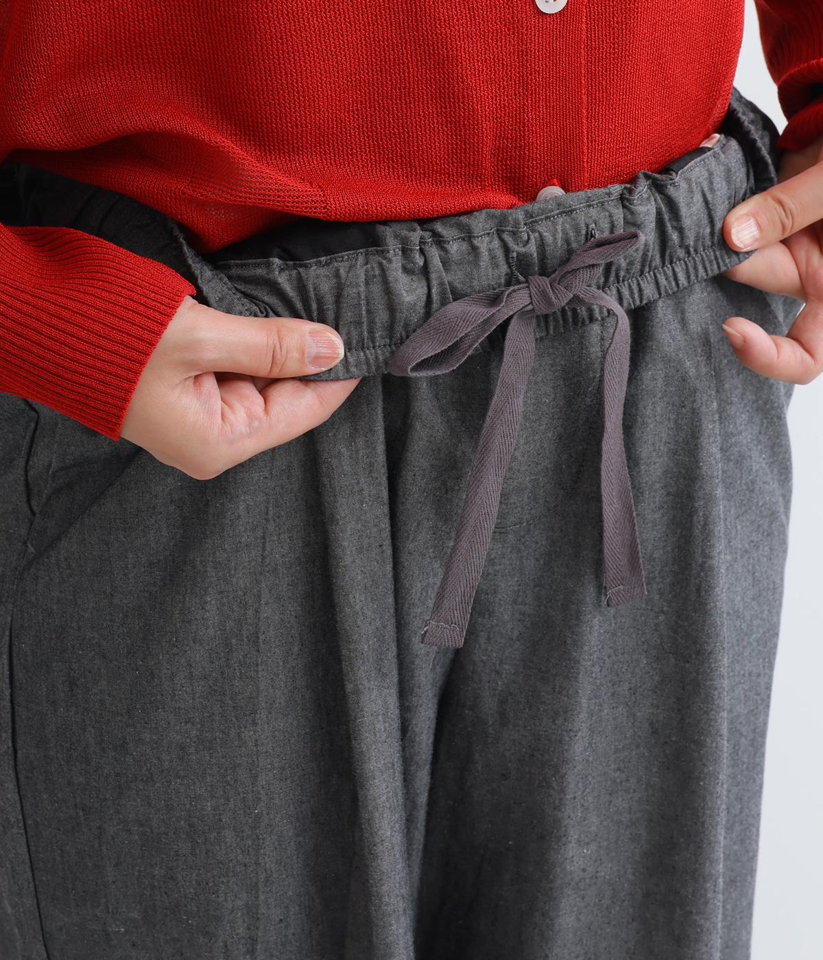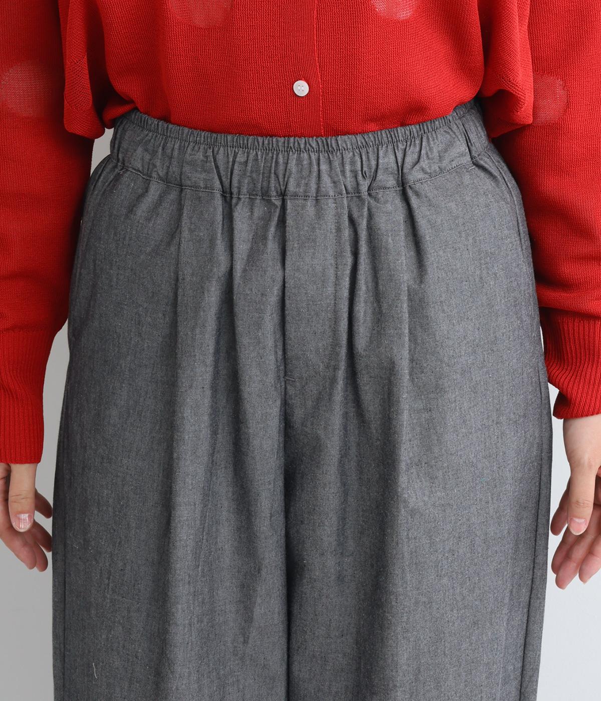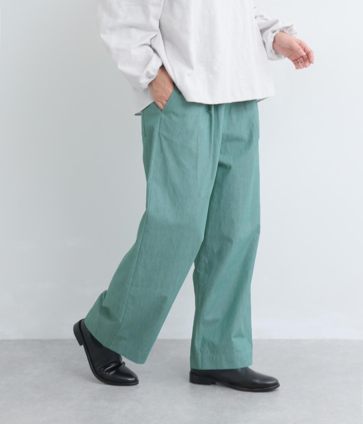 タックで適度なゆとりを確保しつつ、すっきりとしたストレートラインに仕上げました。ルーズすぎない絶妙なシルエットで、シンプルな合わせでも手抜きに見えない優秀アイテム。ウエストは総ゴムではき心地が良く、内紐入りです。