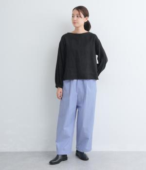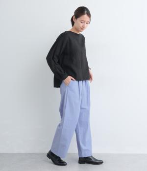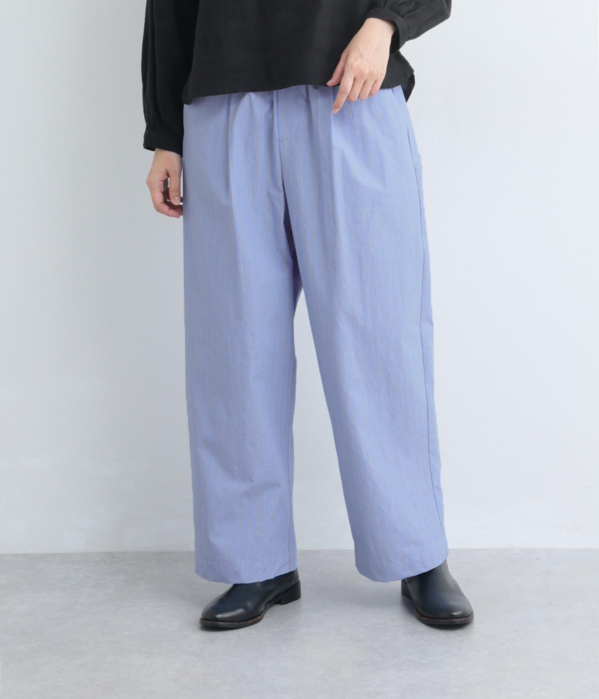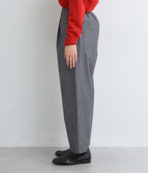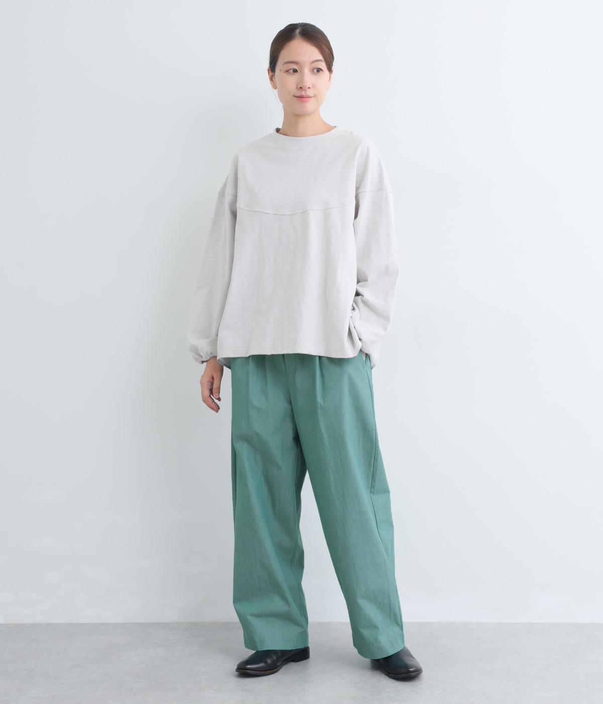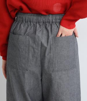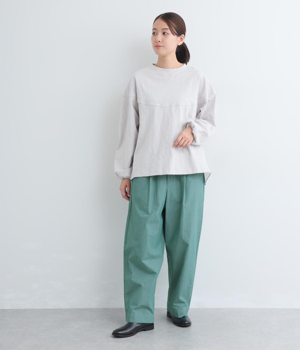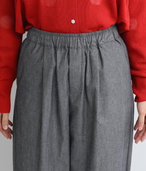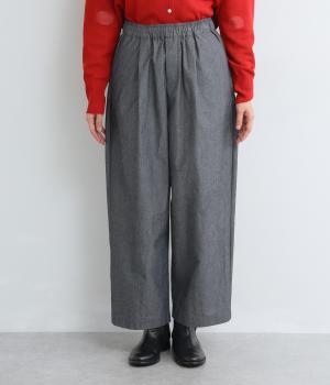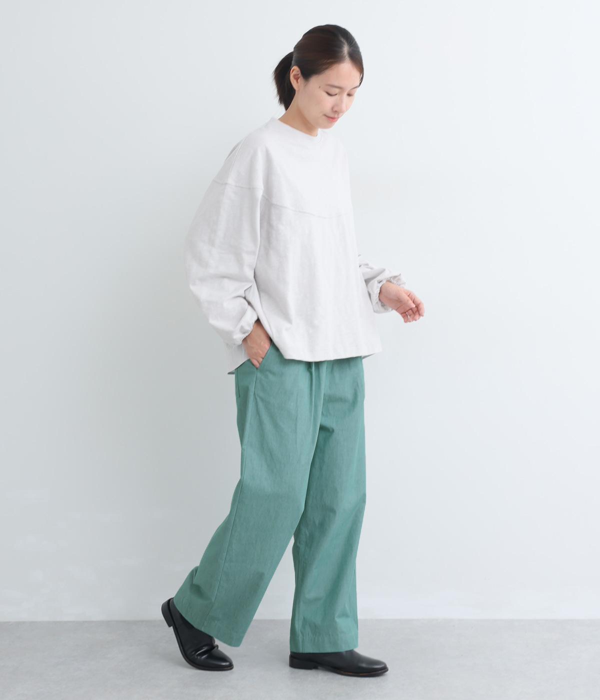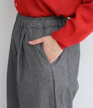 タックで適度なゆとりを確保しつつ、すっきりとしたストレートラインに仕上げました。ルーズすぎない絶妙なシルエットで、シンプルな合わせでも手抜きに見えない優秀アイテム。ウエストは総ゴムではき心地が良く、内紐入りです。