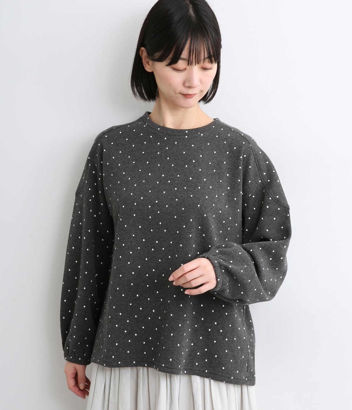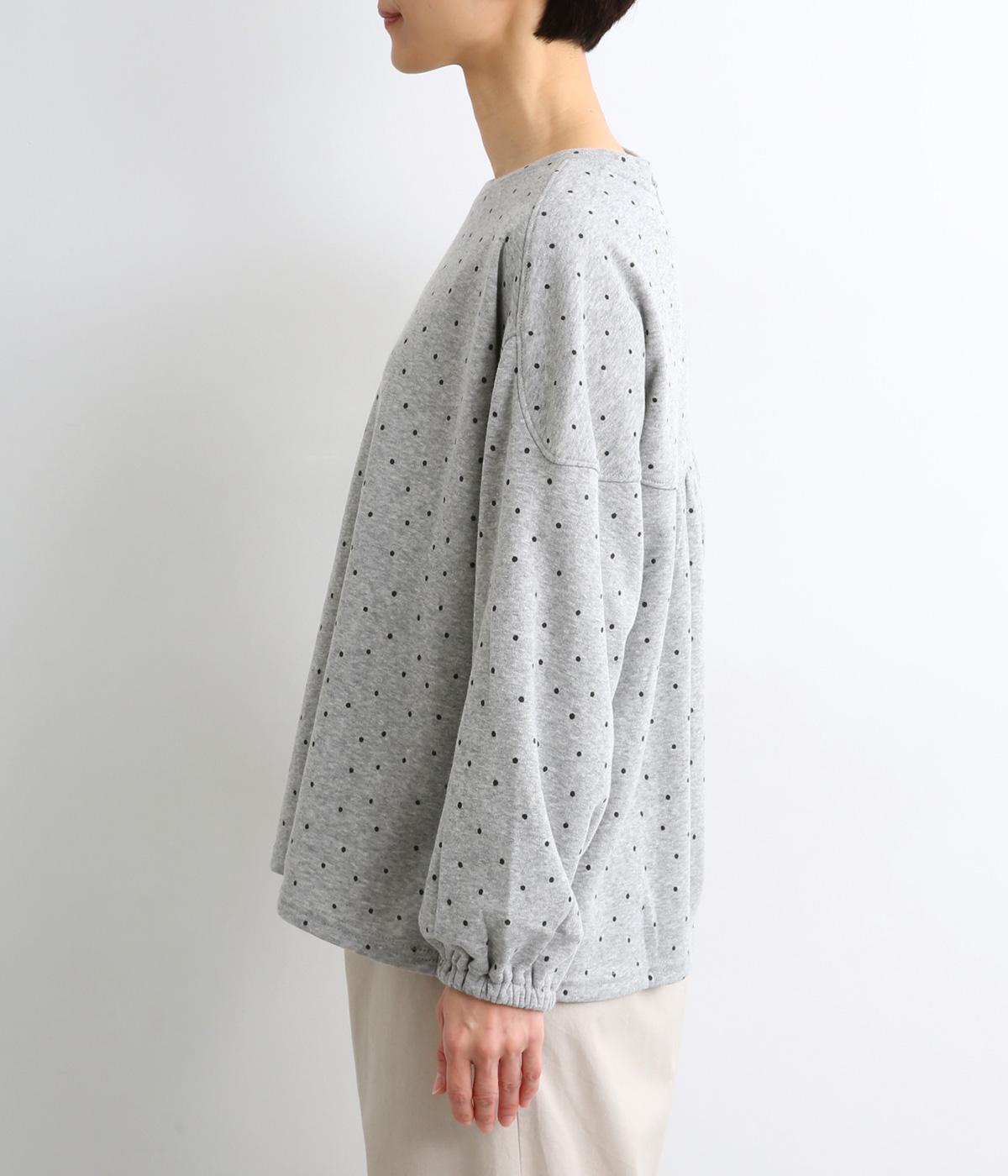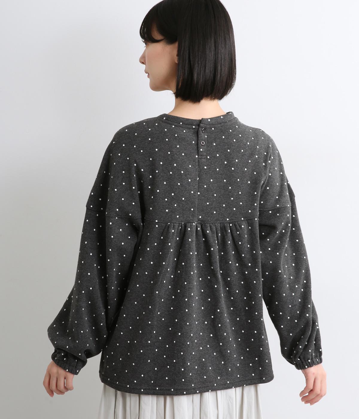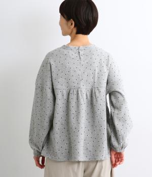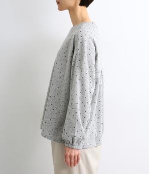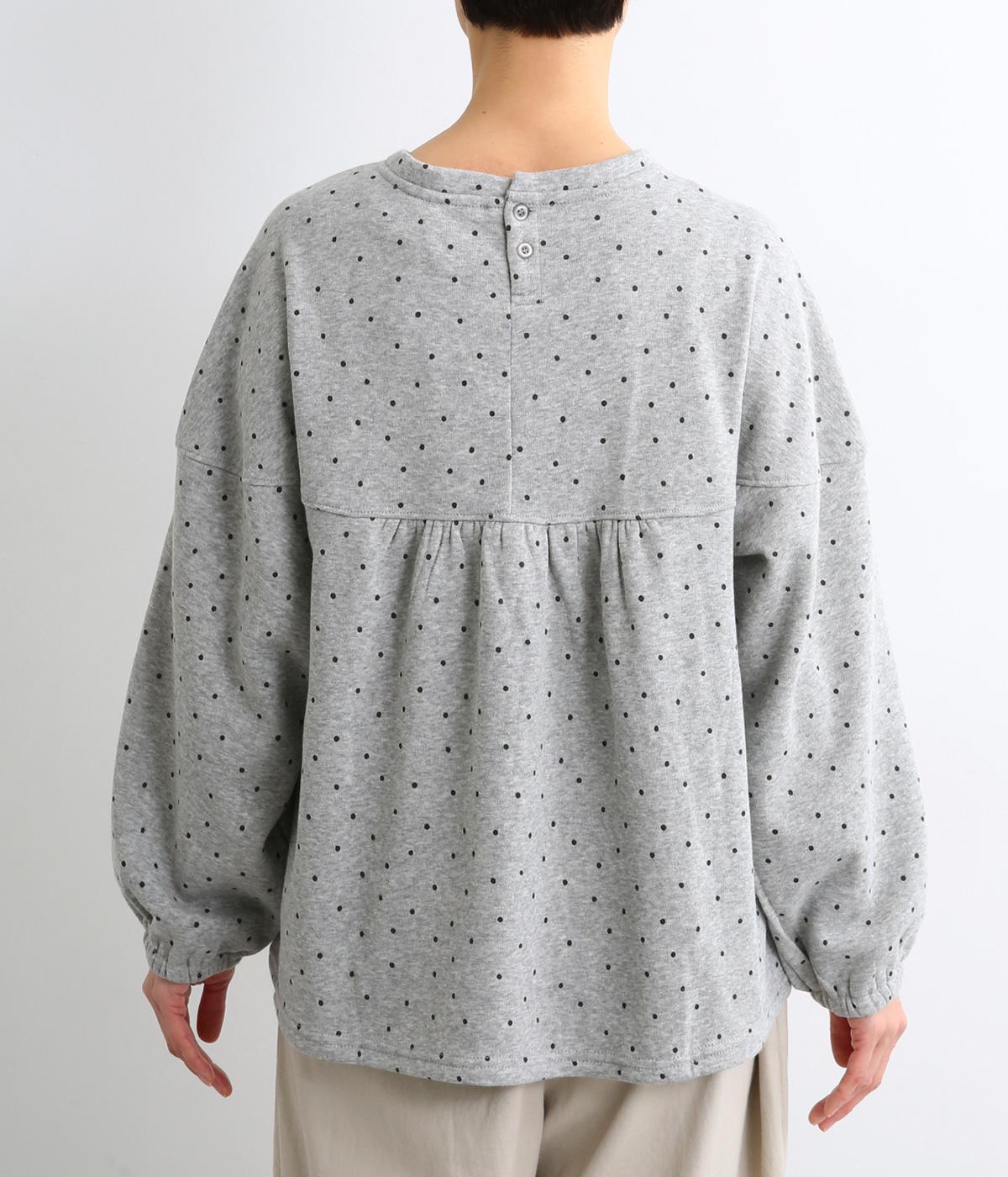 モノトーンのドットプリントが大人かわいいプルオーバー。後ろの切り替えギャザーや肩ヨークでさり気なくデザイン性を加えています。フィットしすぎないシルエットが心地よく、袖口ゴム仕様なのでたくし上げもイージー。