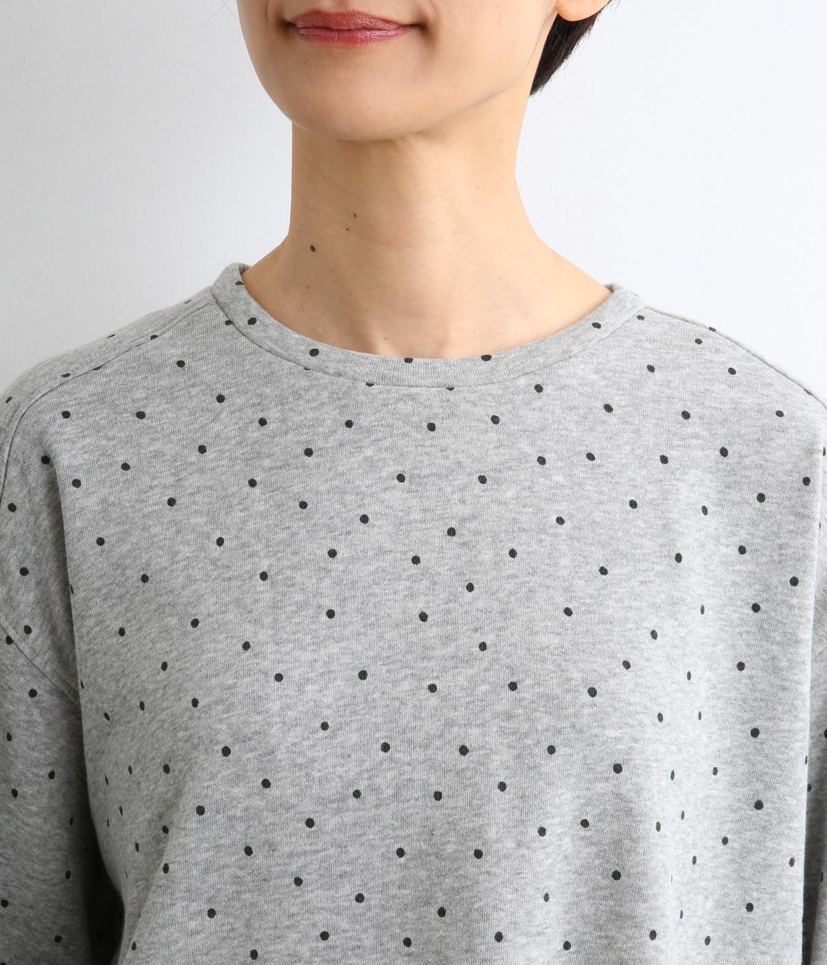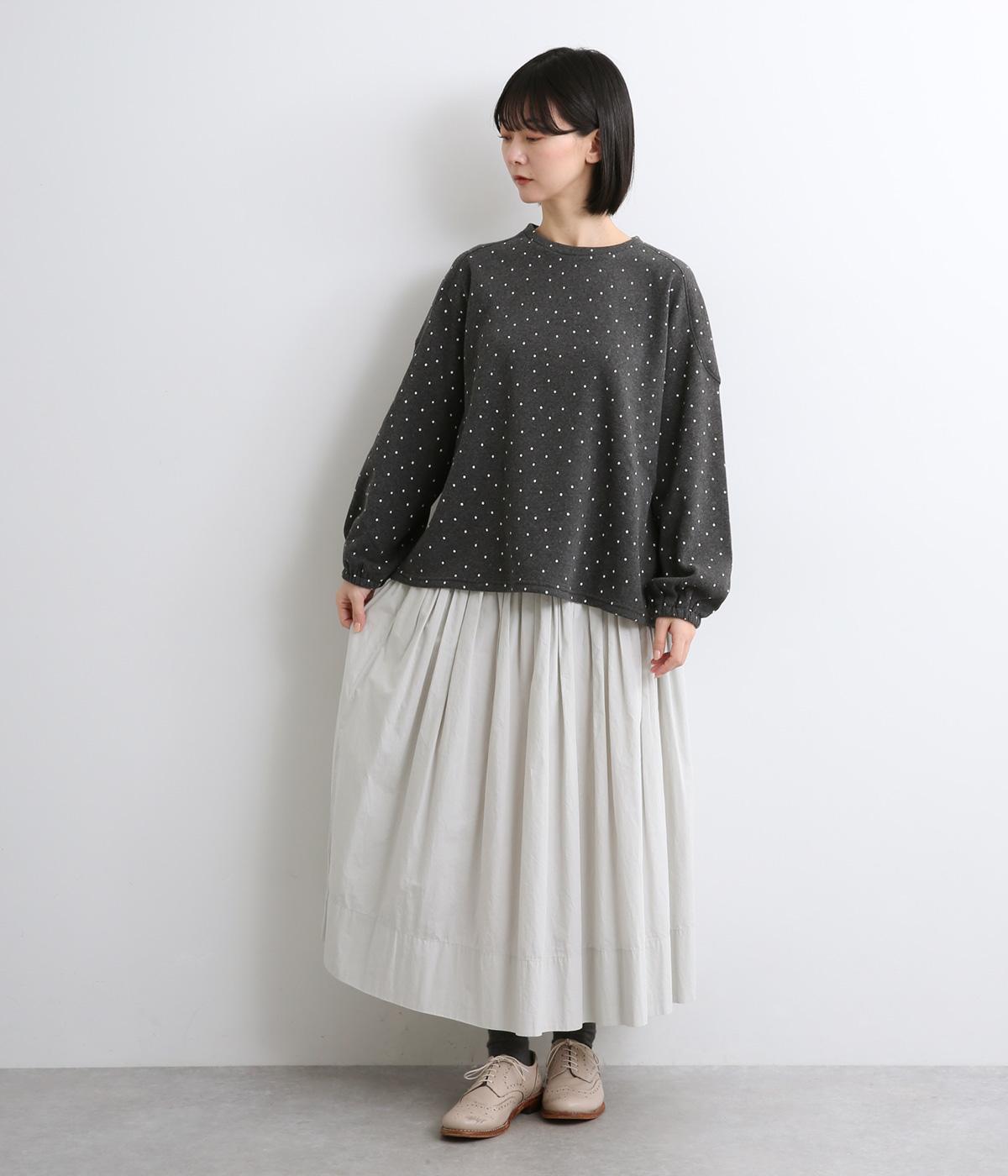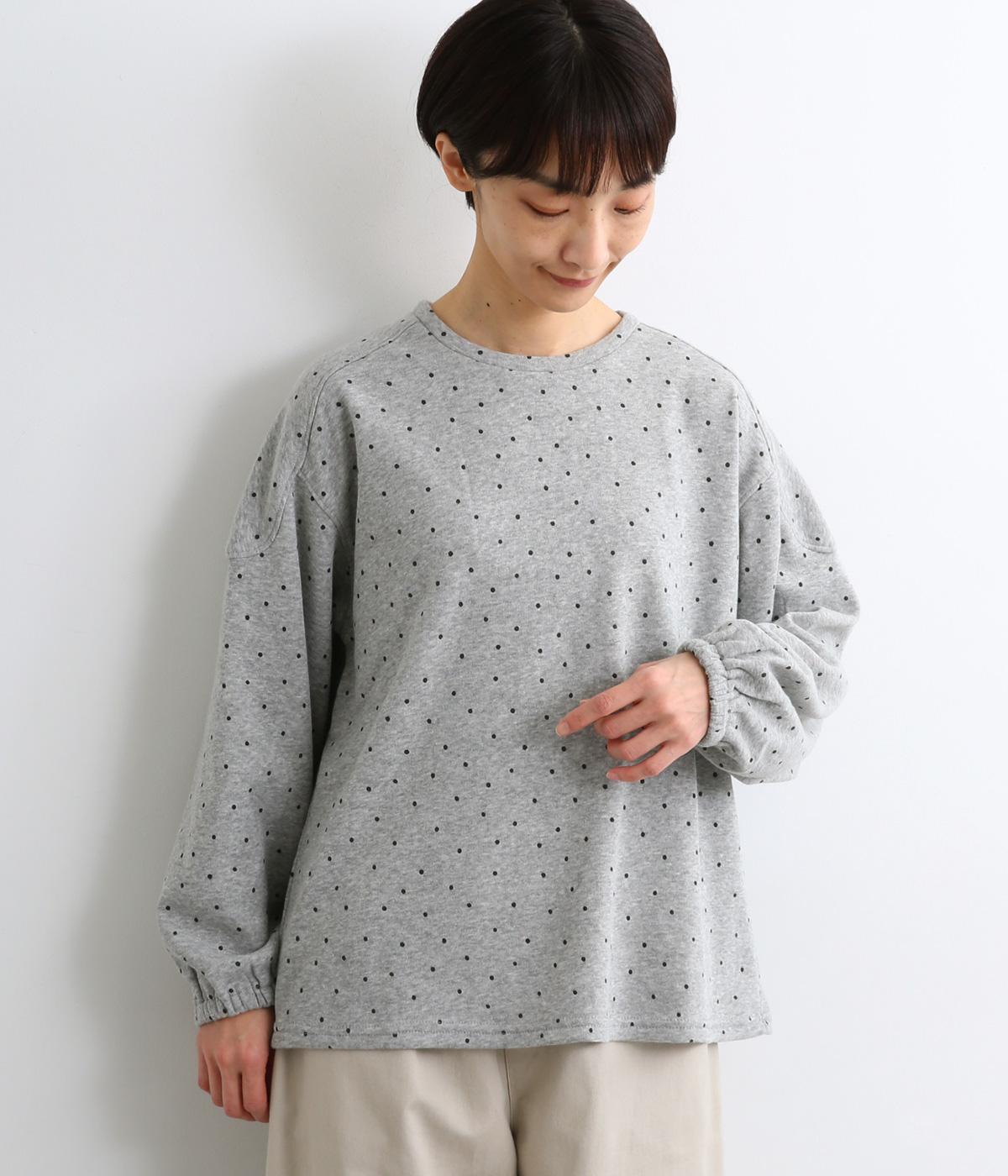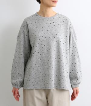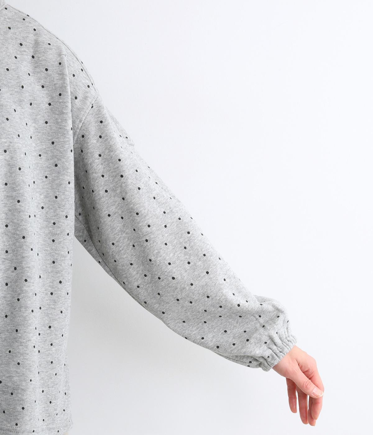 モノトーンのドットプリントが大人かわいいプルオーバー。後ろの切り替えギャザーや肩ヨークでさり気なくデザイン性を加えています。フィットしすぎないシルエットが心地よく、袖口ゴム仕様なのでたくし上げもイージー。