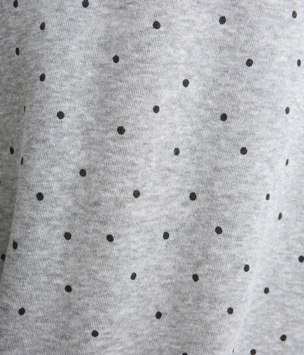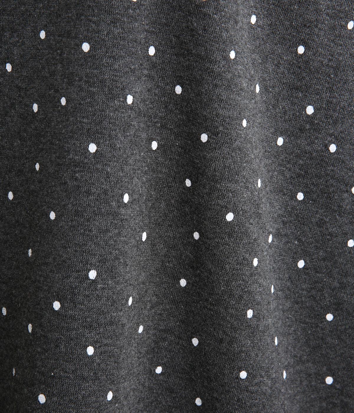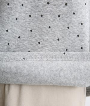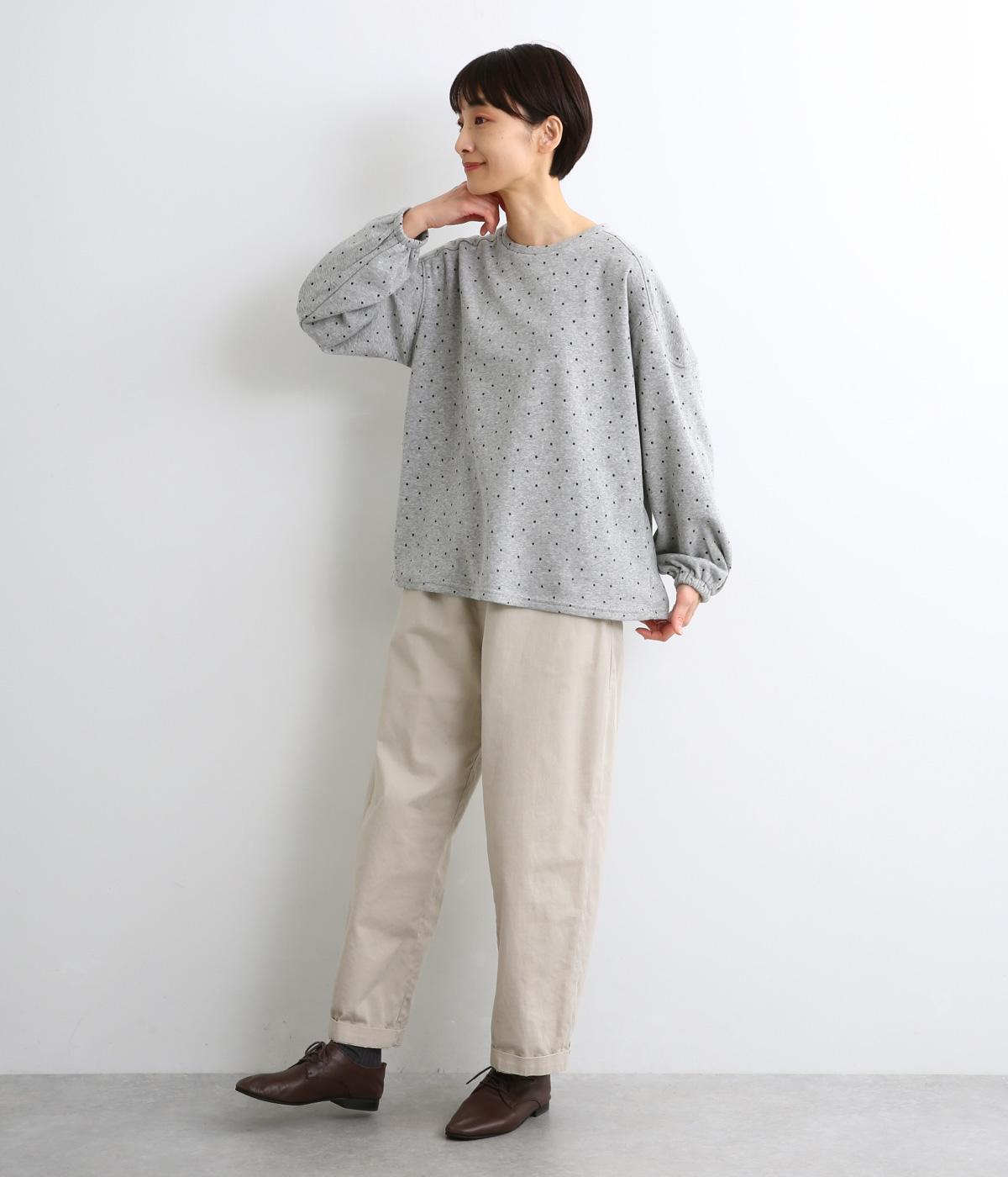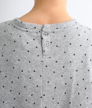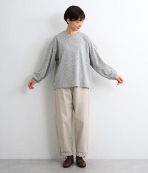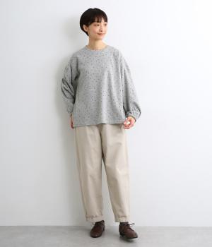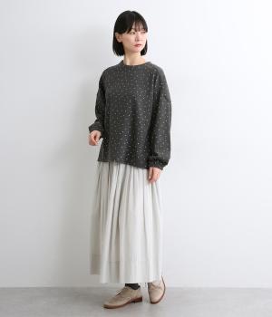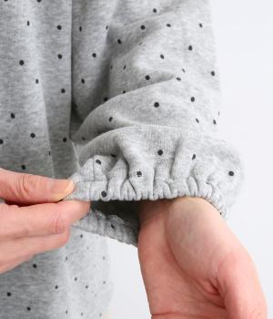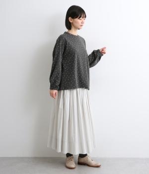 モノトーンのドットプリントが大人かわいいプルオーバー。後ろの切り替えギャザーや肩ヨークでさり気なくデザイン性を加えています。フィットしすぎないシルエットが心地よく、袖口ゴム仕様なのでたくし上げもイージー。