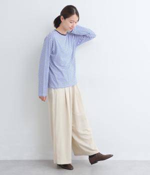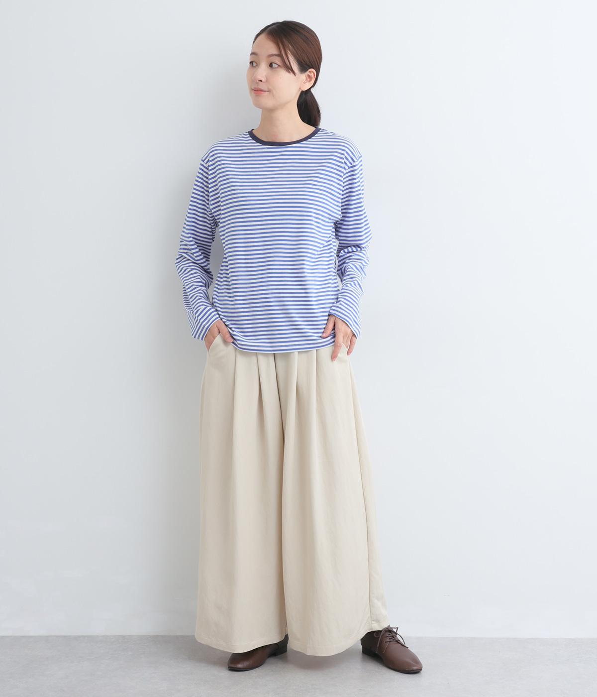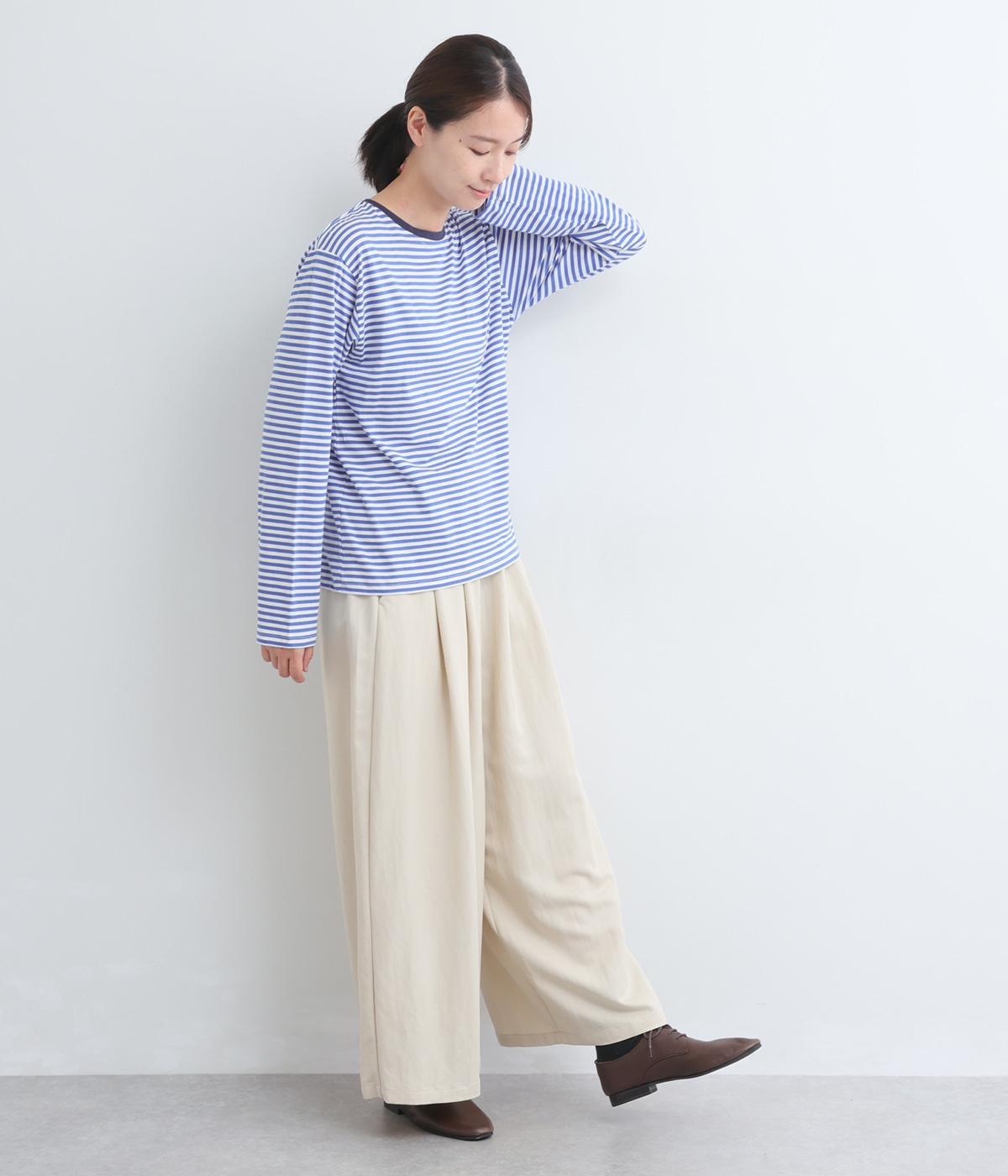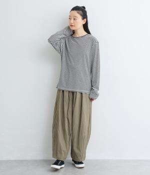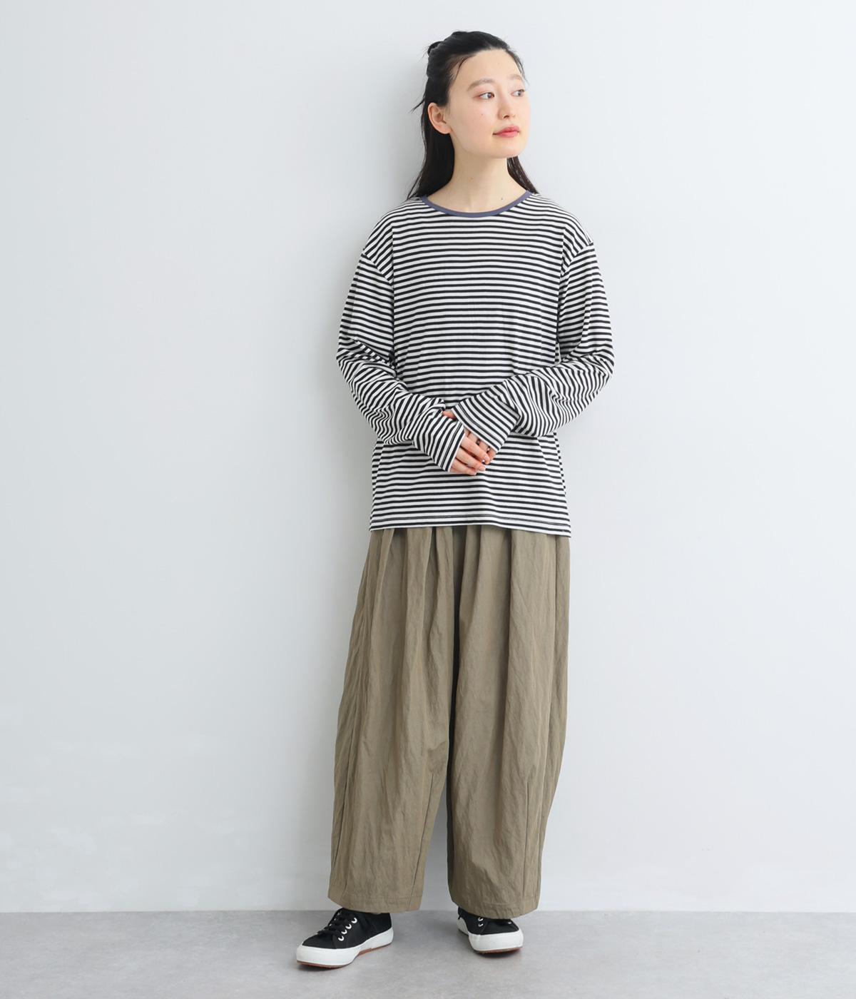 吸水性や吸湿性に優れたセルロースとコットンとの混紡生地を使用。伸縮性がありやわらかで肌触りもよく、使い勝手のいい薄めの中厚手生地でデイリーに着まわせます。
