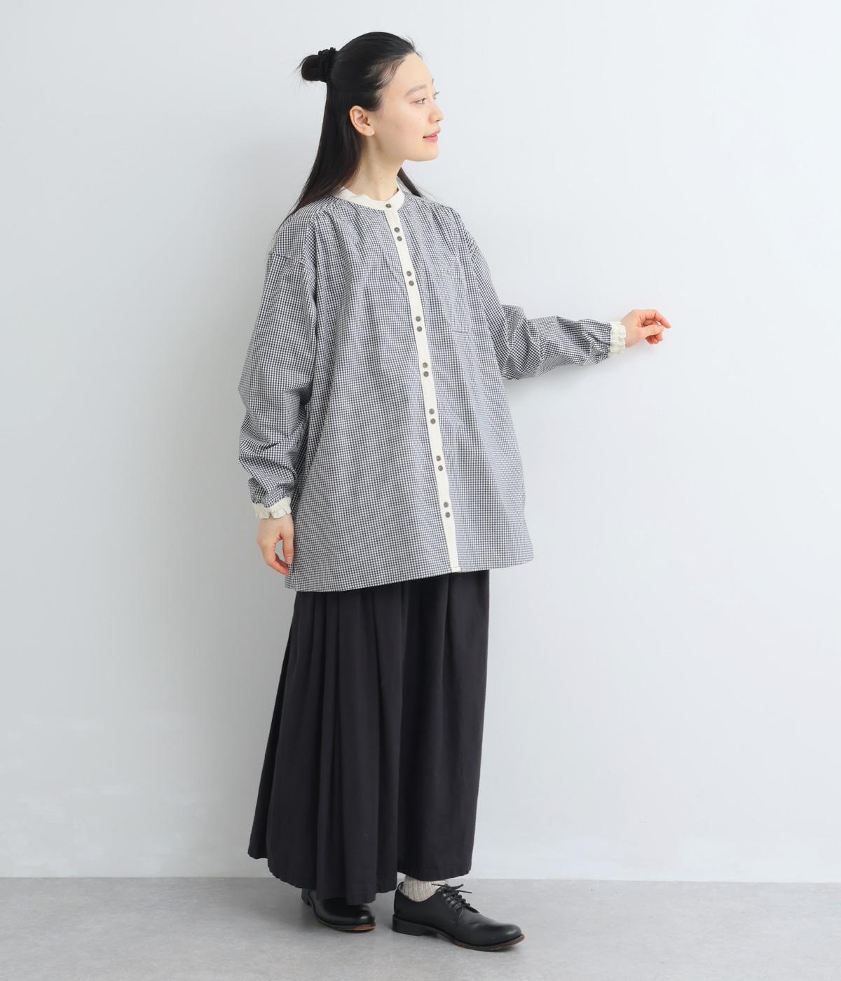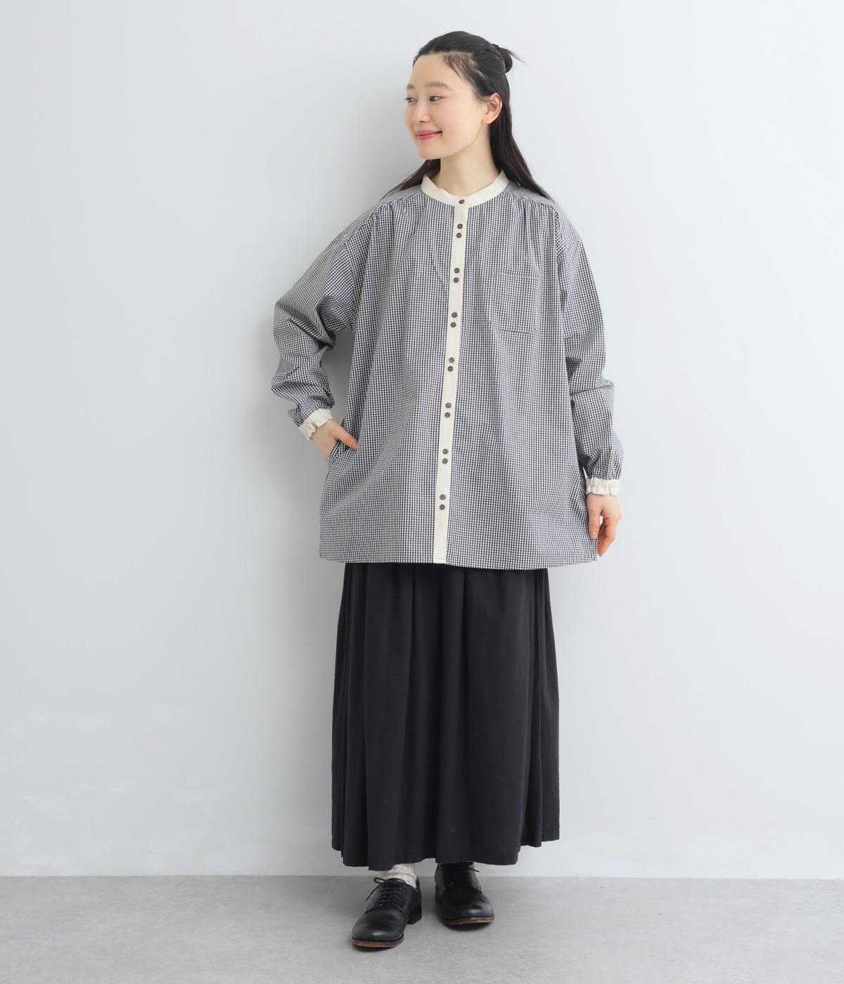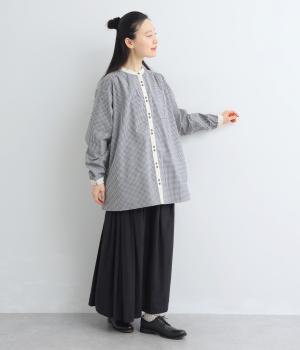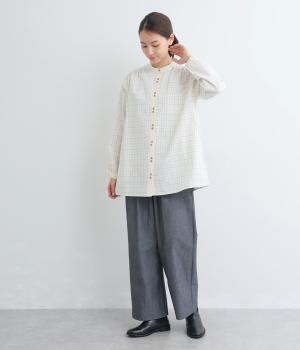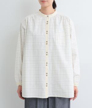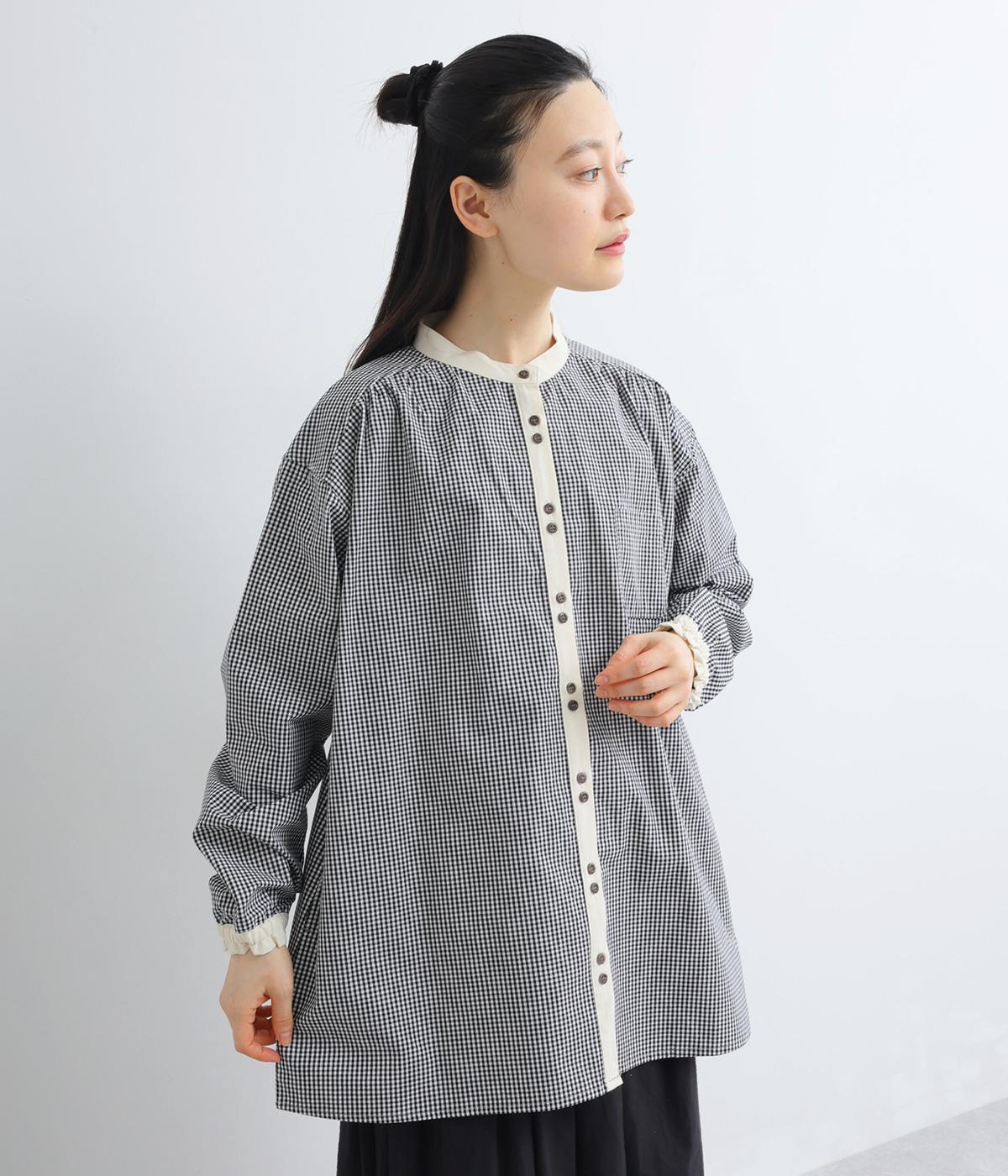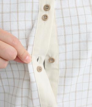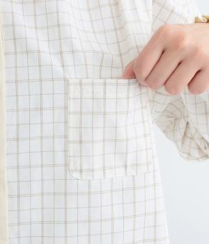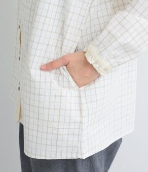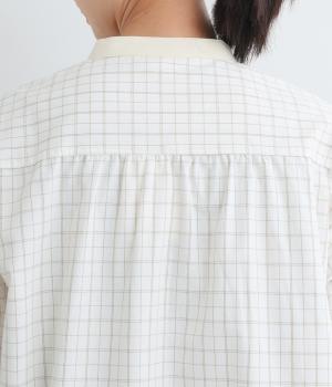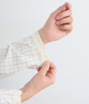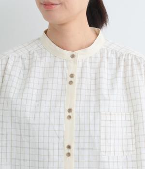 柄生地で着映え力を高めつつ、襟や前中心、袖口を無地配色にしてさわやかにまとめました。ふたつずつ並んだボタンもちょうどいいアクセントに。袖口はゴムギャザーで手仕事時のたくし上げもイージー。
