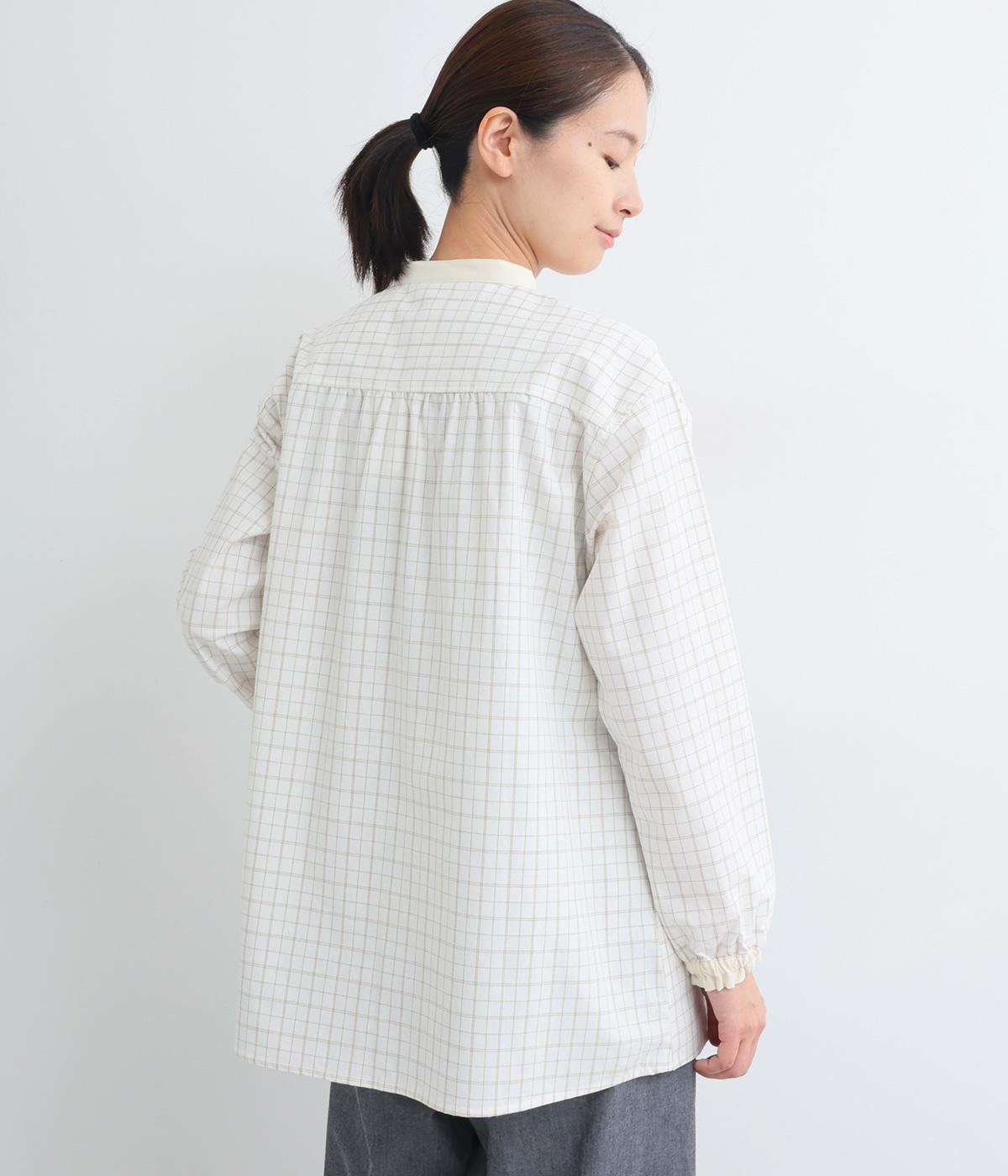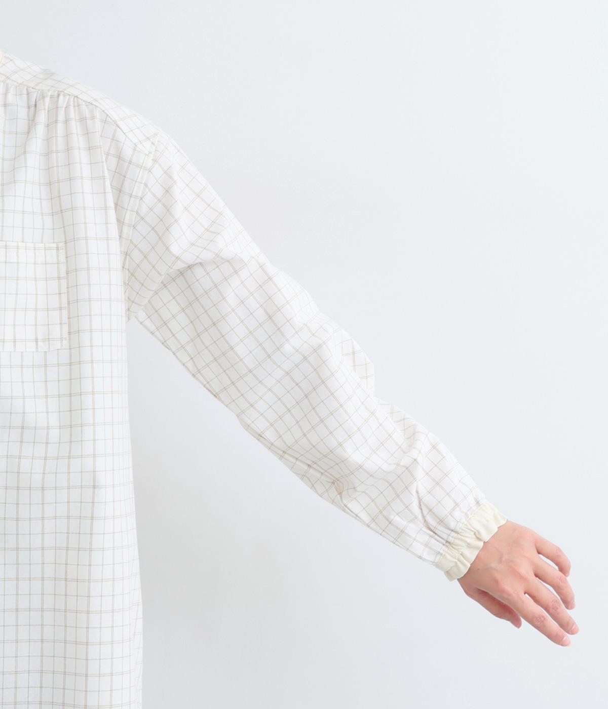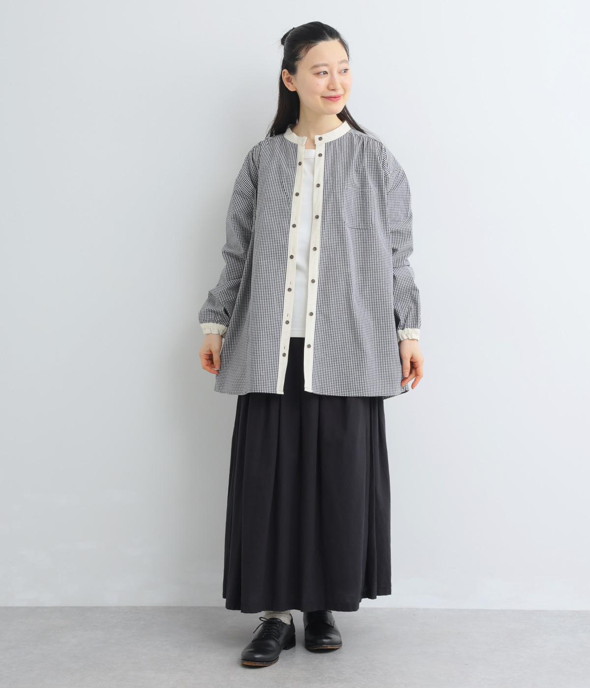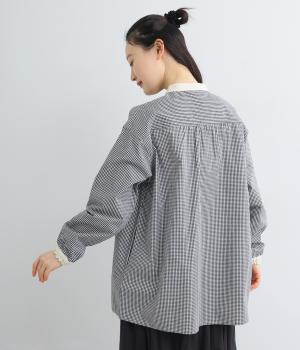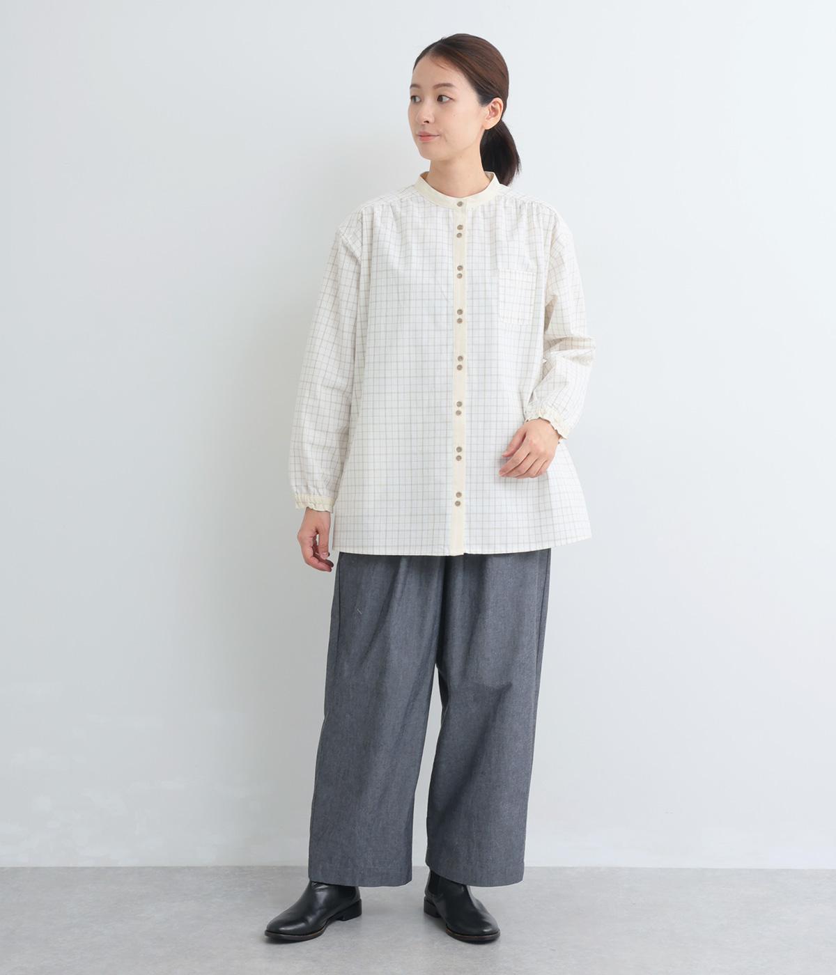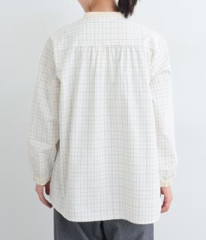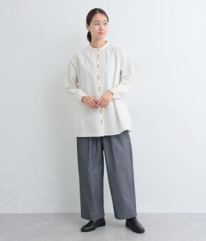 柄生地で着映え力を高めつつ、襟や前中心、袖口を無地配色にしてさわやかにまとめました。ふたつずつ並んだボタンもちょうどいいアクセントに。袖口はゴムギャザーで手仕事時のたくし上げもイージー。