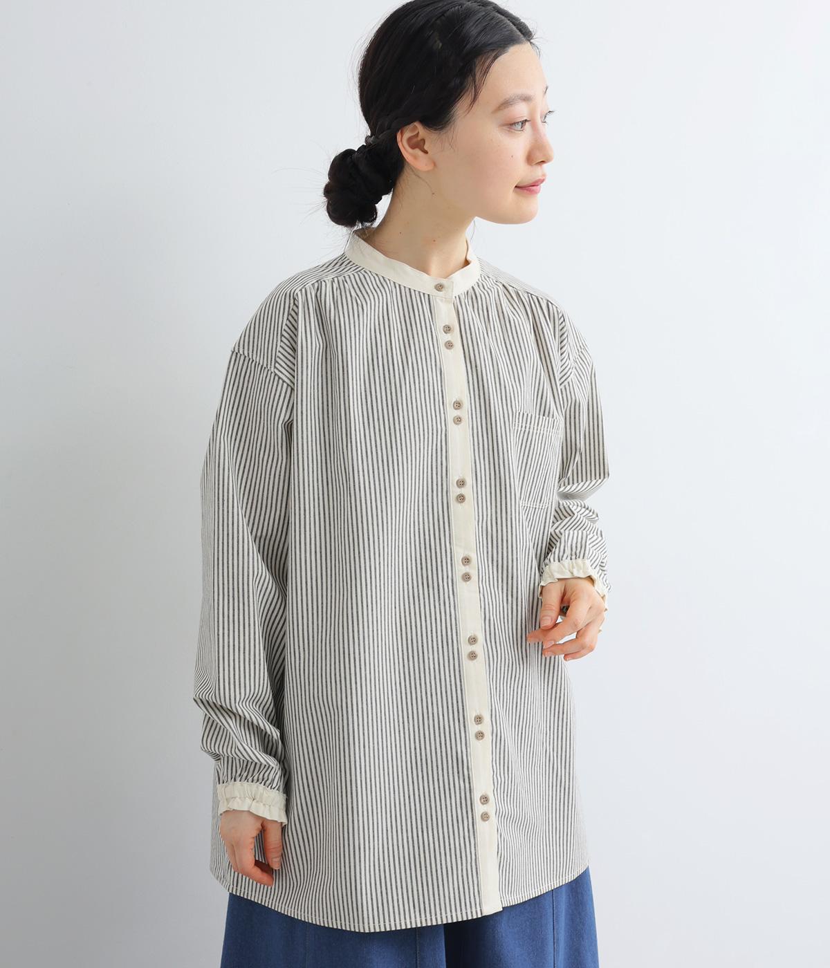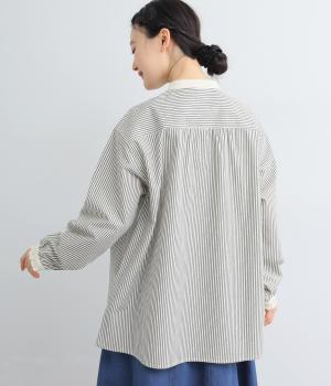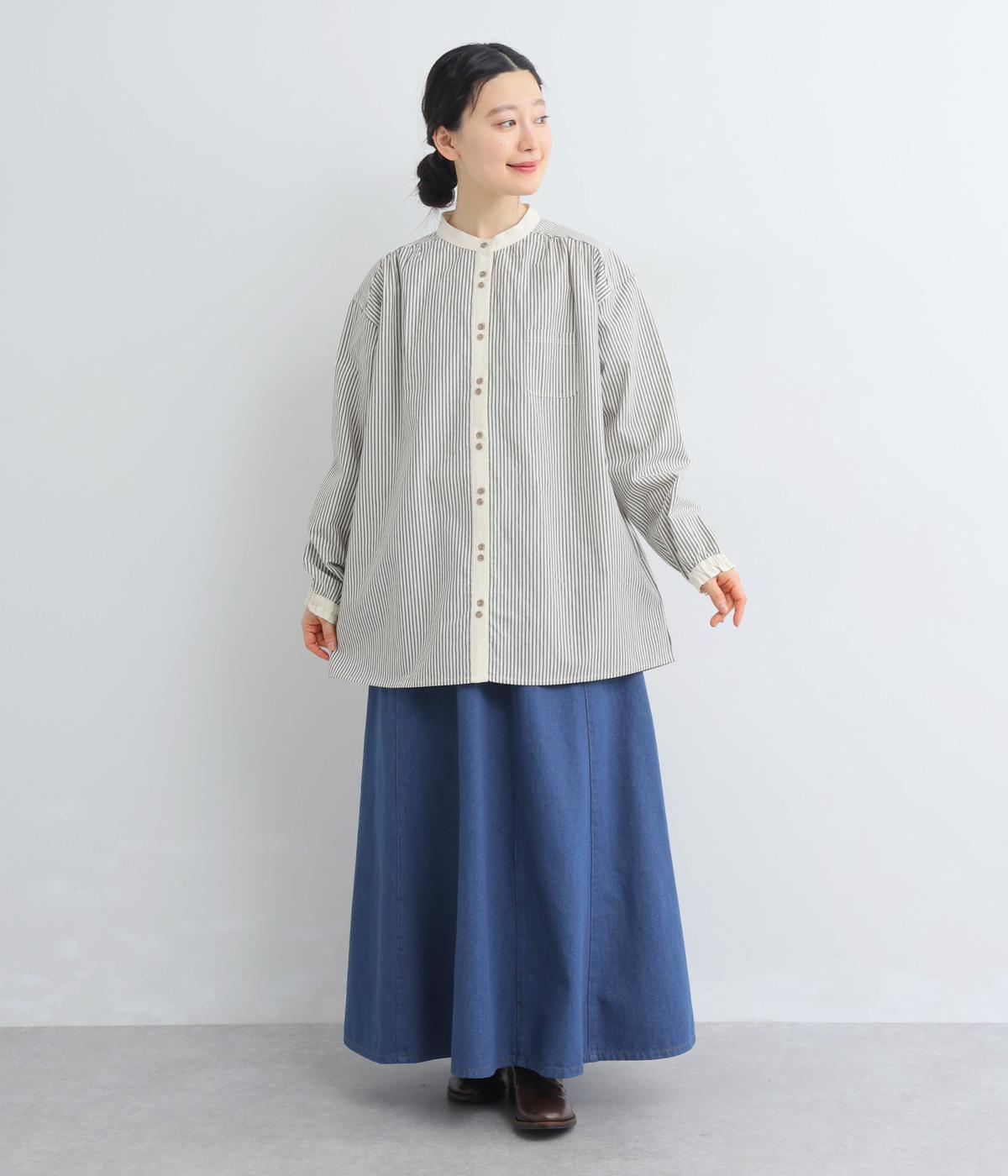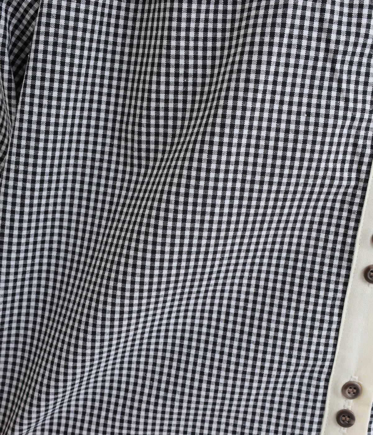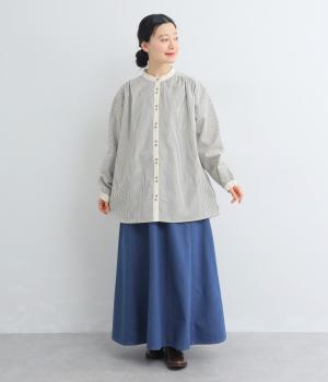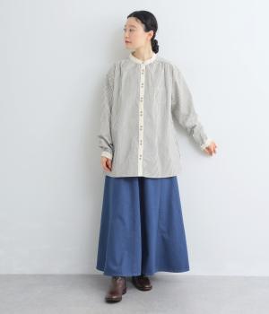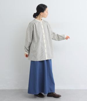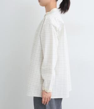 柄生地で着映え力を高めつつ、襟や前中心、袖口を無地配色にしてさわやかにまとめました。ふたつずつ並んだボタンもちょうどいいアクセントに。袖口はゴムギャザーで手仕事時のたくし上げもイージー。