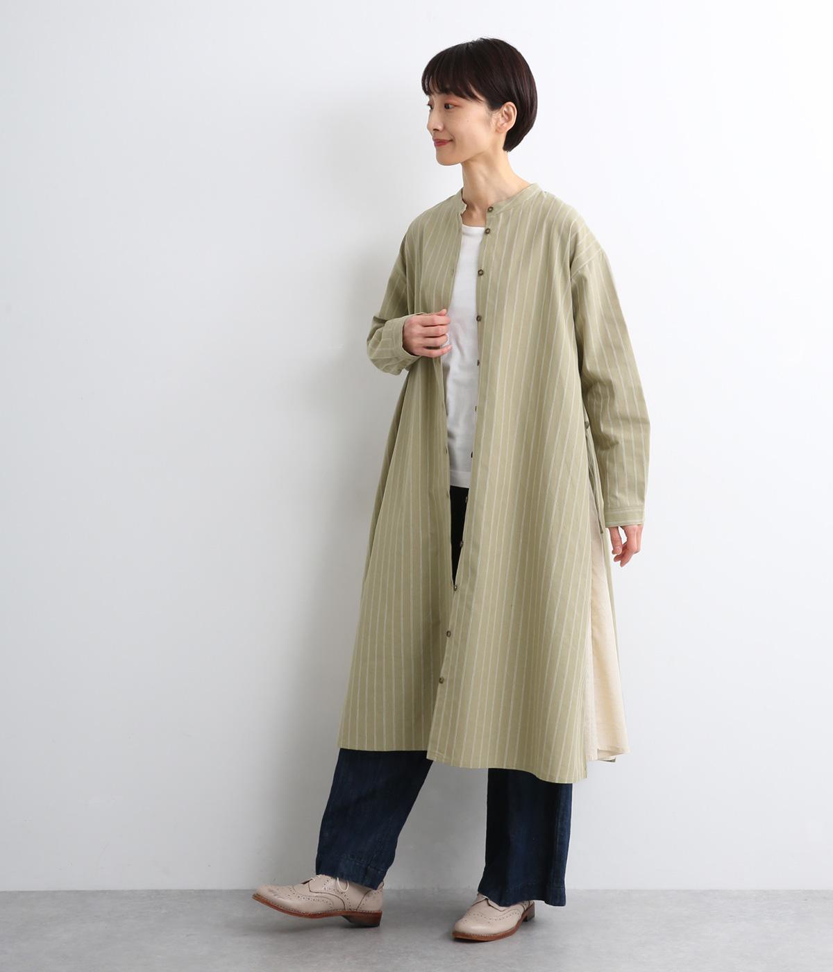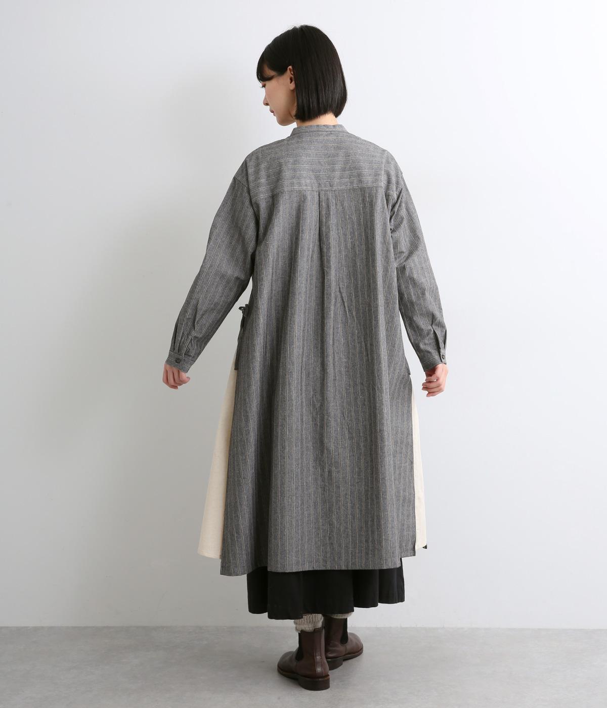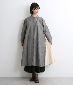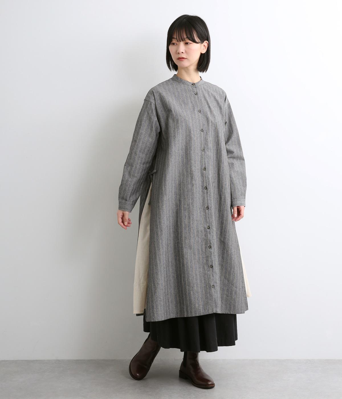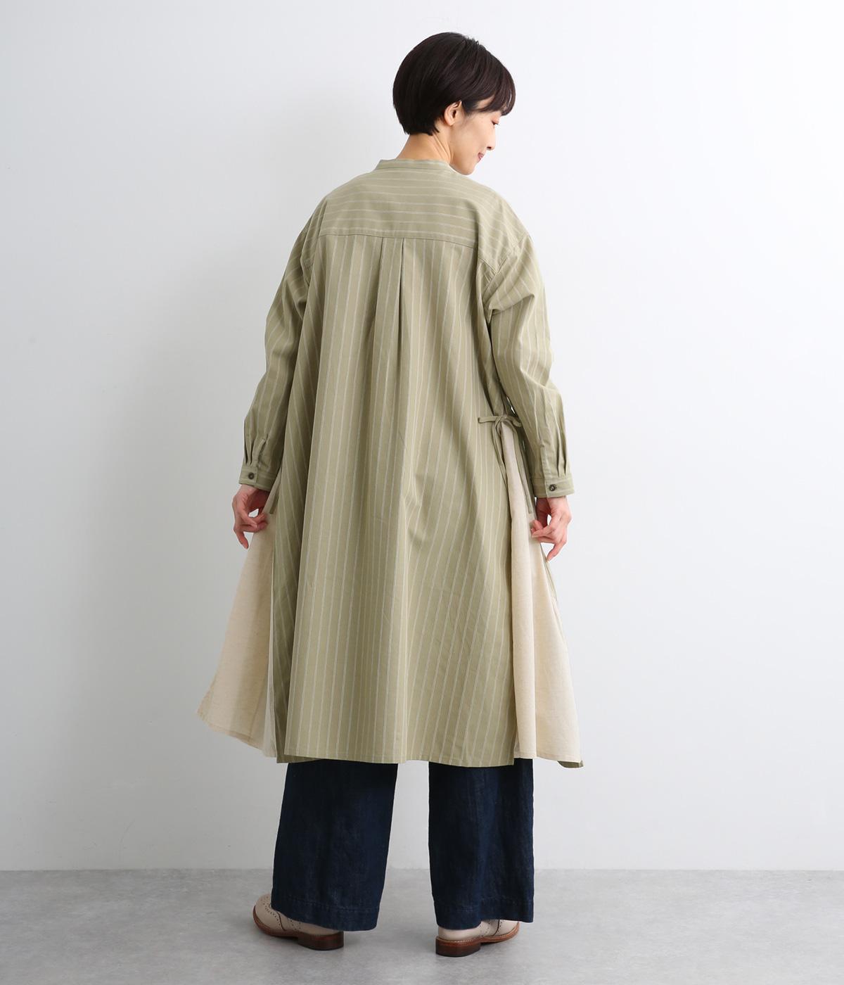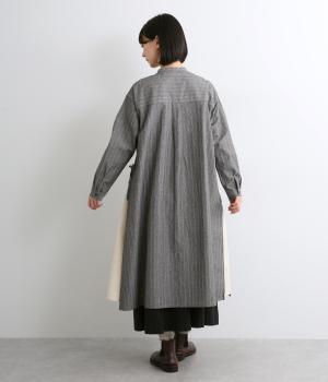 サイドを無地生地に切り替えてレイヤード風に見せたデザインが特徴的。ボトムとのレイヤードがたのしめる丈感で、ナチュラルな装いの幅が広がります。前あき仕様なので、ガウンのように羽織ればこなれ感もアップ。