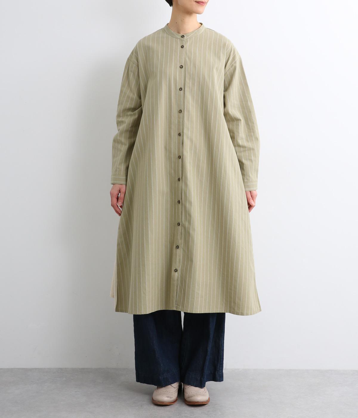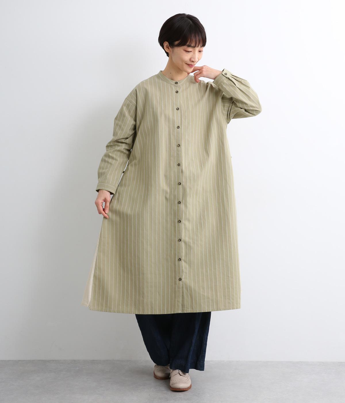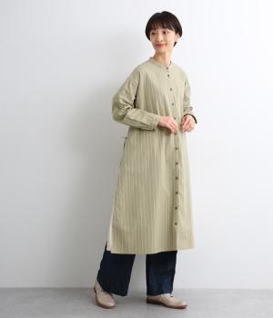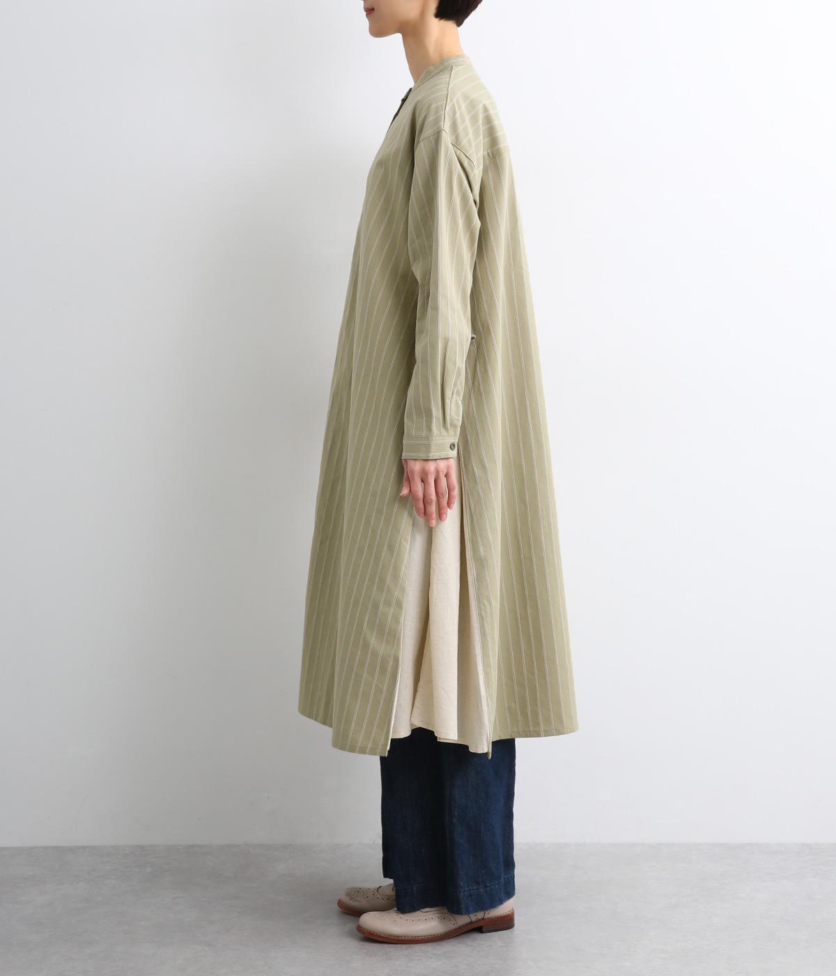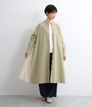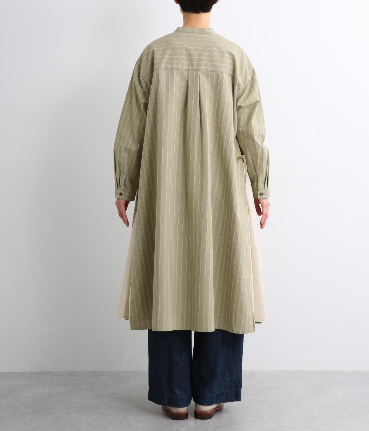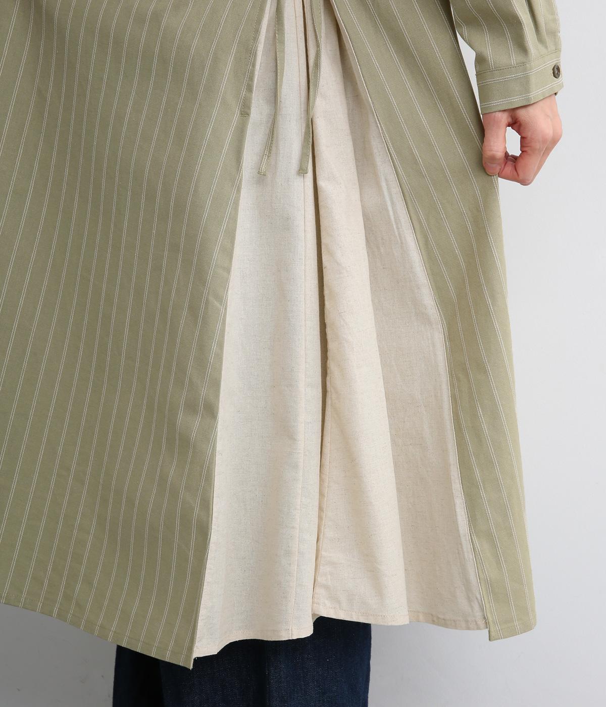 サイドを無地生地に切り替えてレイヤード風に見せたデザインが特徴的。ボトムとのレイヤードがたのしめる丈感で、ナチュラルな装いの幅が広がります。前あき仕様なので、ガウンのように羽織ればこなれ感もアップ。