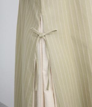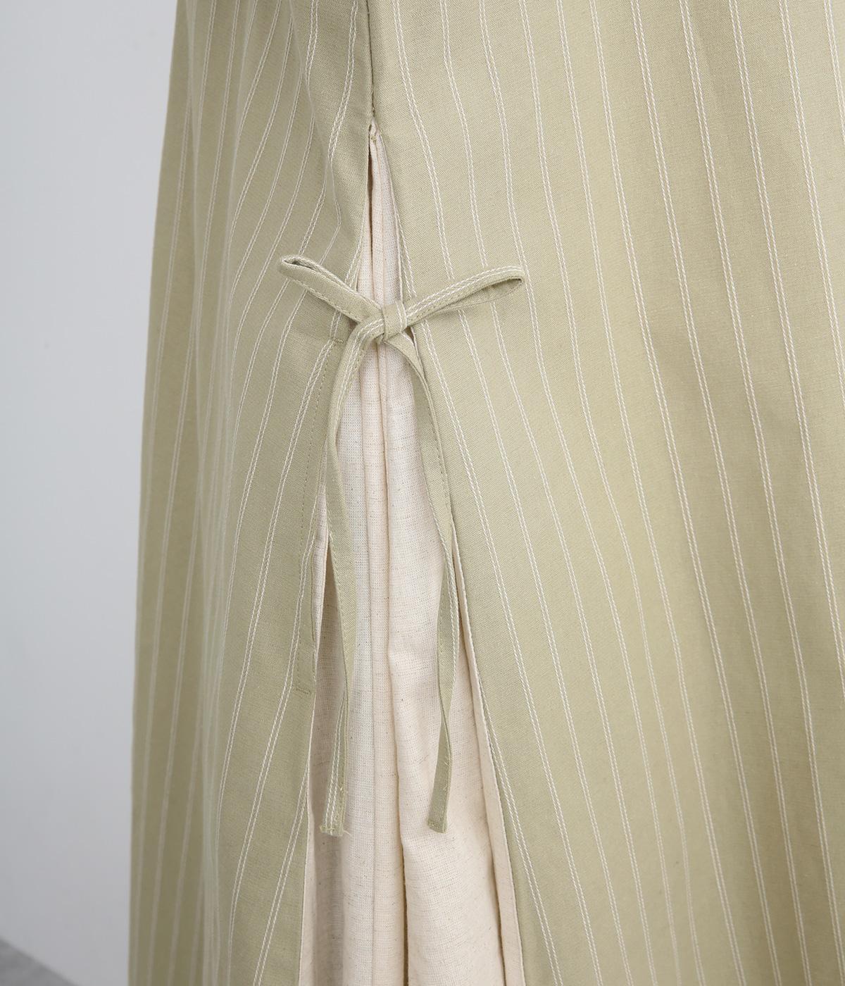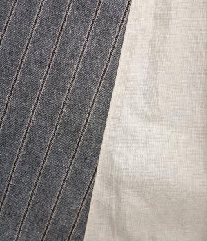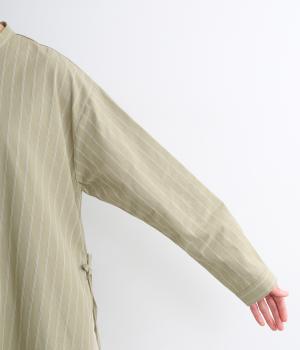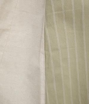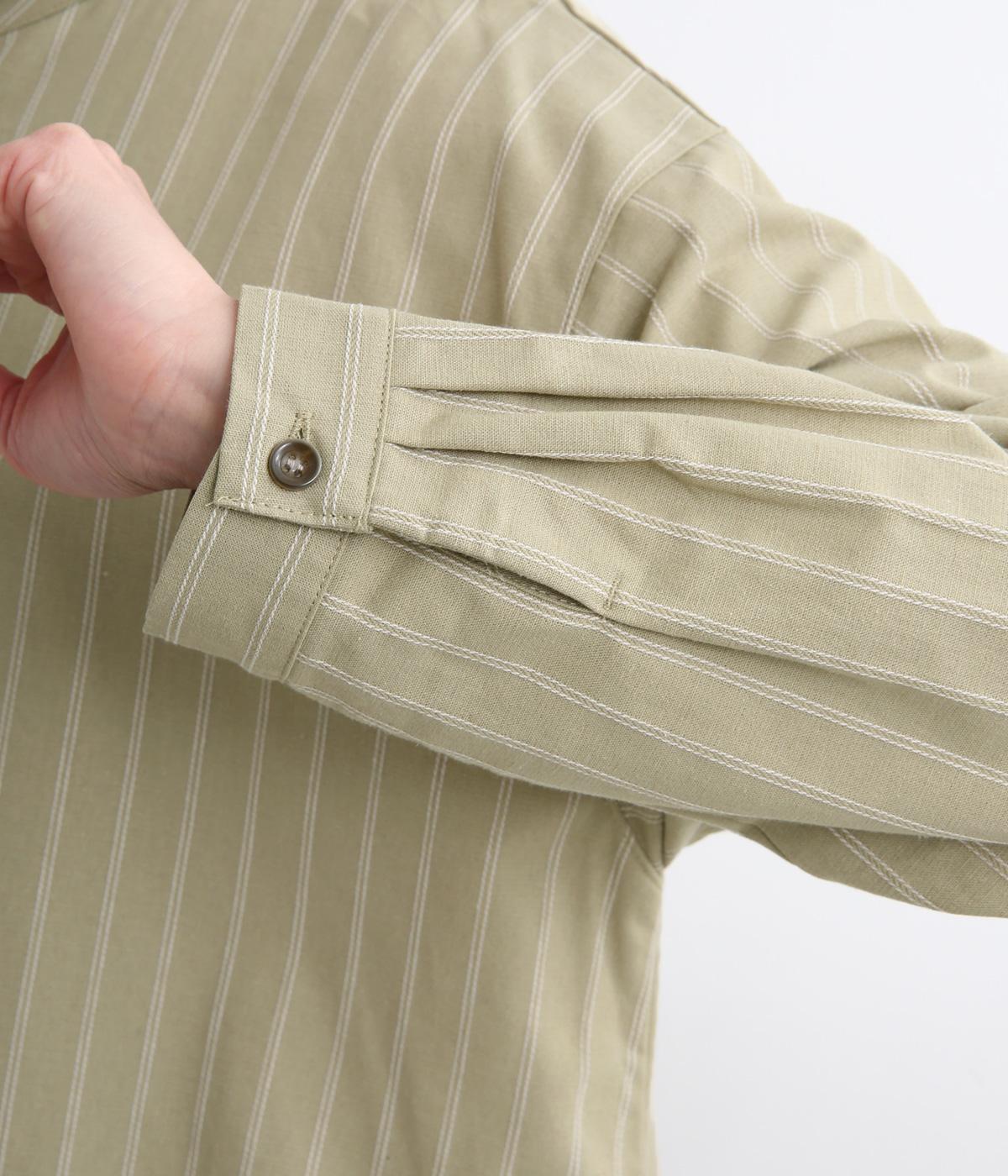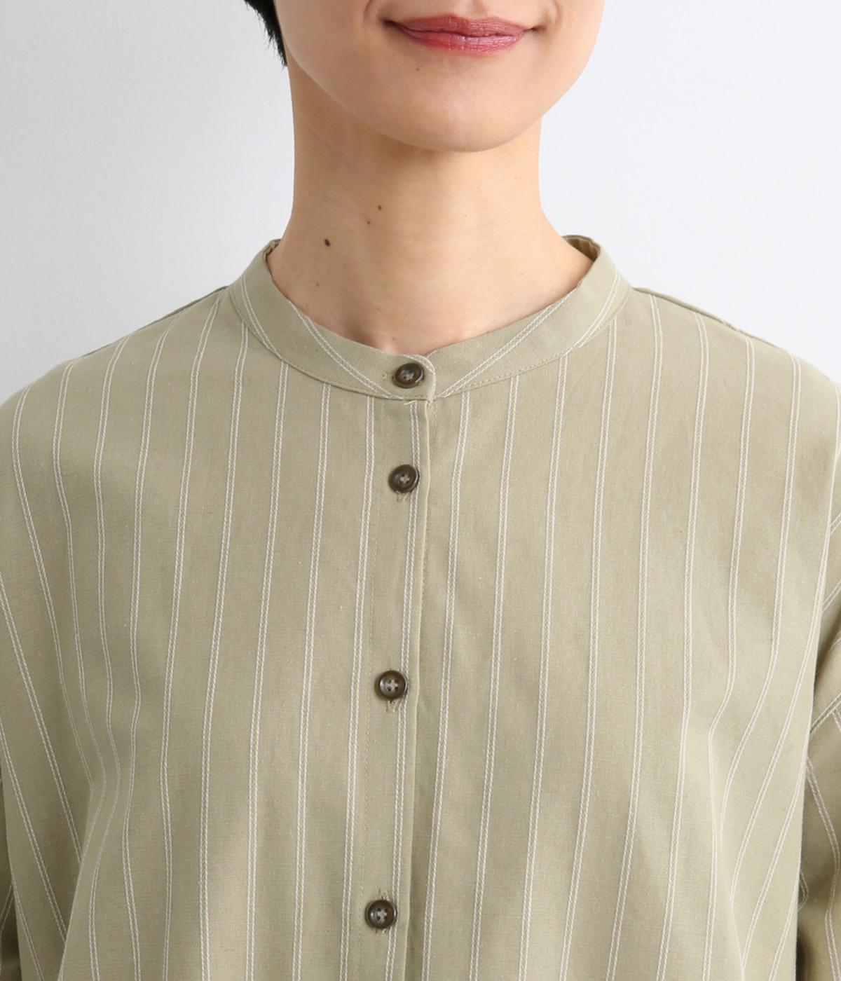 ベースの生地に糸を織りこむことで独特の凹凸が表現されたストライプ柄のドビー生地を使用しています。肌のまとわりがすくないコットンリネンで、吸水性にも優れているので着心地も快適。
