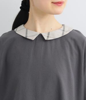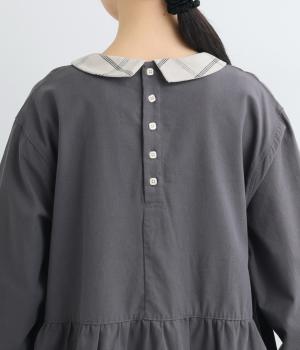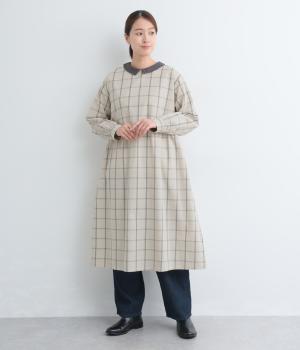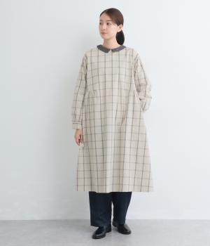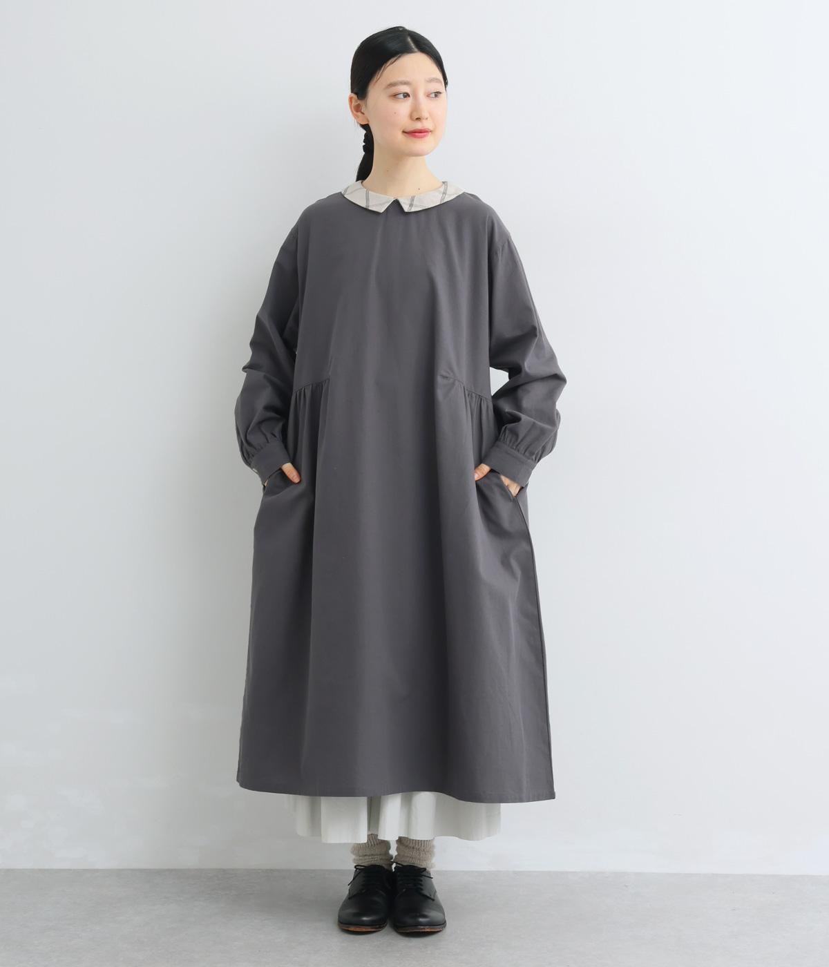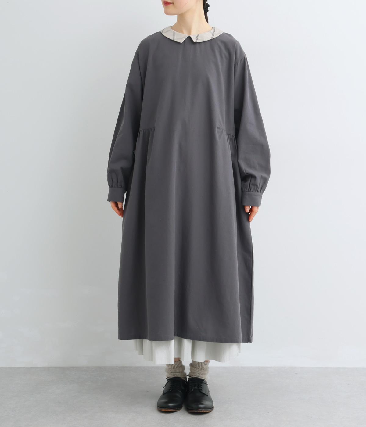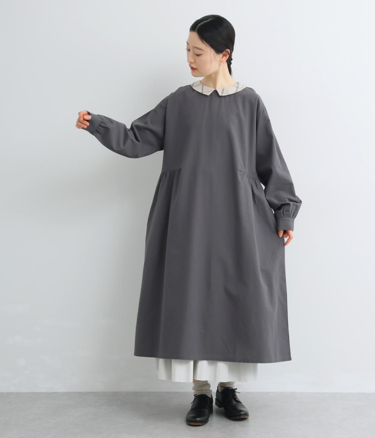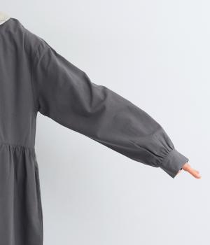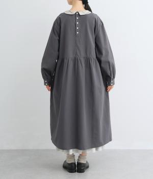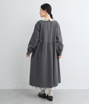 サイドギャザーを入れたゆったりとしたフレアワンピースに配色襟をつけてガーリーテイストにまとめました。ふっくらとした袖も可愛らしいポイント。一枚着もボトム合わせもたのしめるロング丈です。