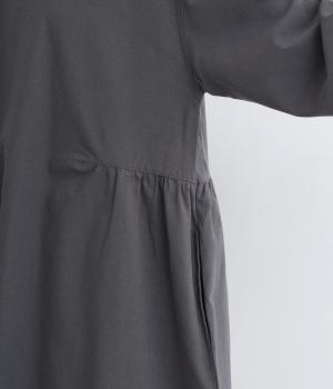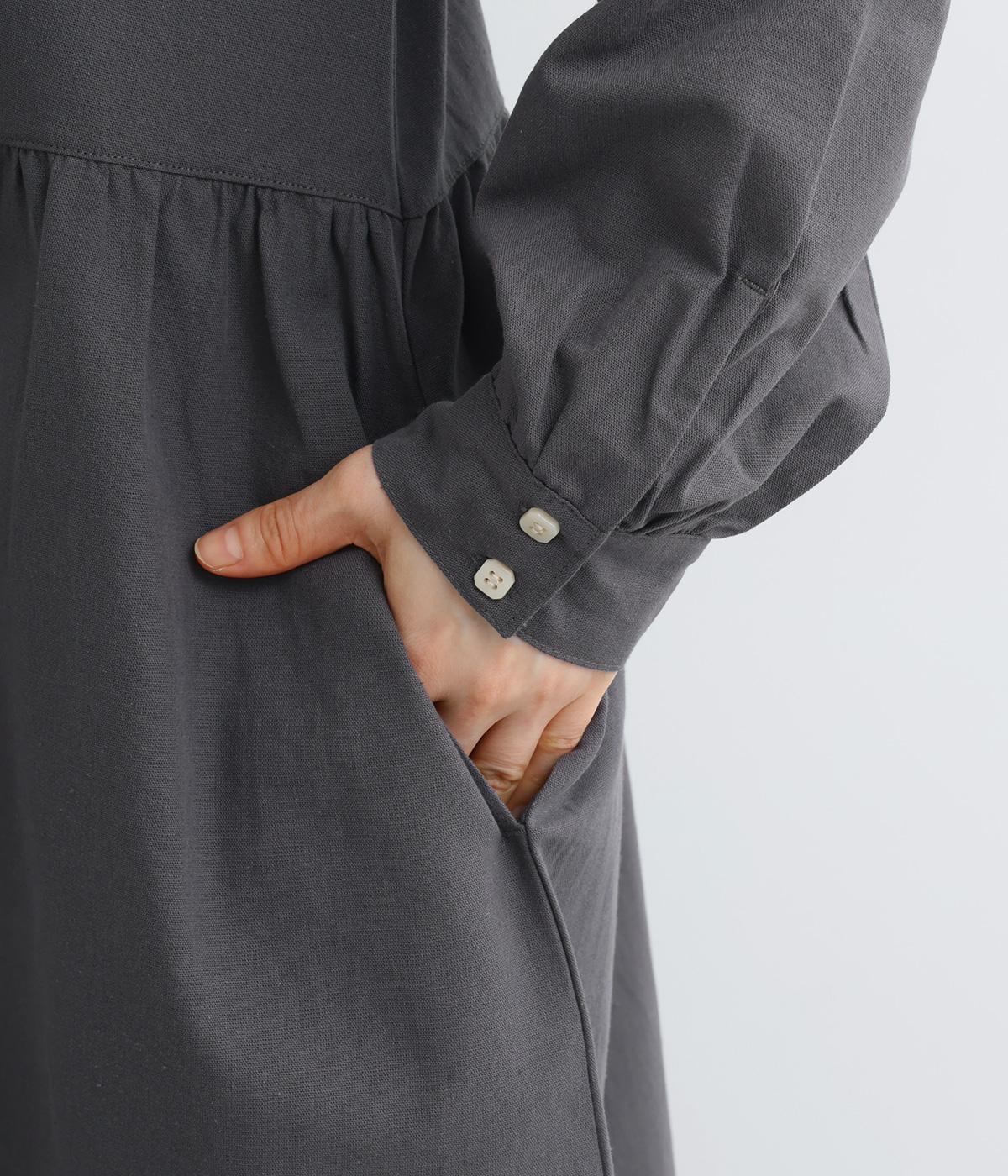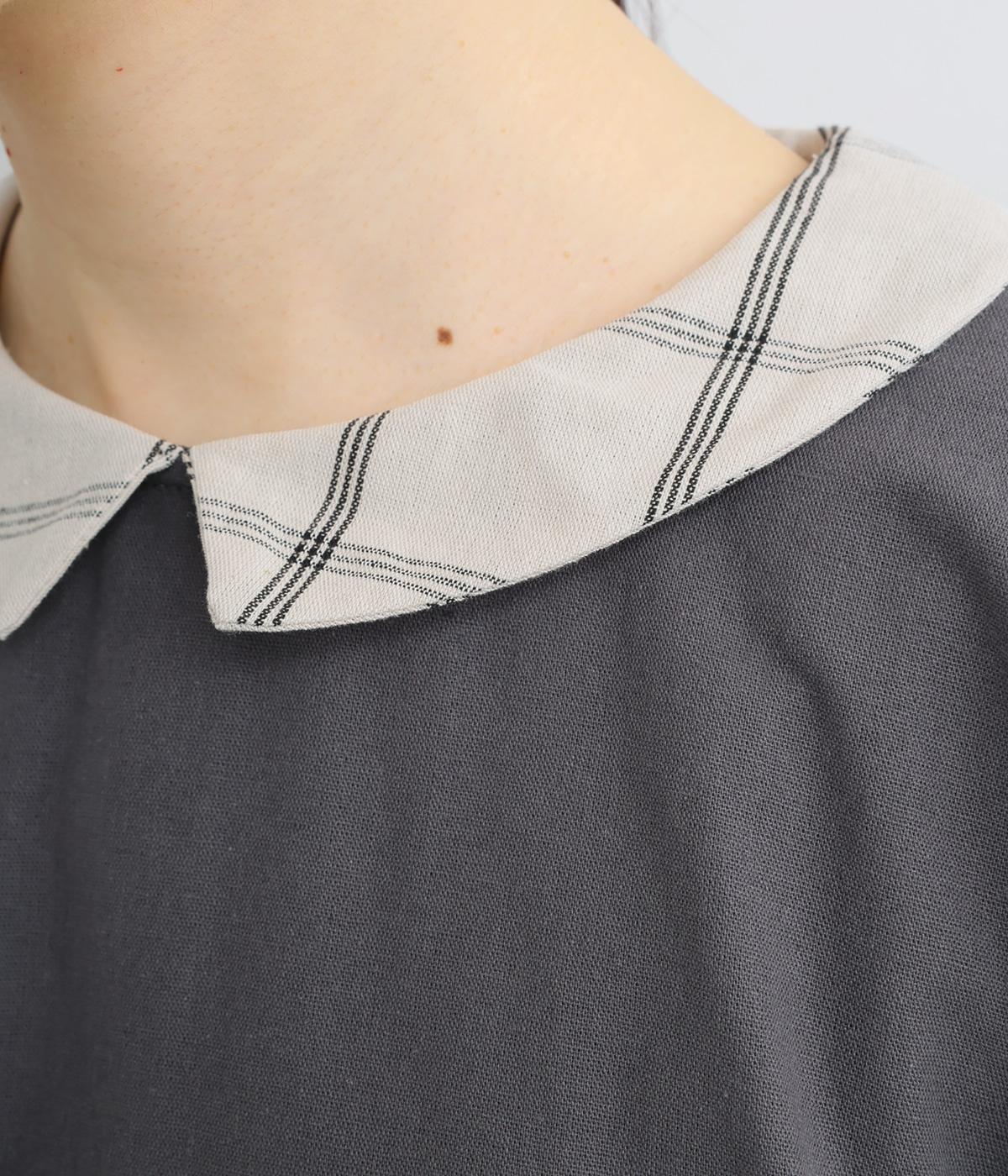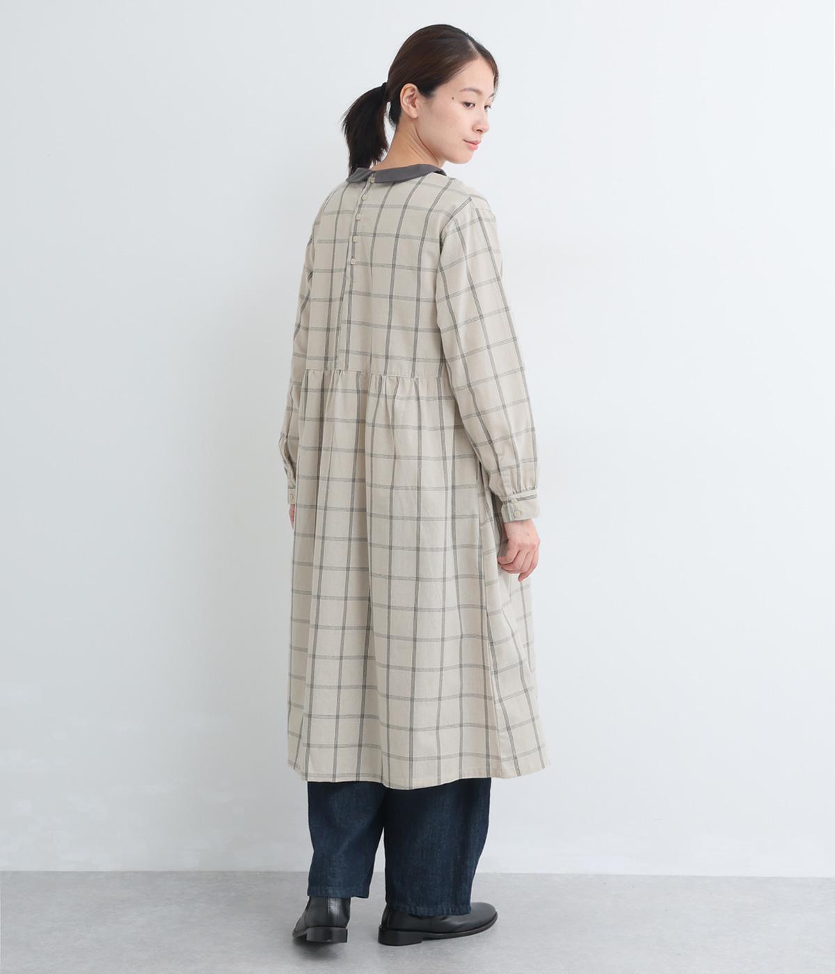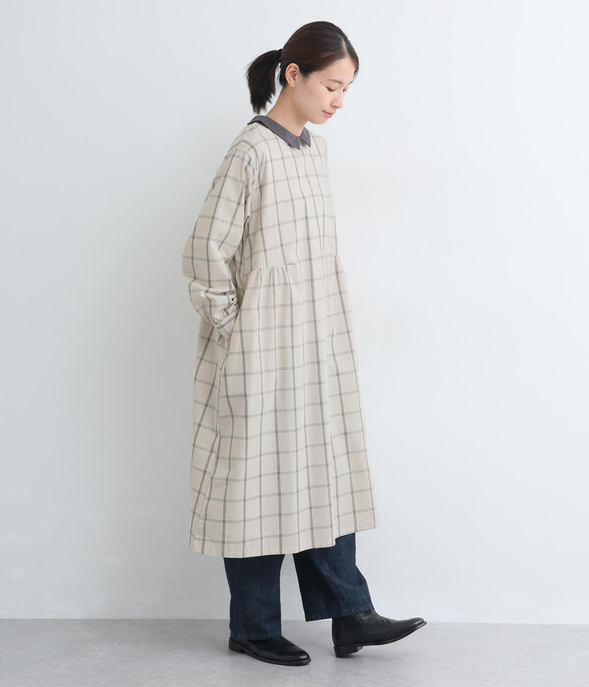 サイドギャザーを入れたゆったりとしたフレアワンピースに配色襟をつけてガーリーテイストにまとめました。ふっくらとした袖も可愛らしいポイント。一枚着もボトム合わせもたのしめるロング丈です。