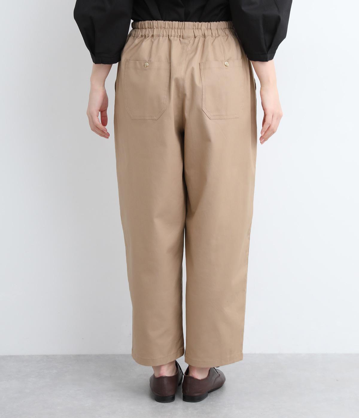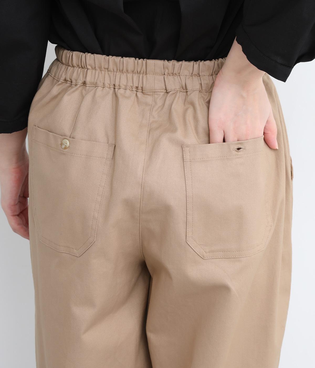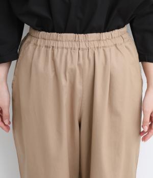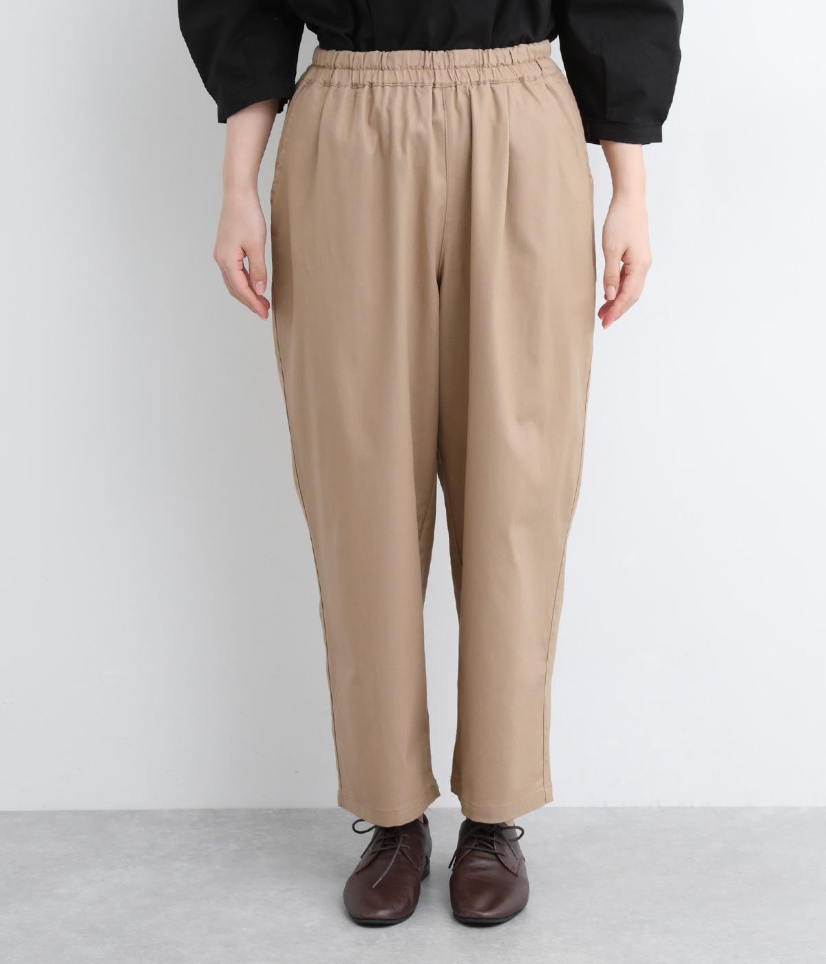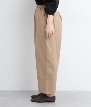 裾にかけてやや細身になるテーパードシルエットのパンツです。総ゴム入りでファスナーなしの、気負わずはけるイージータイプ。内側のヒモを絞ることでサイズ調整も可能です。ワンピースとのレイヤードにも活躍。