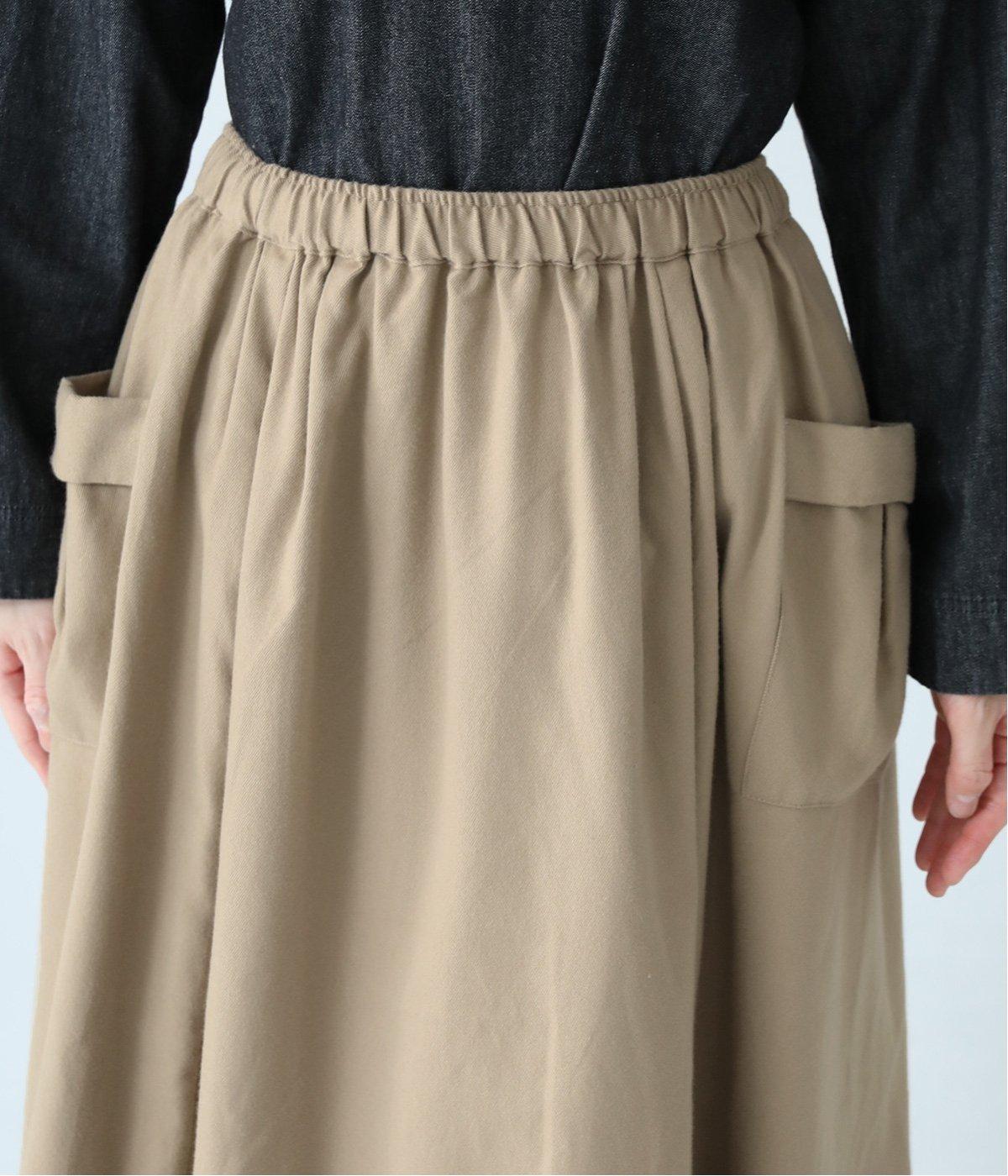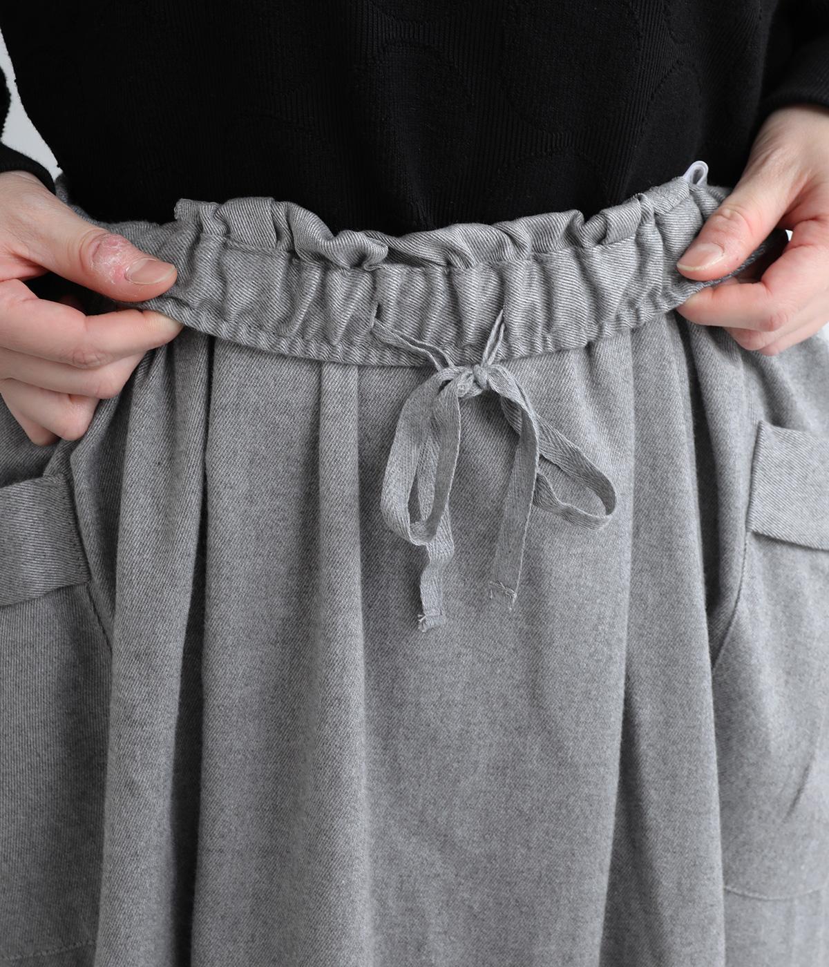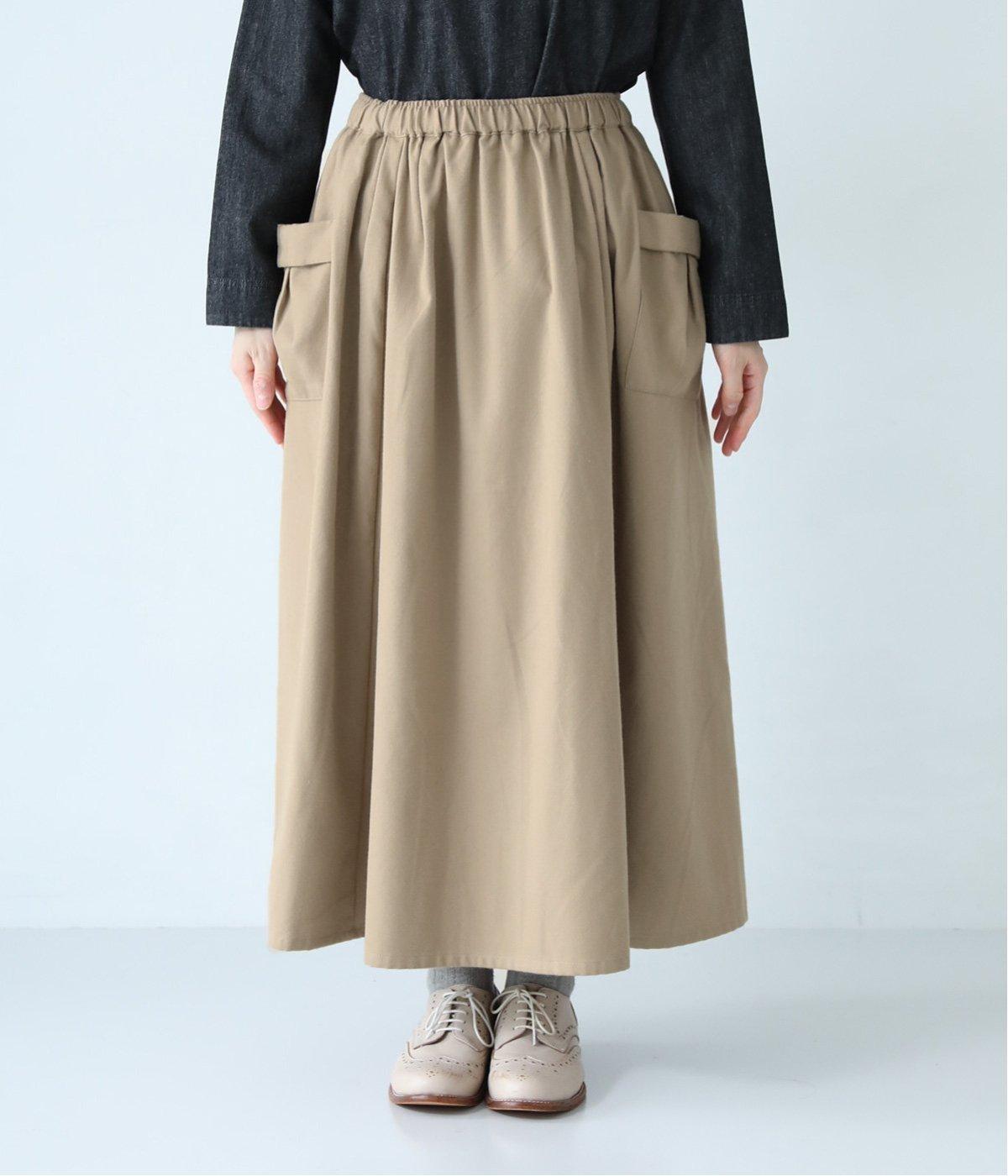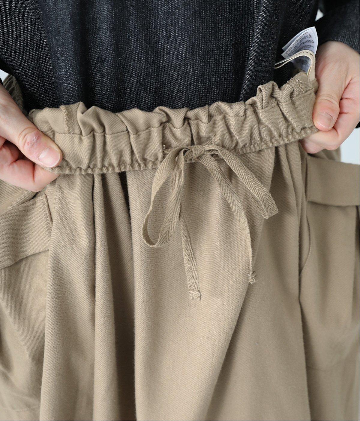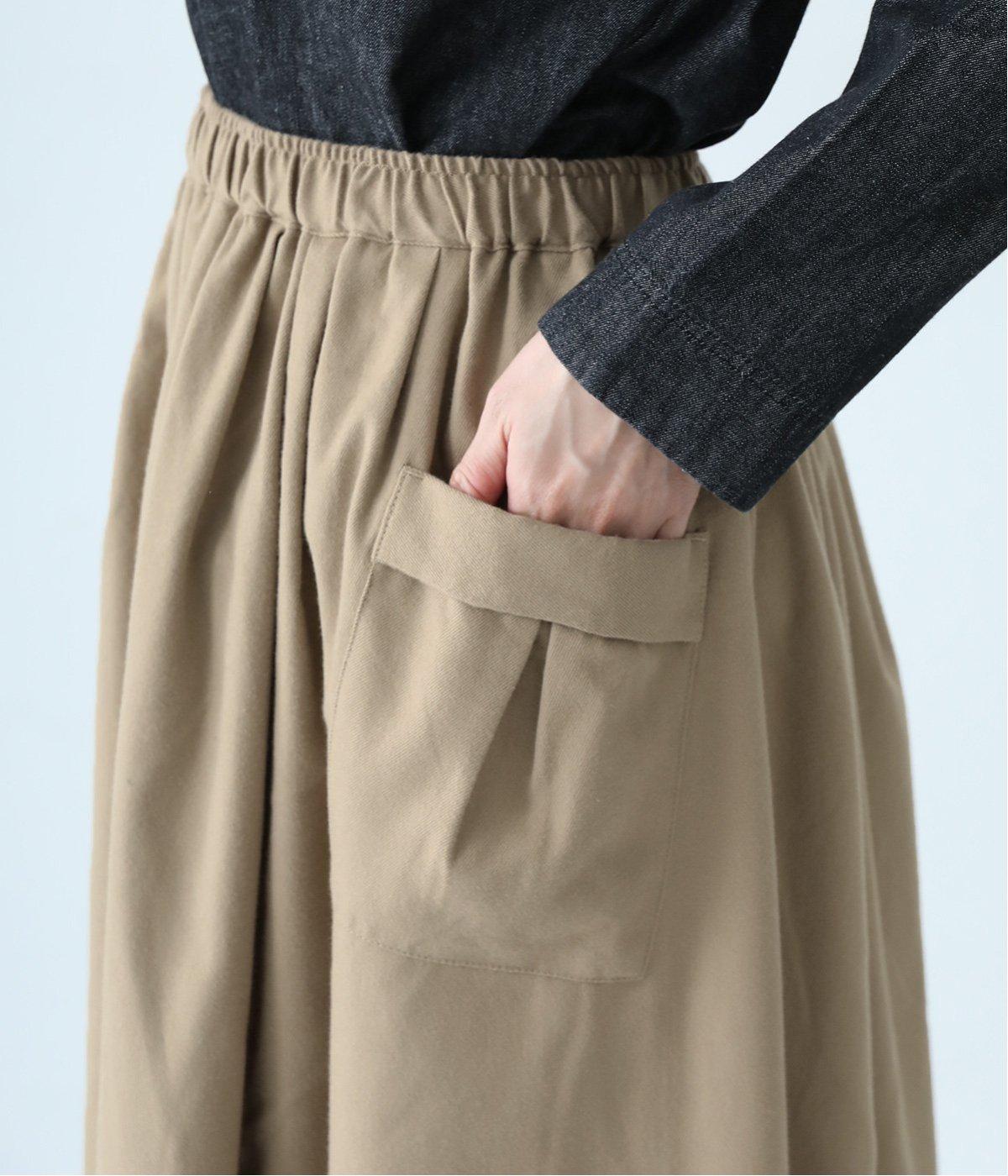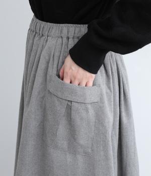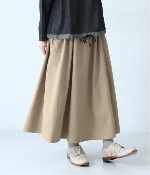 ウエストにタックを入れてボリューミーに仕上げたフレアスカート。両脇に立体的なポケットをつけてアクセントにしています。総ゴム仕様のウエストにはフィット感を高める紐をプラス。イージーな着用感ときれい見えを両方叶えてくれるアイテムです。