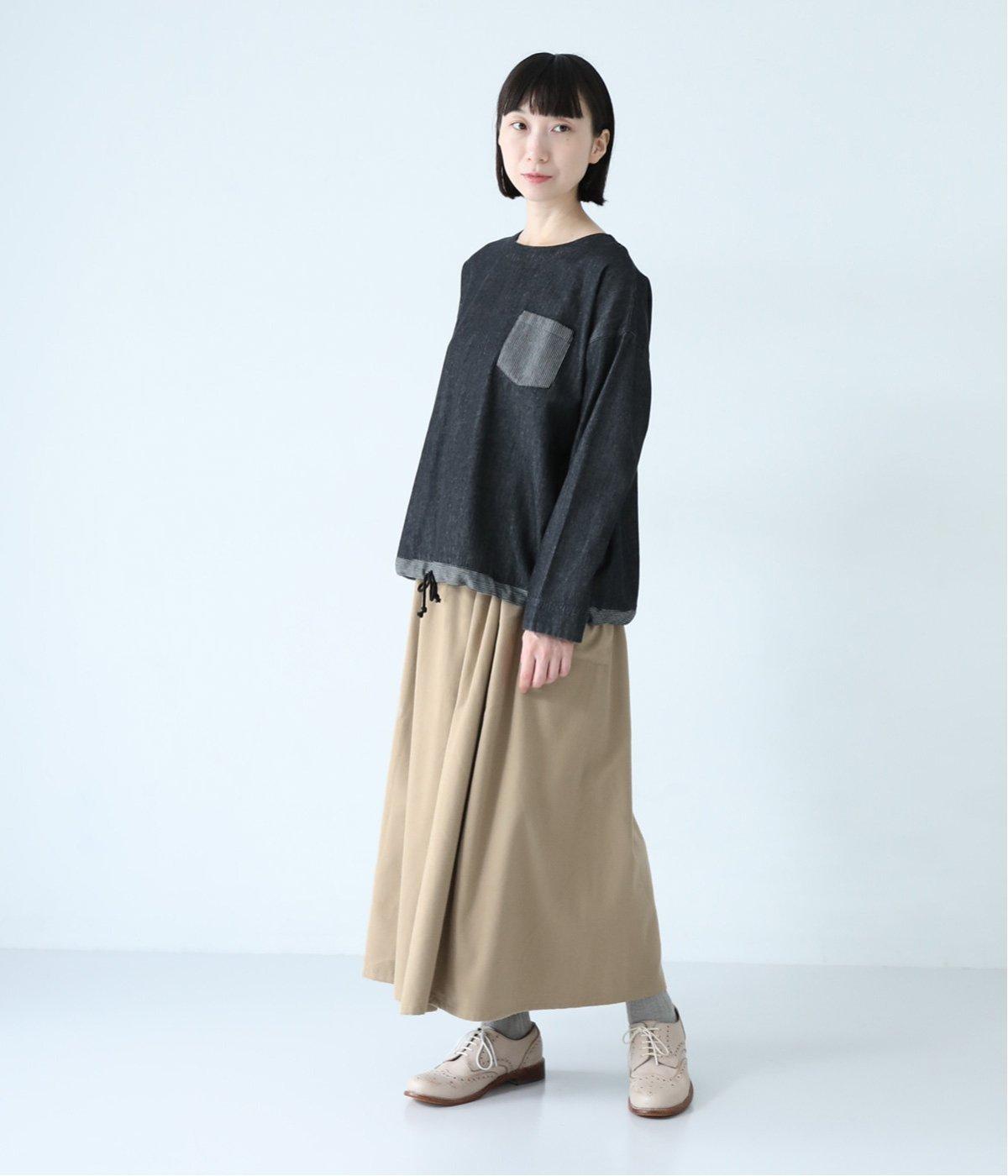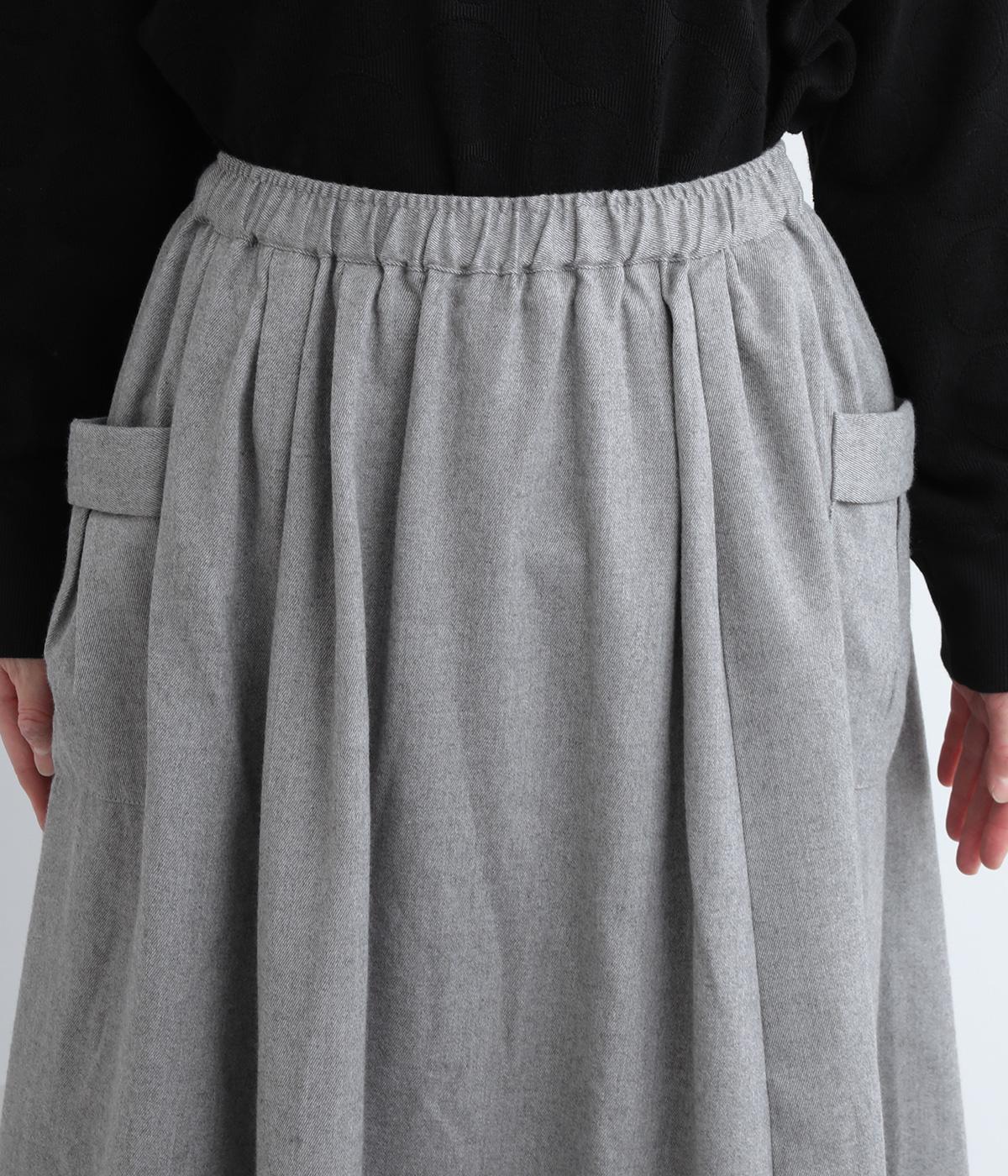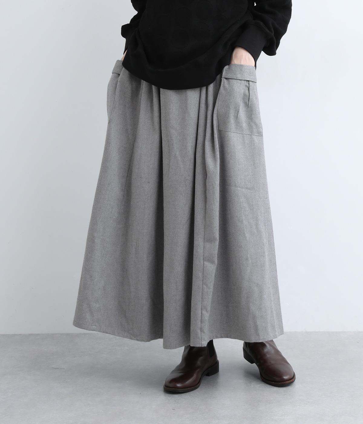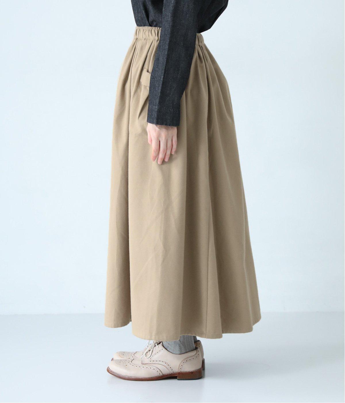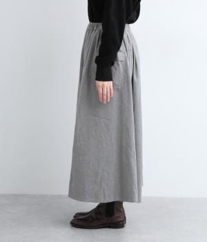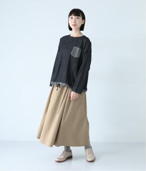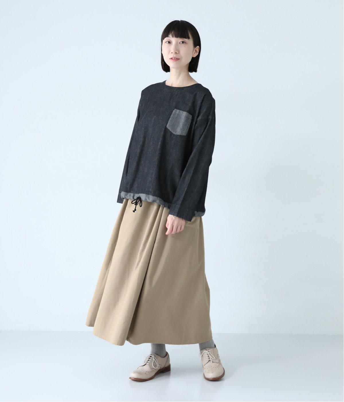 ウエストにタックを入れてボリューミーに仕上げたフレアスカート。両脇に立体的なポケットをつけてアクセントにしています。総ゴム仕様のウエストにはフィット感を高める紐をプラス。イージーな着用感ときれい見えを両方叶えてくれるアイテムです。