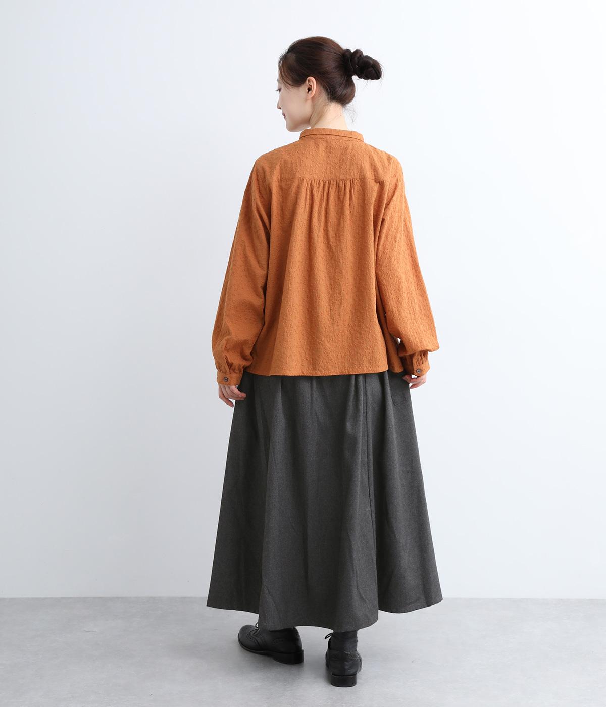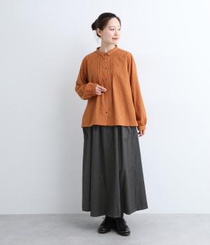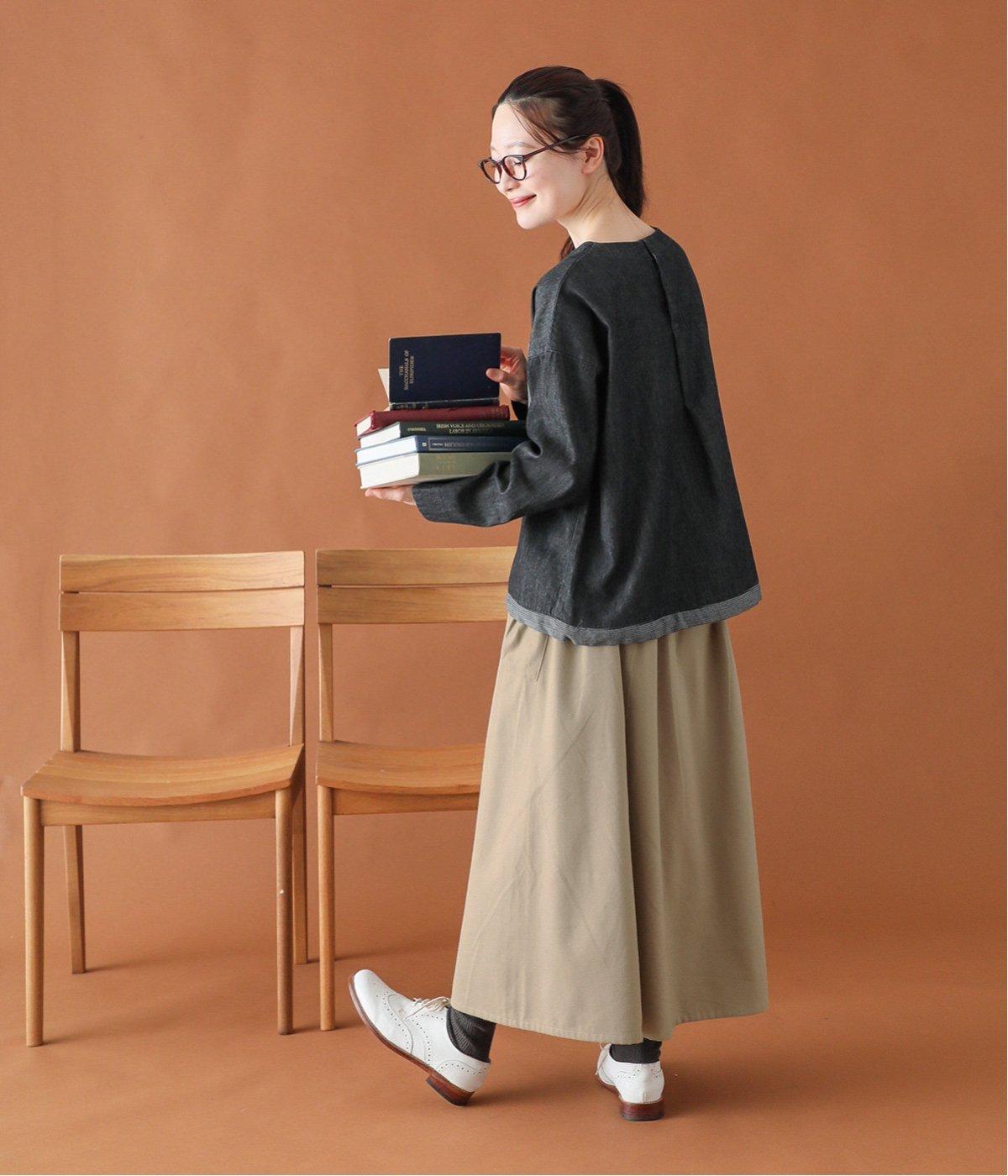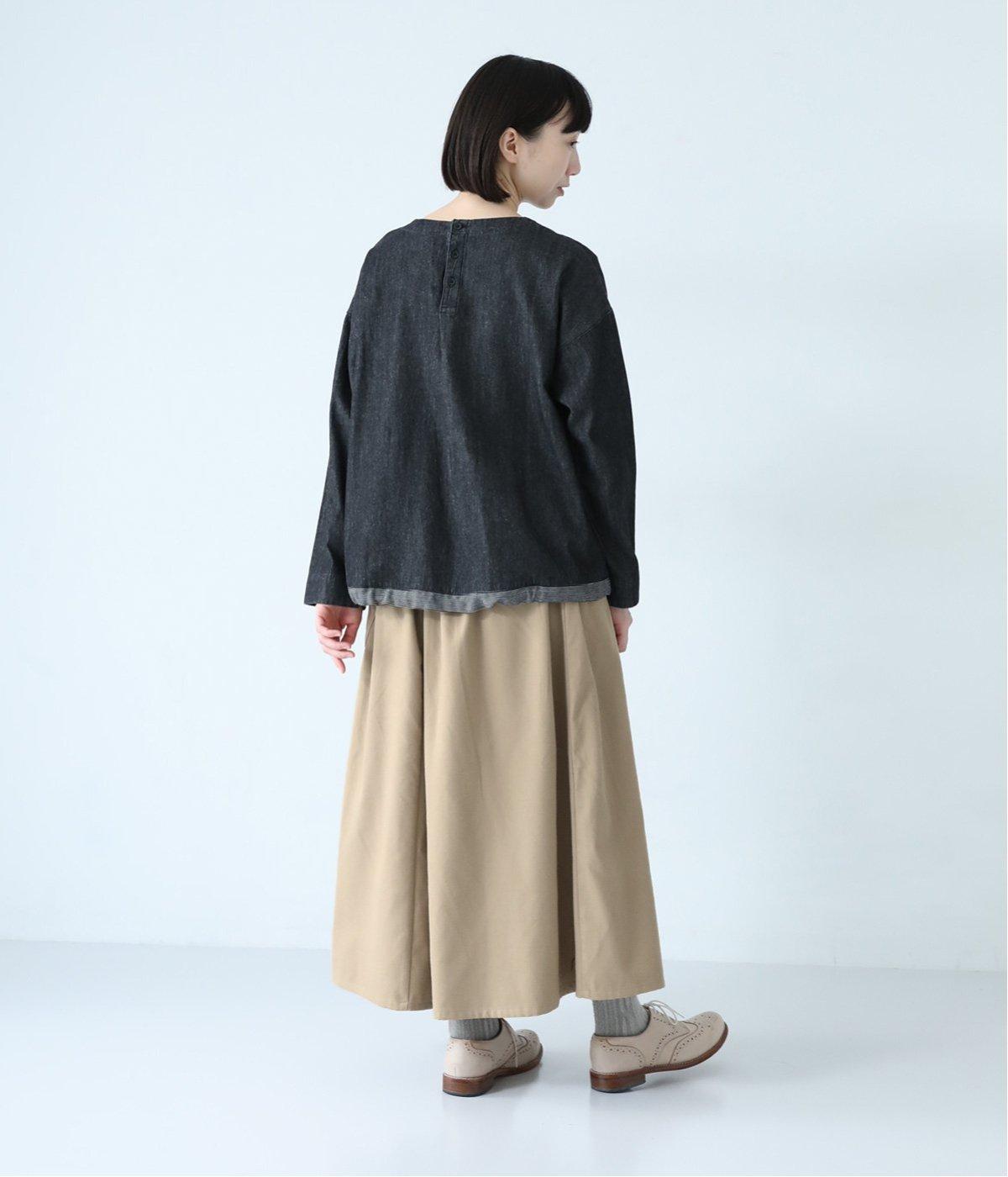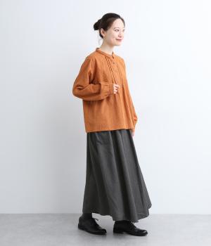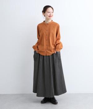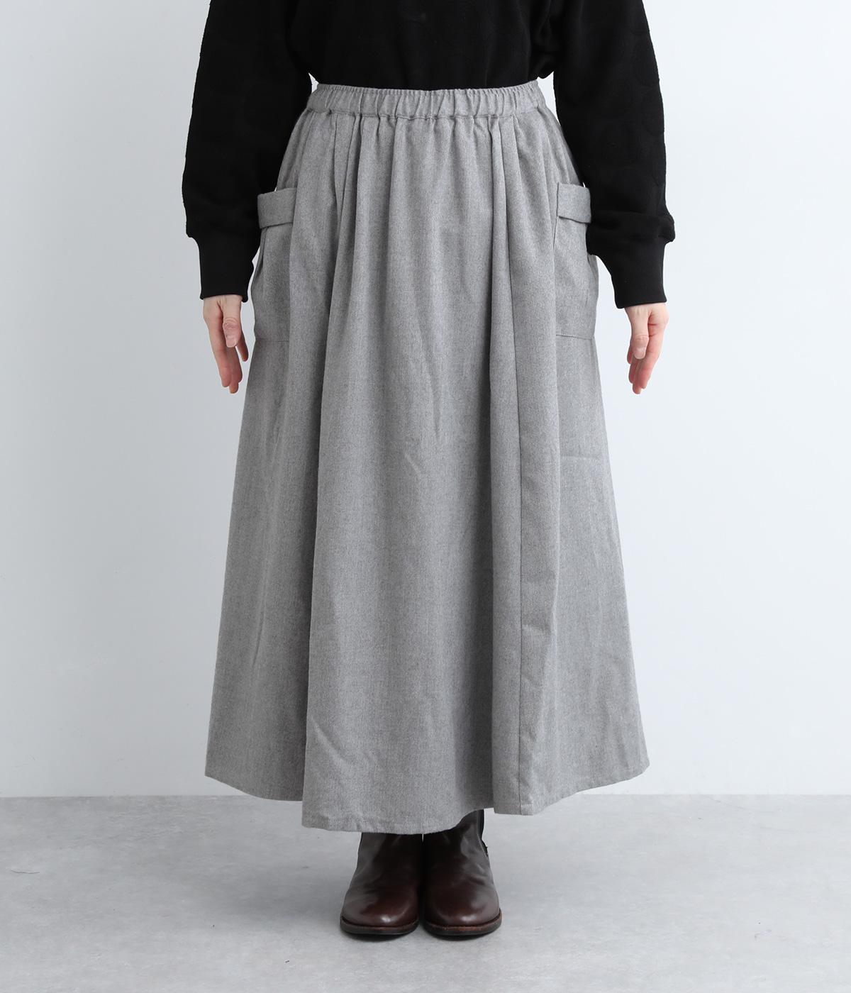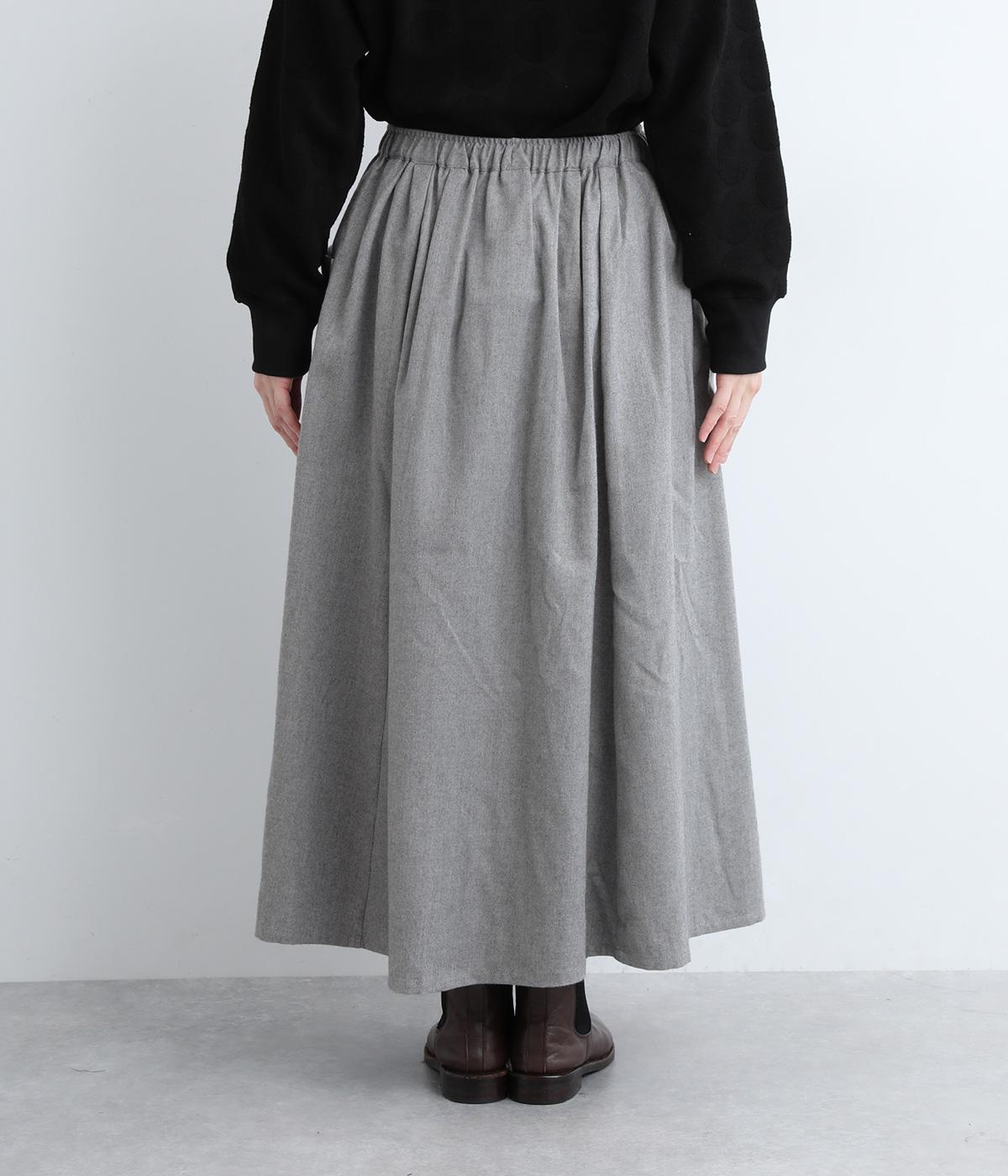 ウエストにタックを入れてボリューミーに仕上げたフレアスカート。両脇に立体的なポケットをつけてアクセントにしています。総ゴム仕様のウエストにはフィット感を高める紐をプラス。イージーな着用感ときれい見えを両方叶えてくれるアイテムです。