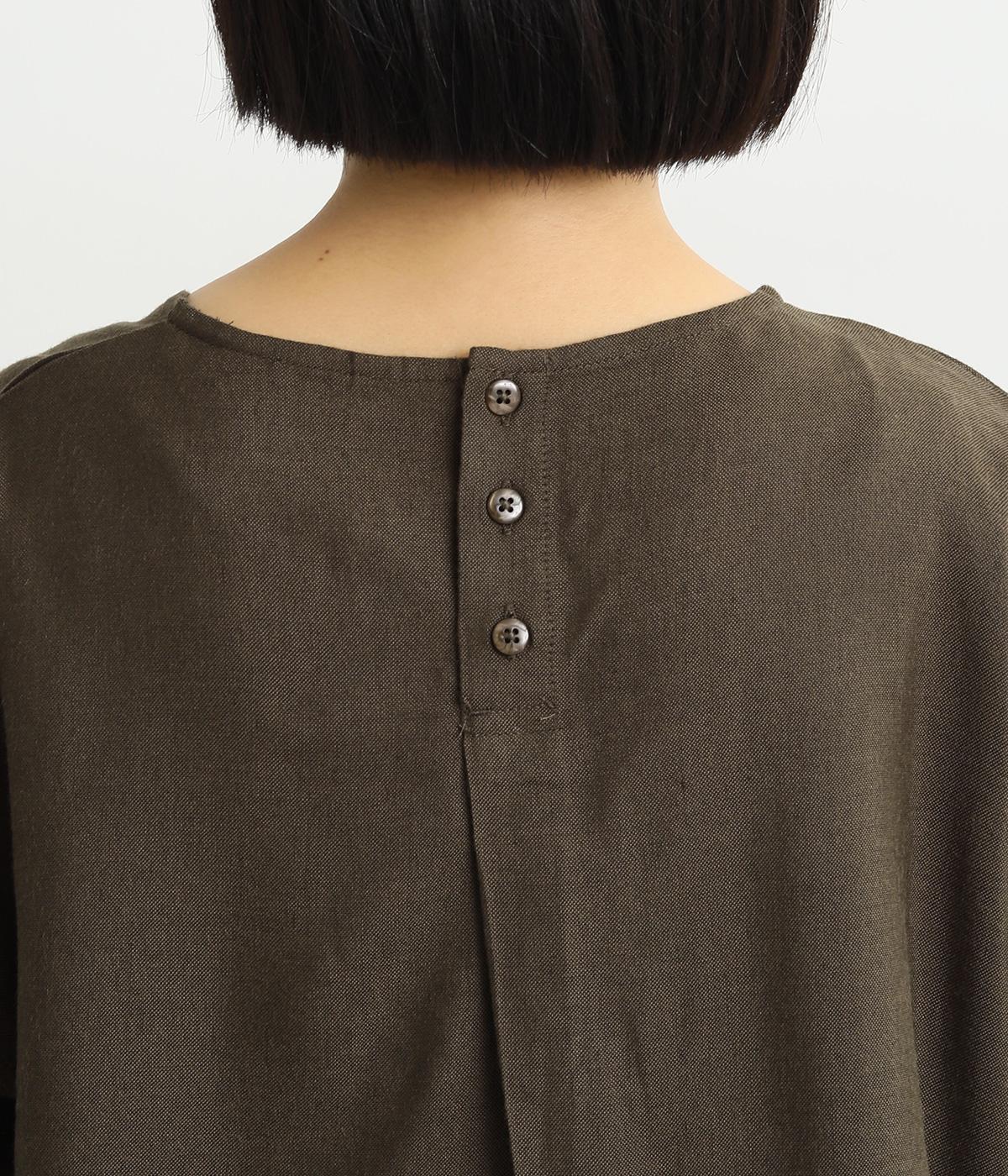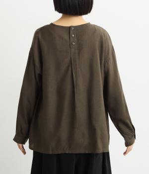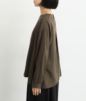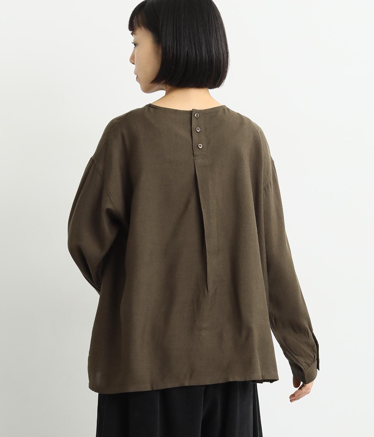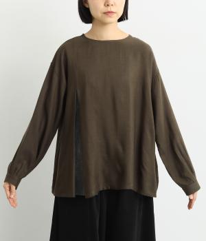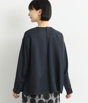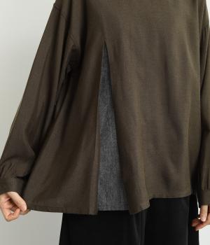 スリットからシャツがのぞいたような、レイヤード風デザインが特徴的なブラウス。すっきりとしたノーカラーに、締めつけ感のないフレアシルエットで着こなしやすく仕上がっています。後ろボタンが着脱をアシスト。