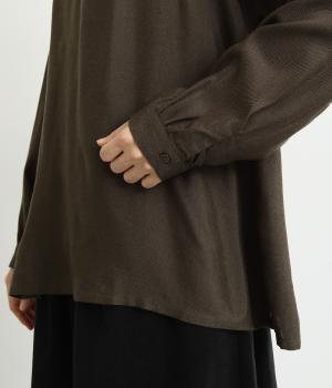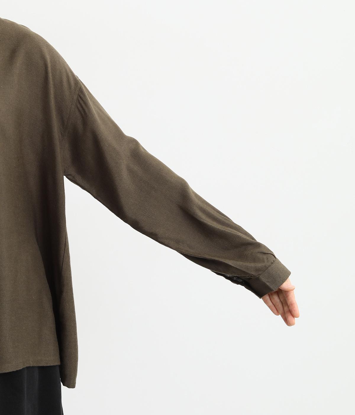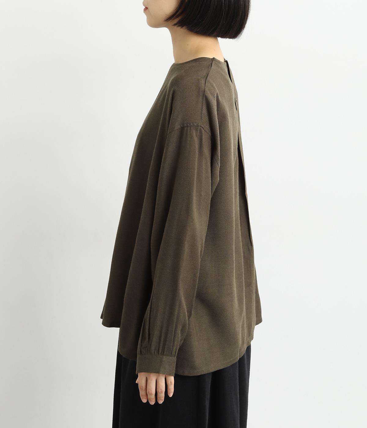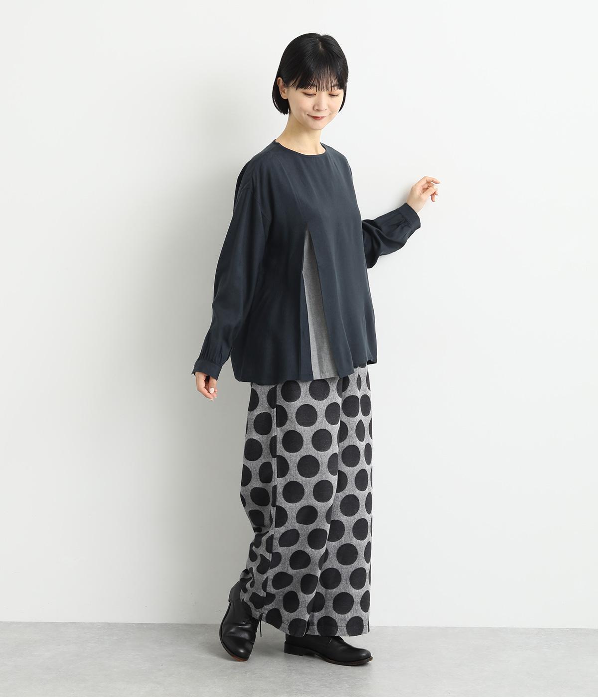スリットからシャツがのぞいたような、レイヤード風デザインが特徴的なブラウス。すっきりとしたノーカラーに、締めつけ感のないフレアシルエットで着こなしやすく仕上がっています。後ろボタンが着脱をアシスト。