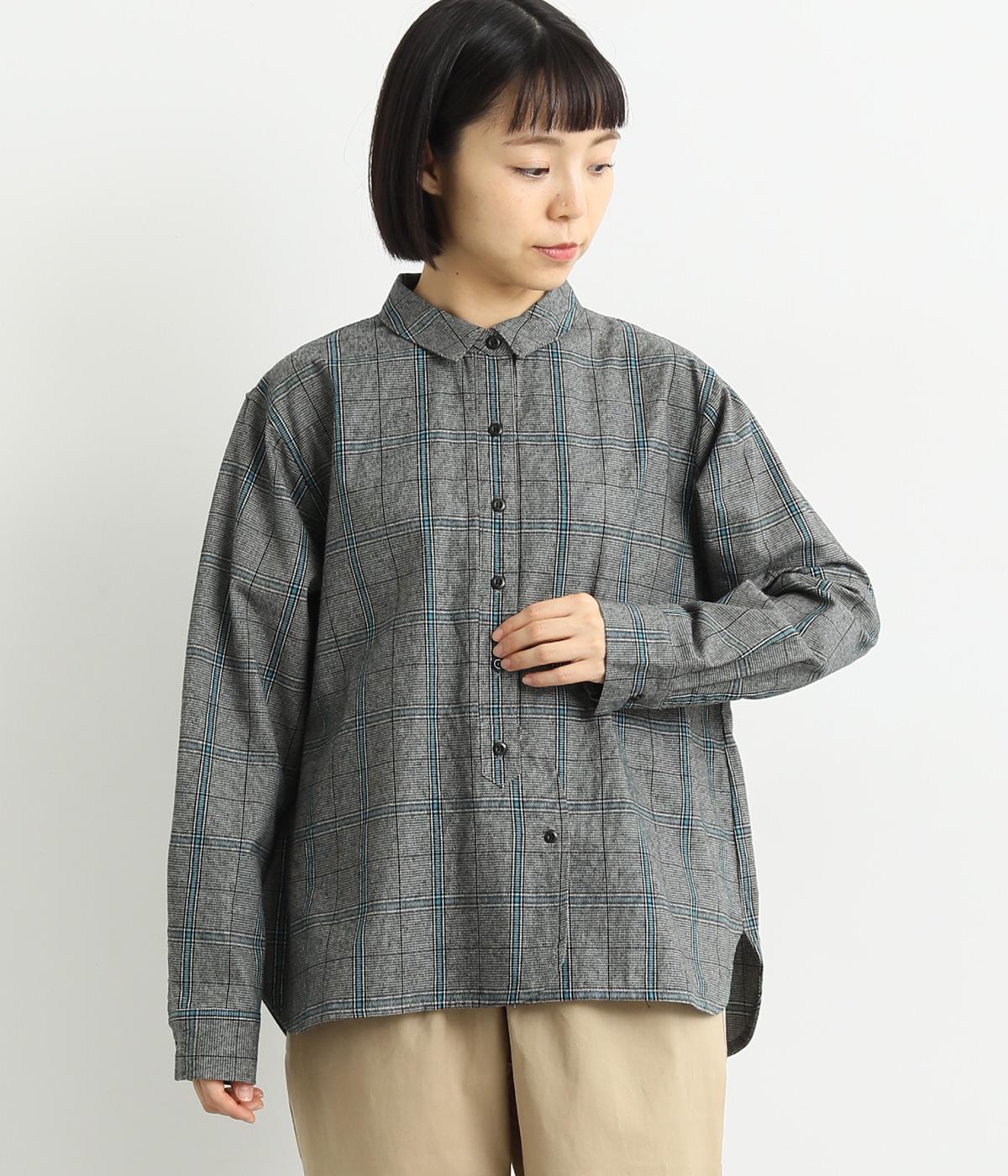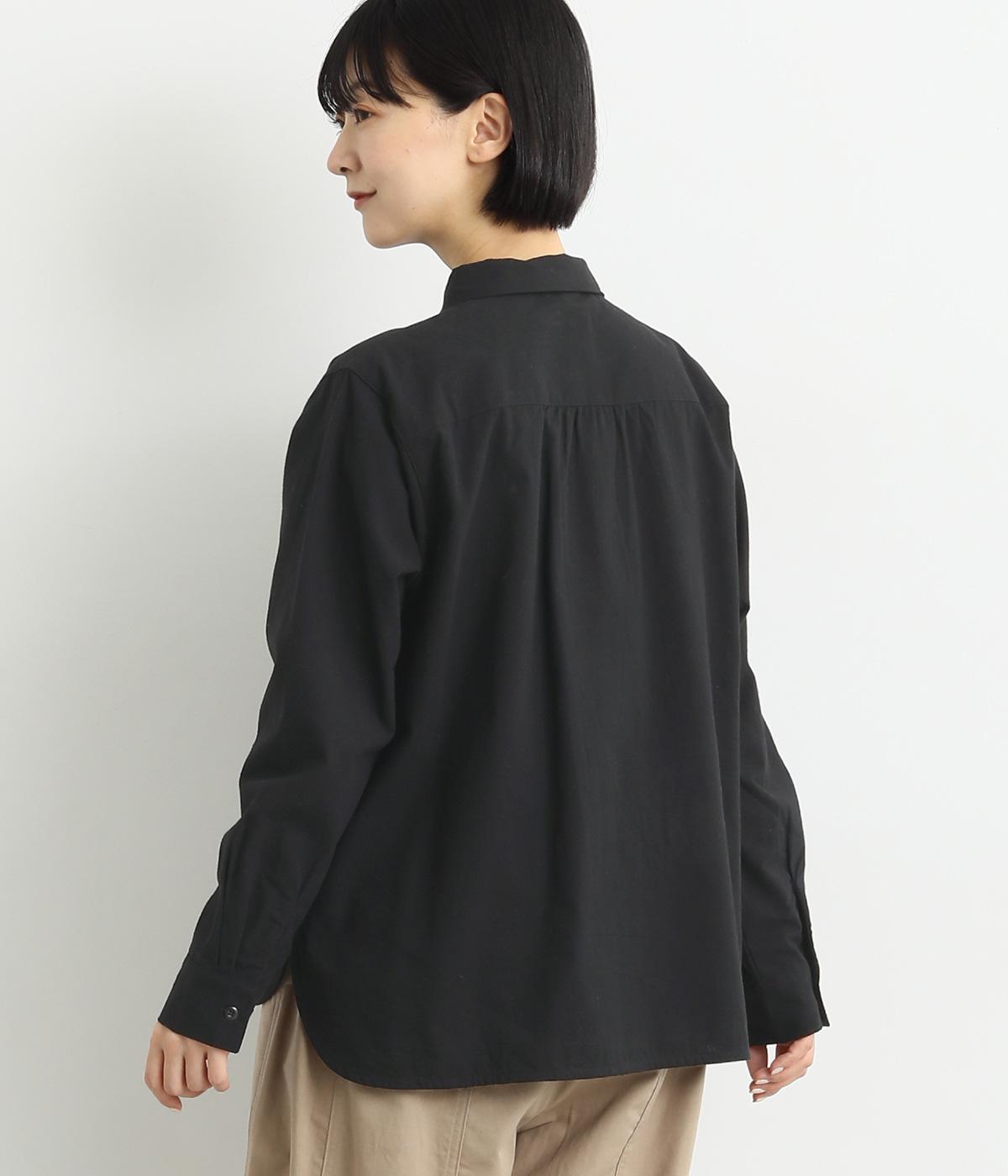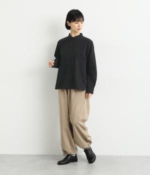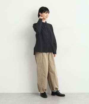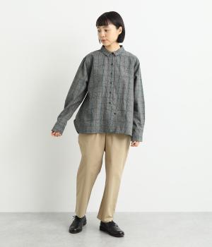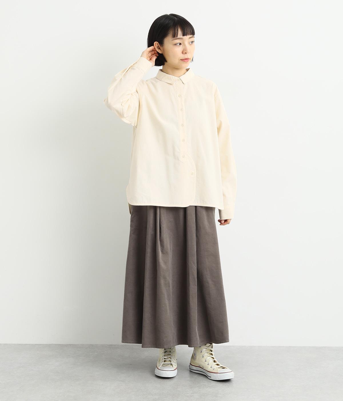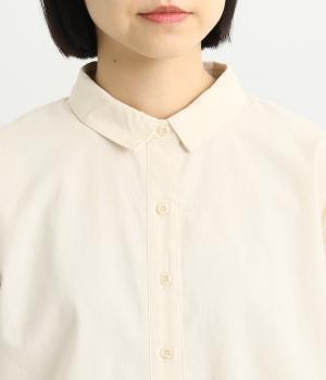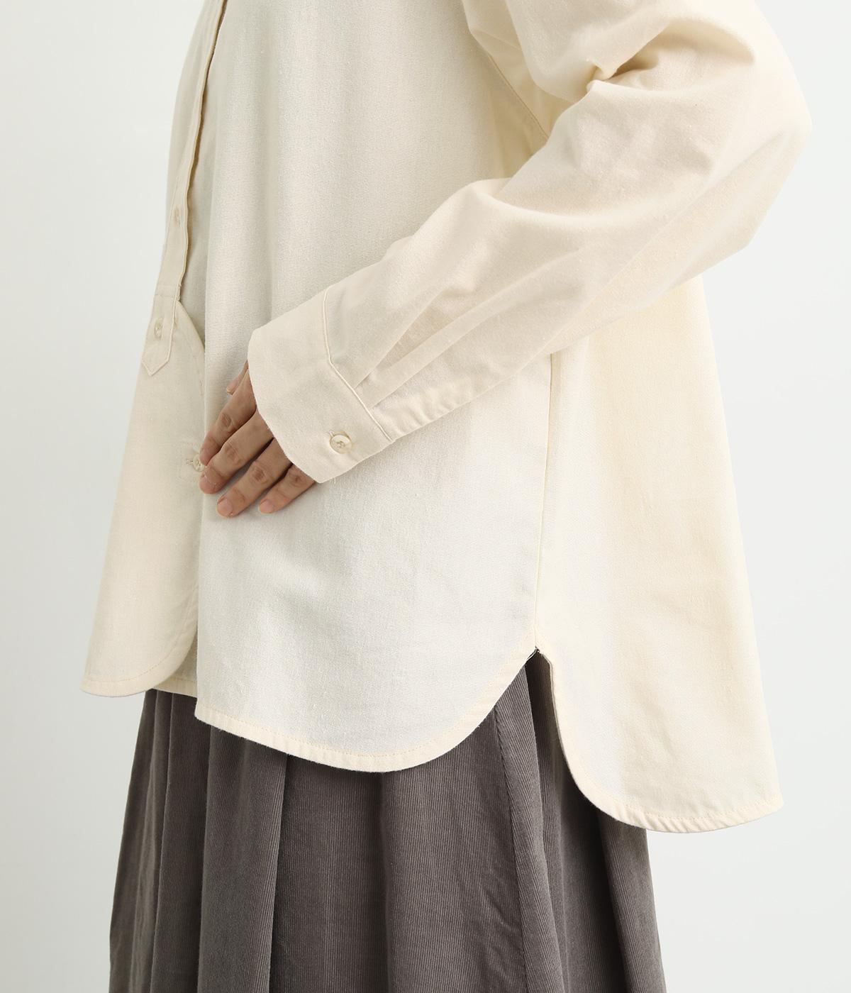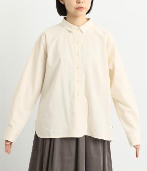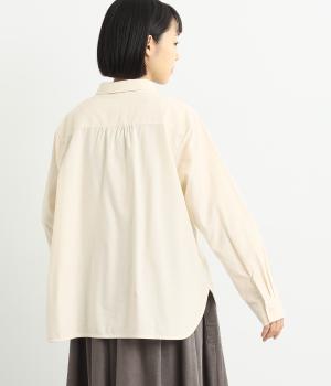 ヘムラインに向かってラウンドした前立てのデザインがユニークなブラウス。襟つきできちんと感は残しつつ、サイドのラインもまるみを帯びて、全体的にやさしい印象に仕上がっています。後ろは切り替えにギャザーを入れてゆとりをプラス。
