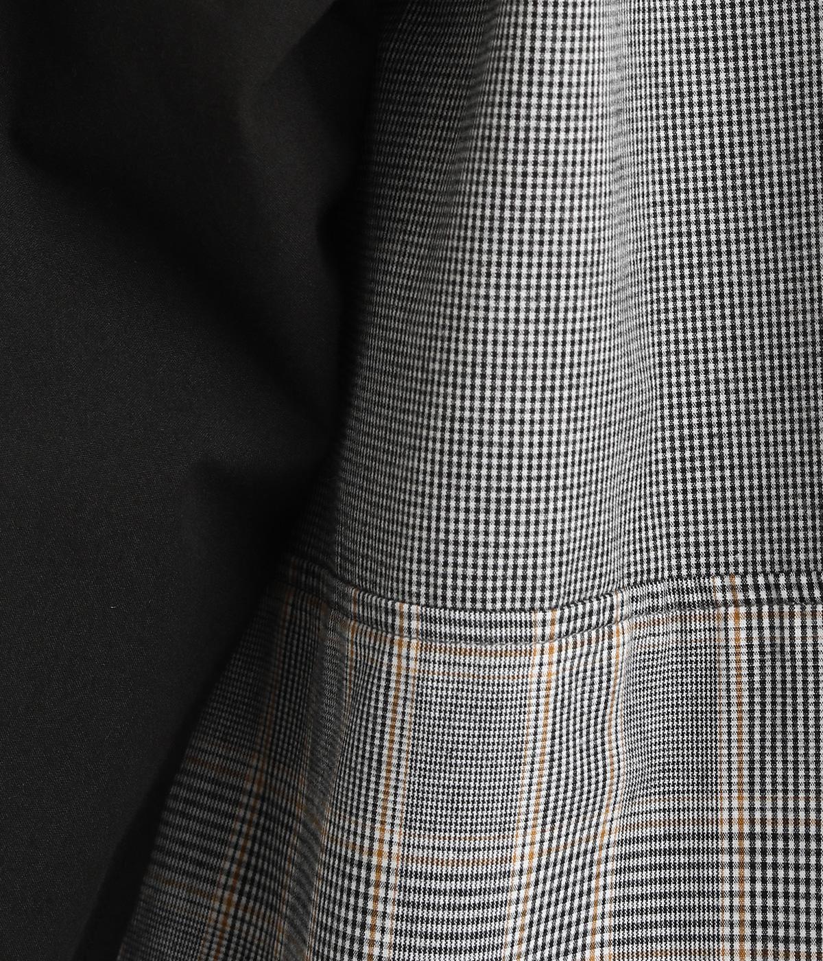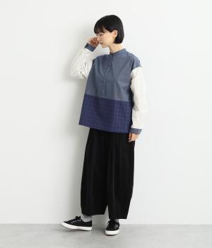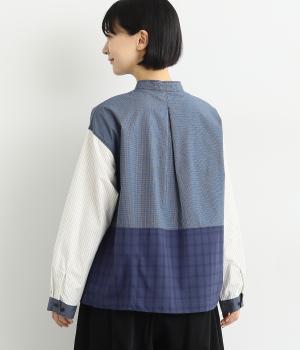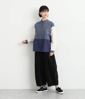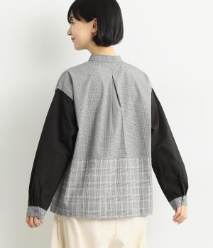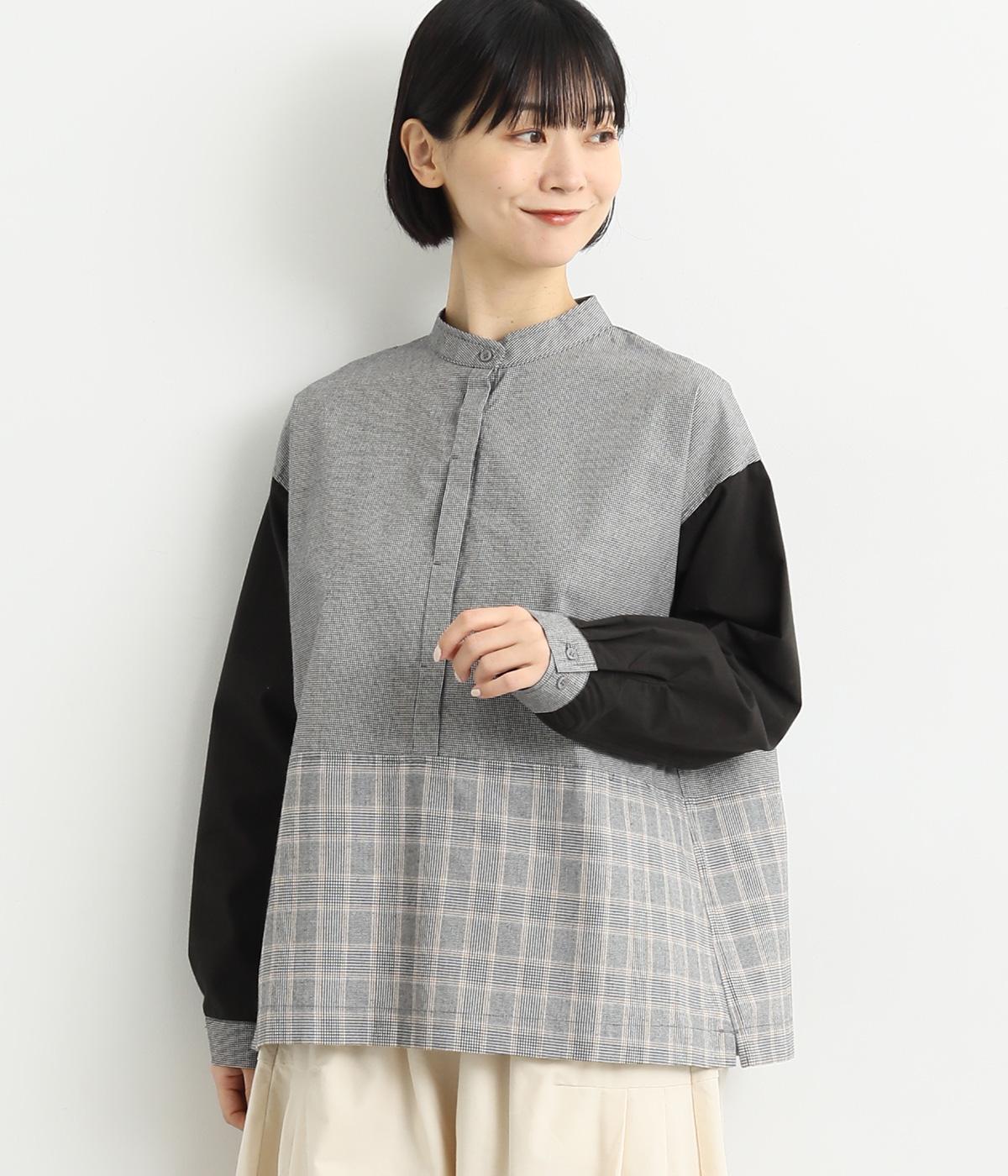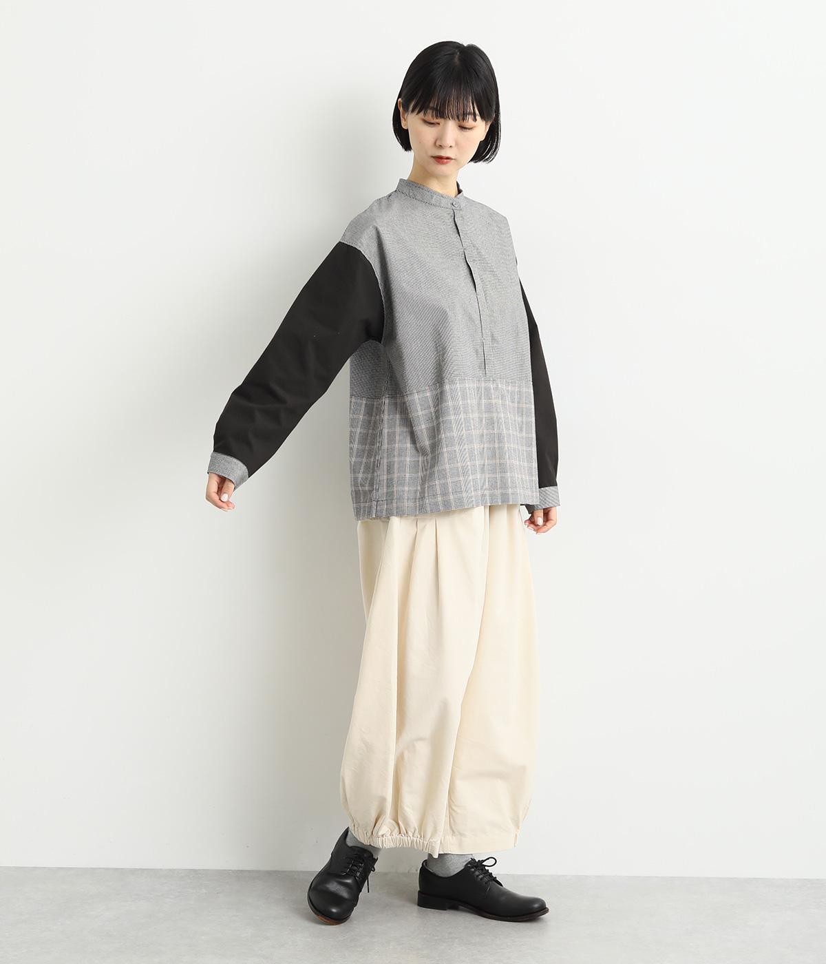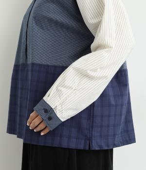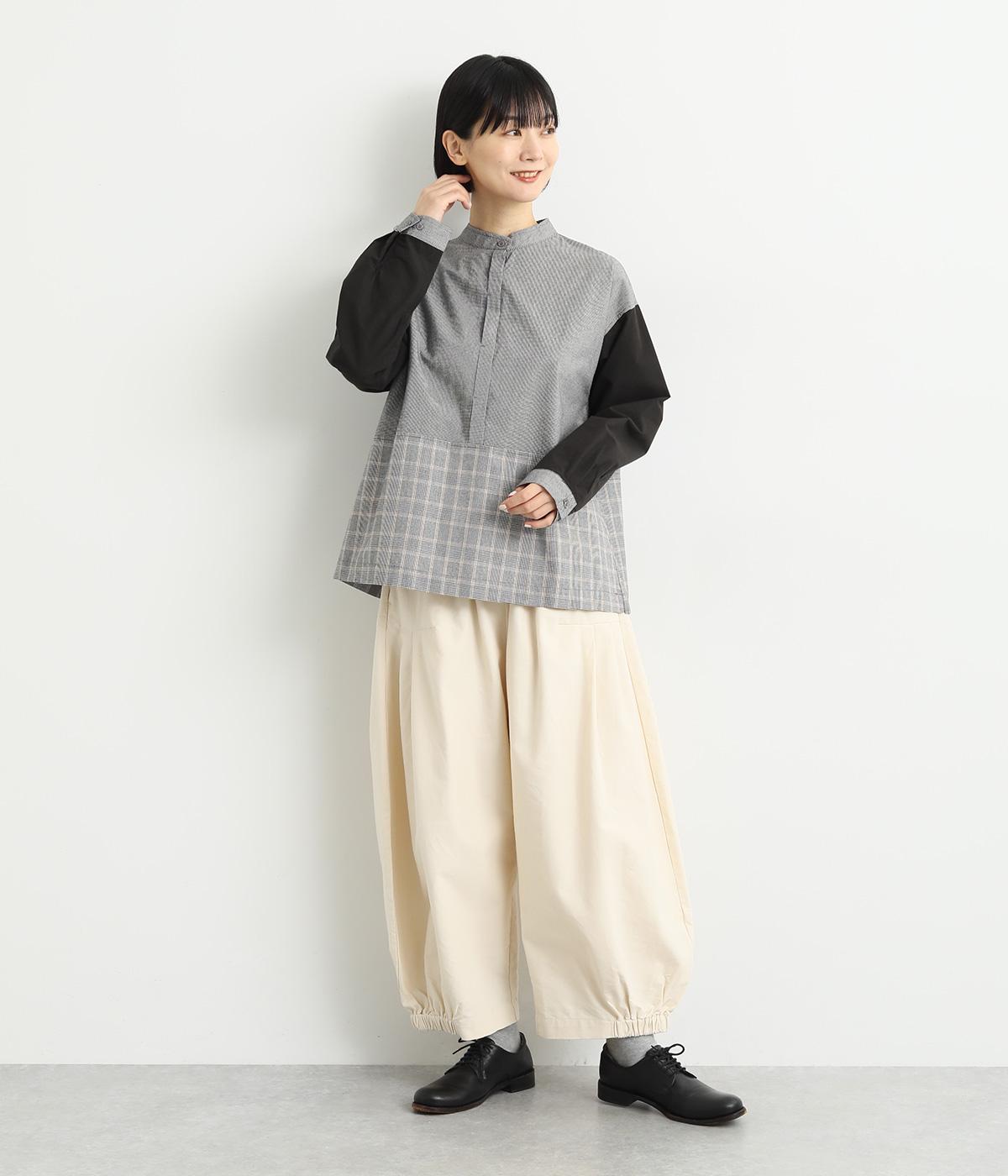 3種の生地使いがデザイン性のあるブラウス。ウエスト高めの位置で切り替えているので全体的にすっきりとした印象です。後ろはタックを入れたゆとりのあるサイズ感に。シンプルな合わせでもお洒落に決まる、存在感のある一枚です。