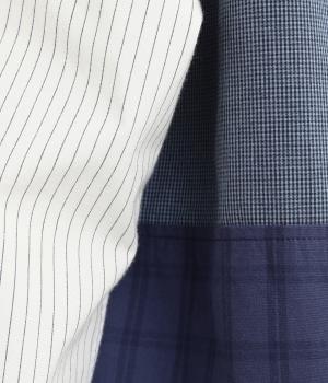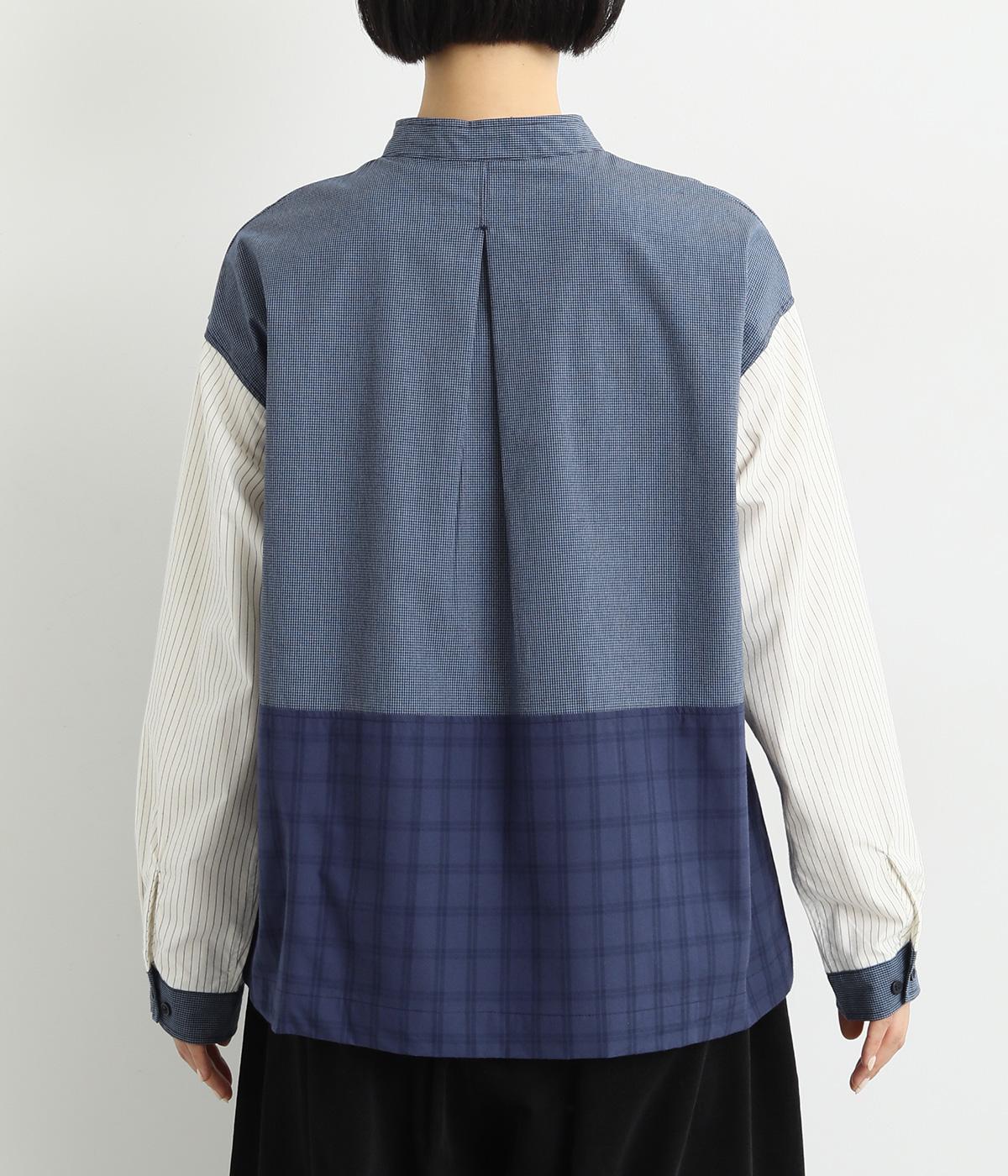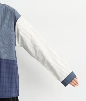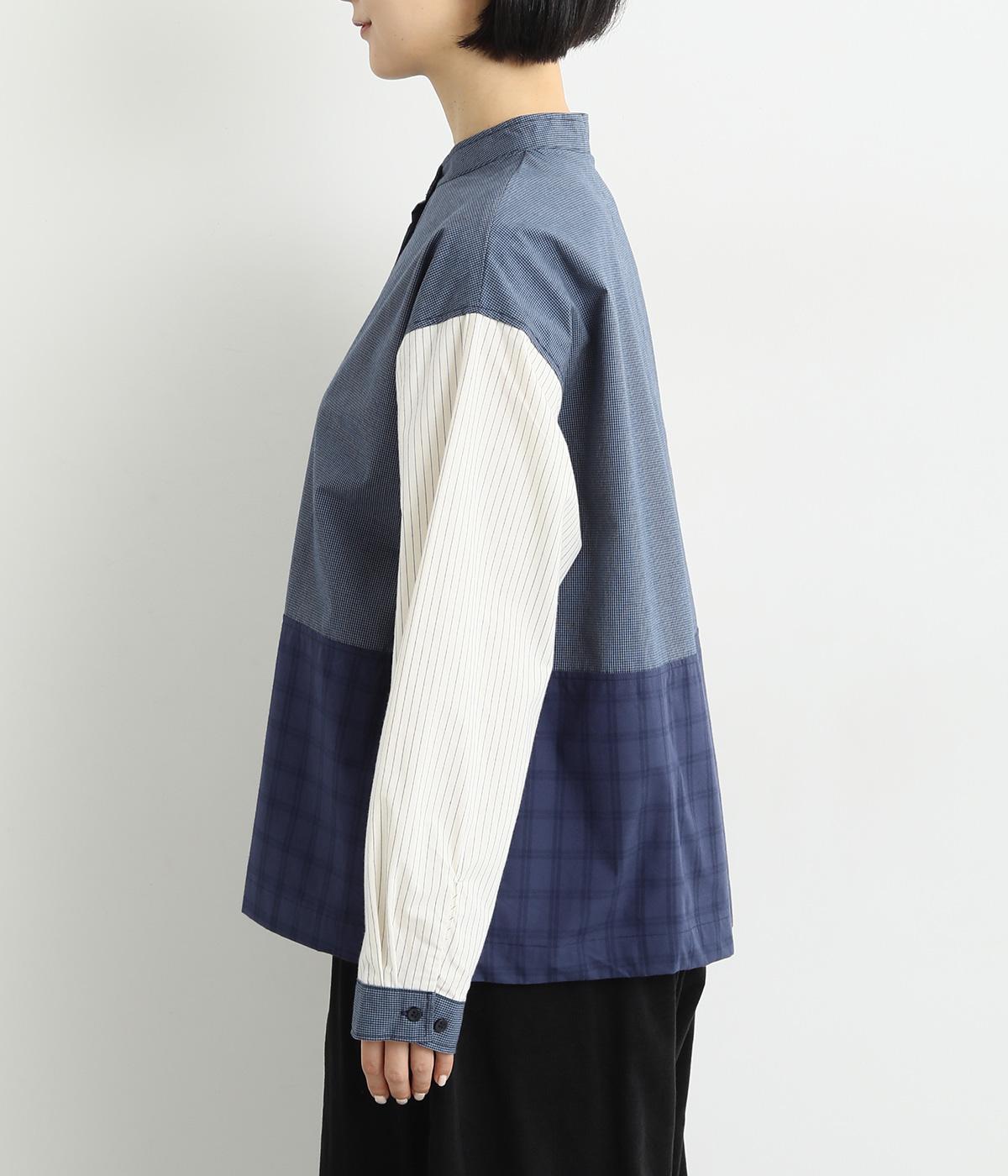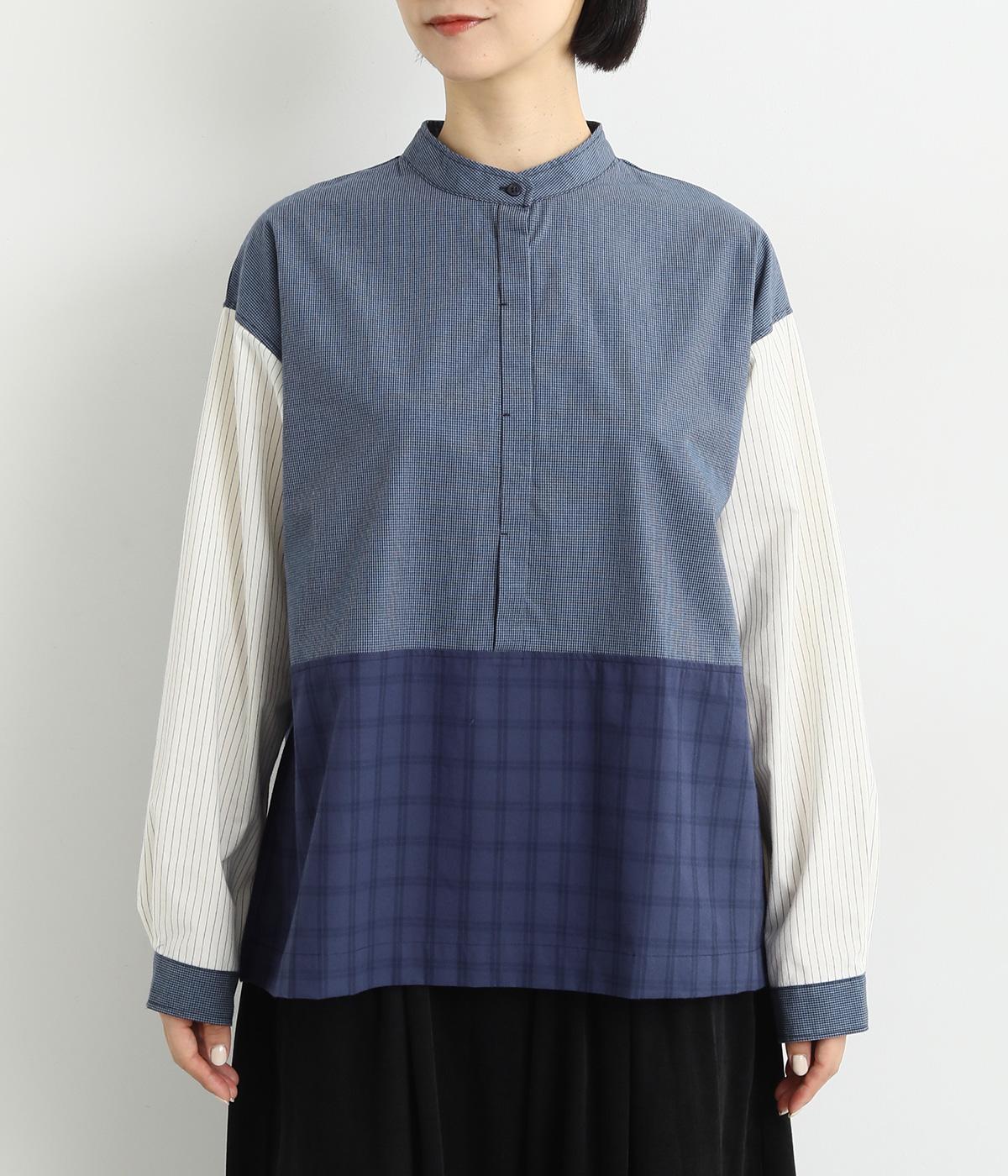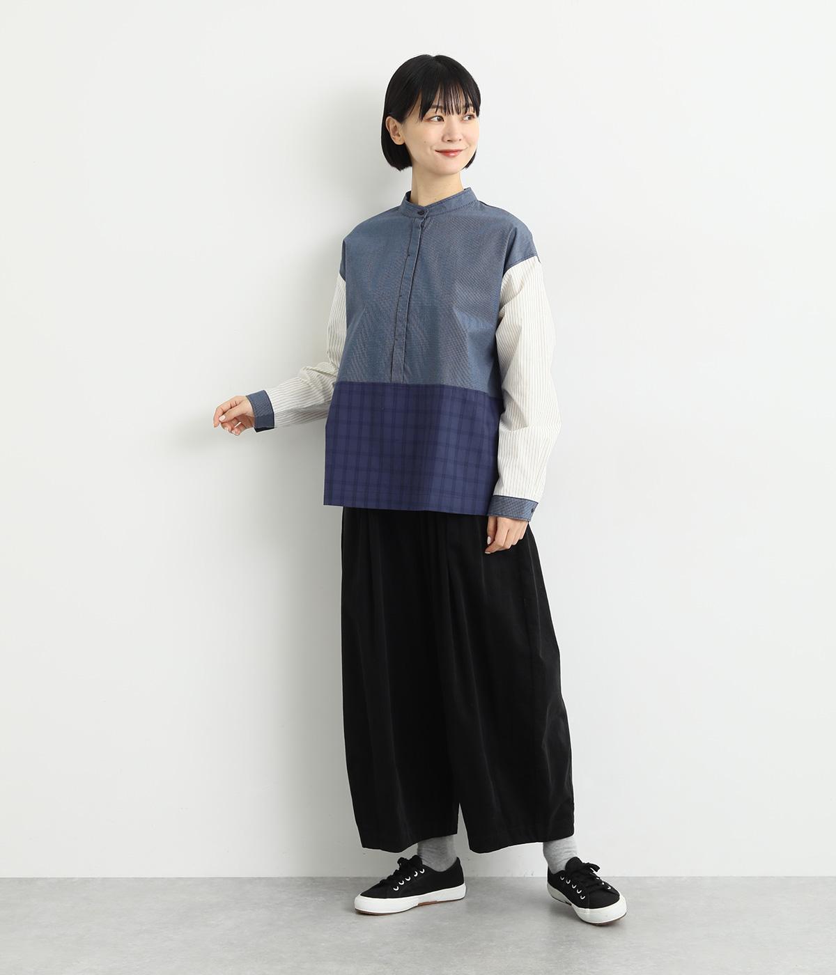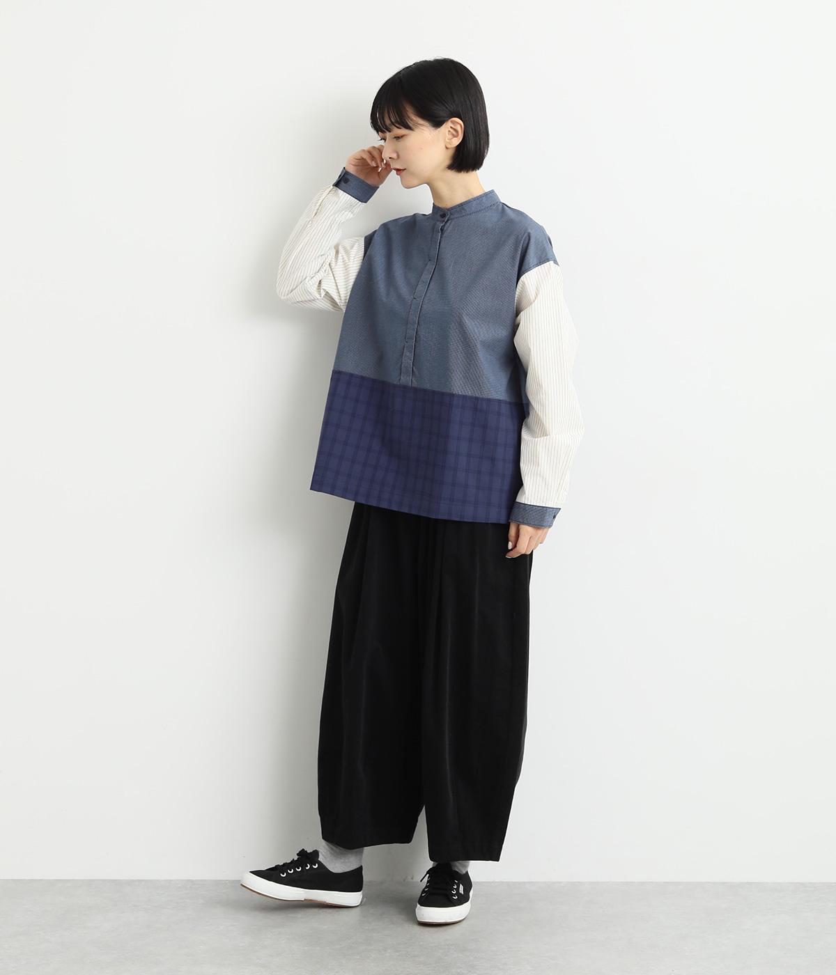 3種類を組み合わせた生地使いが特徴的な一枚。すべてコットン生地で揃えているので、表情豊かながらもまとまりがあります。ほんのりとした起毛感であたたかみのある仕上がりに。
