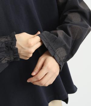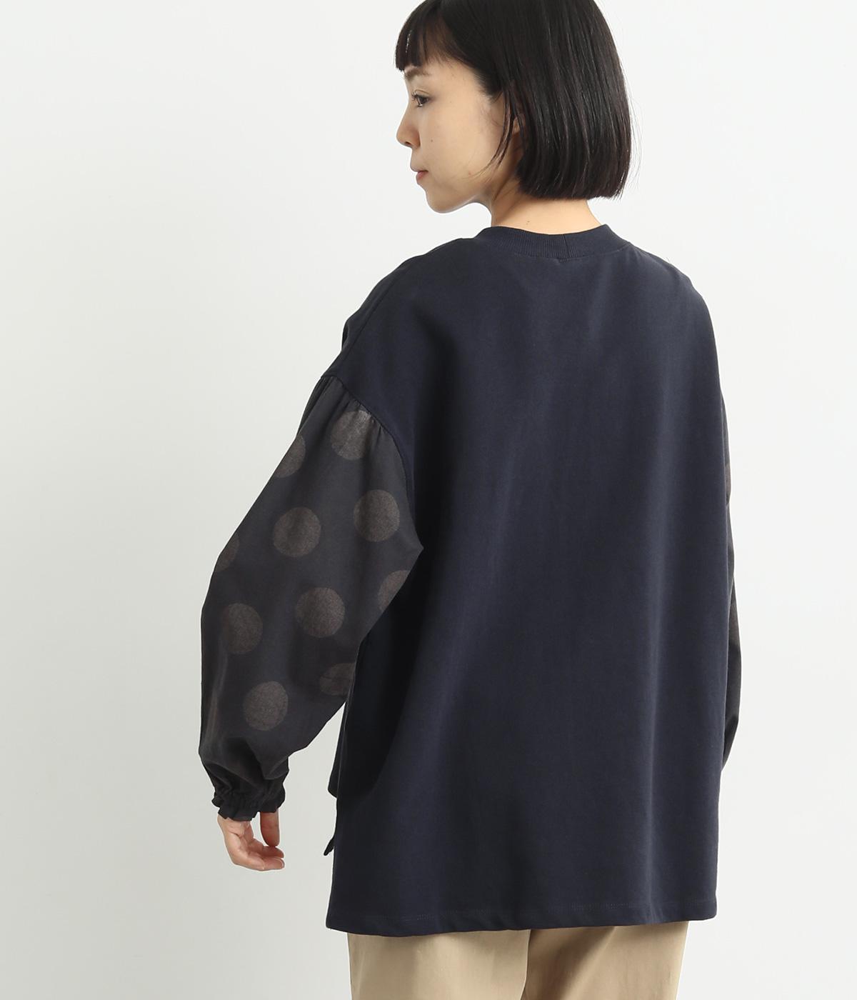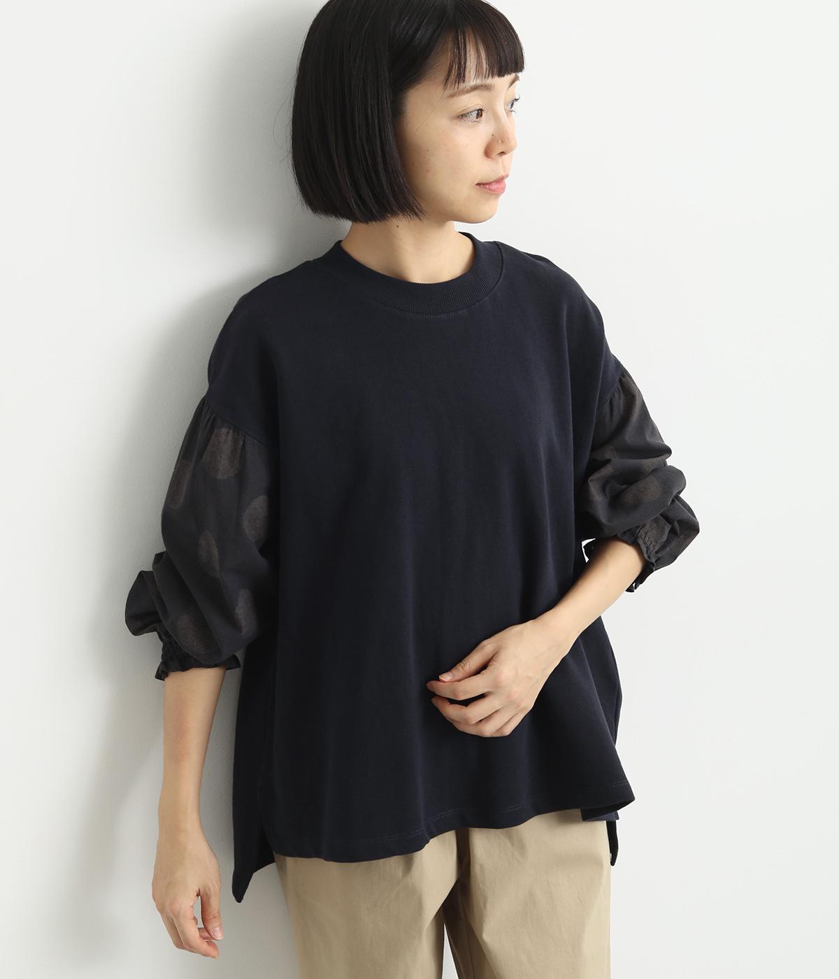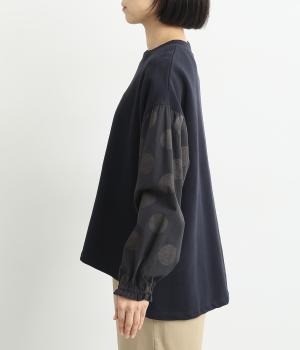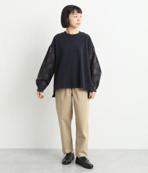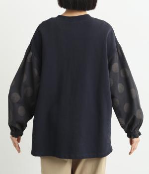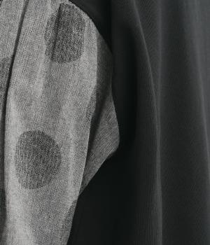 ソフトで肌あたりのいいコットンの裏毛生地と、さらりとしたドットの異素材を組み合わせました。伸びのいい裏毛をベースにしているので着心地も快適です。