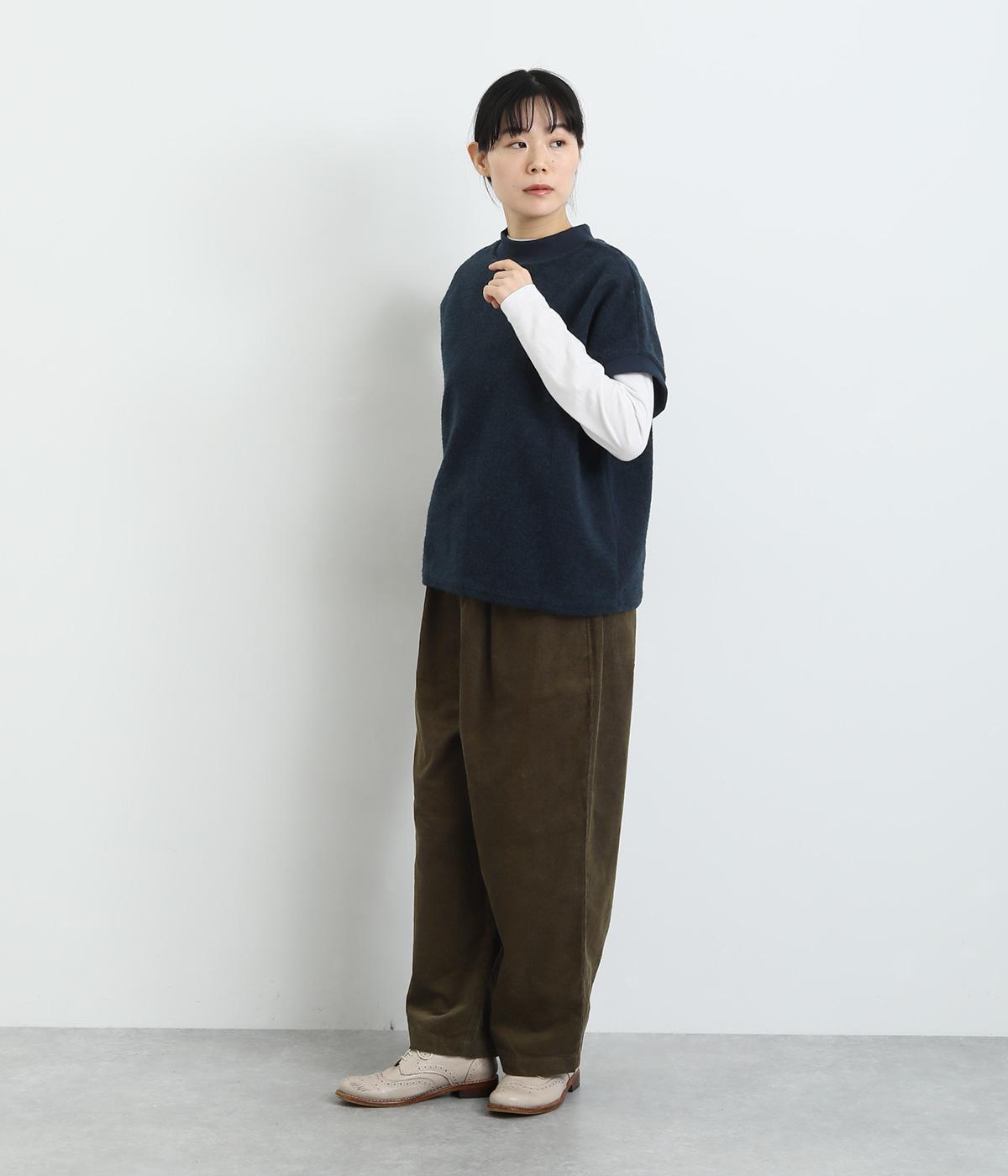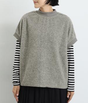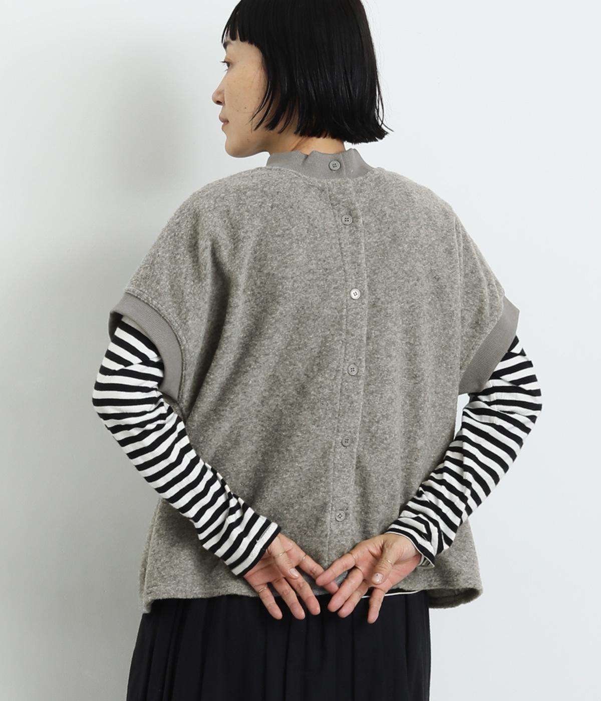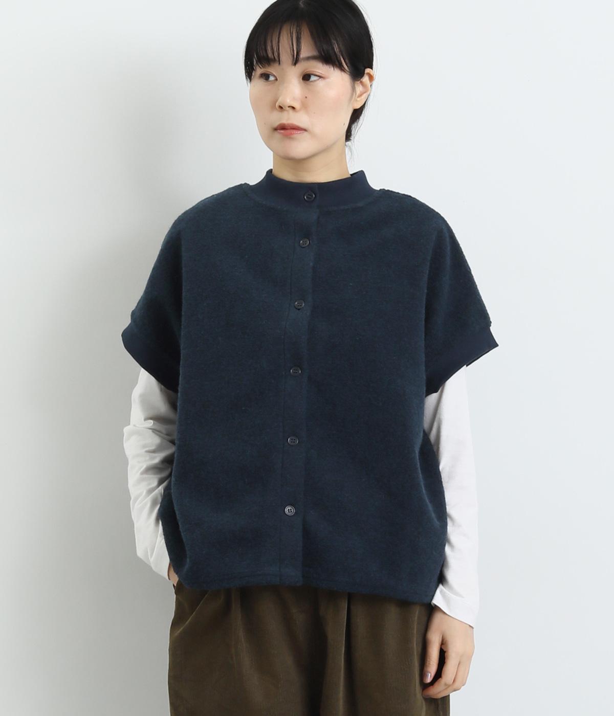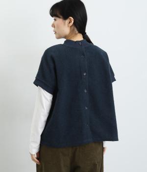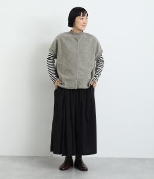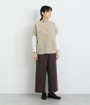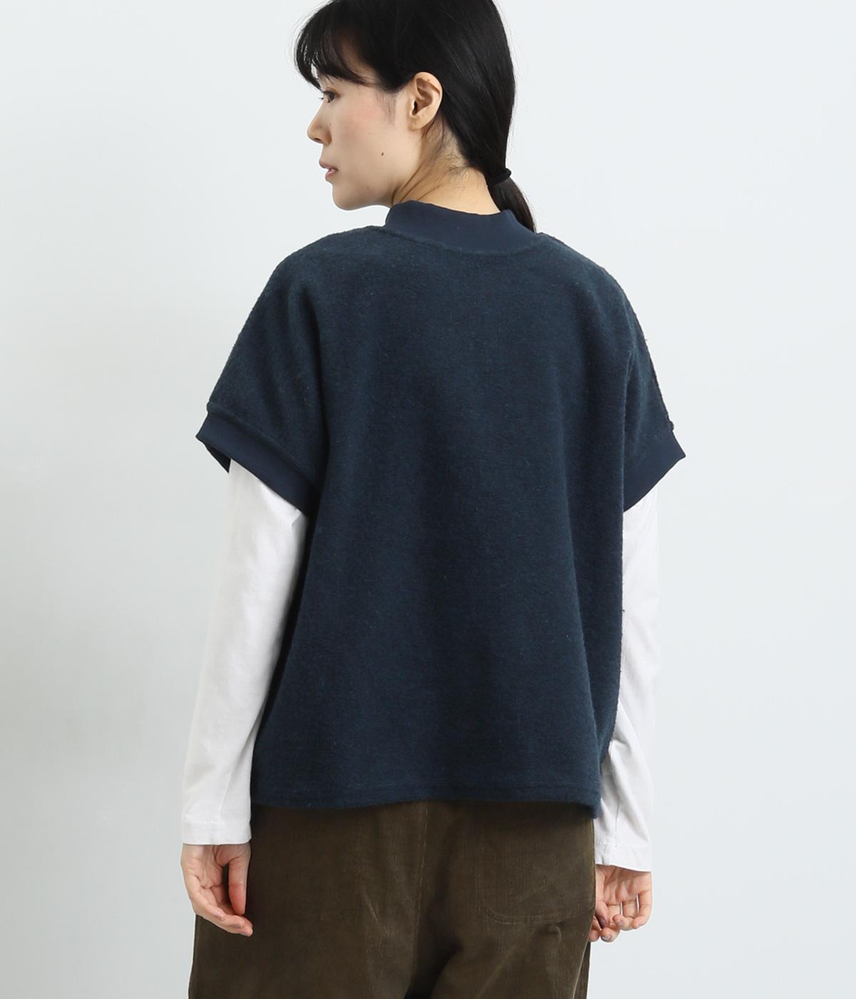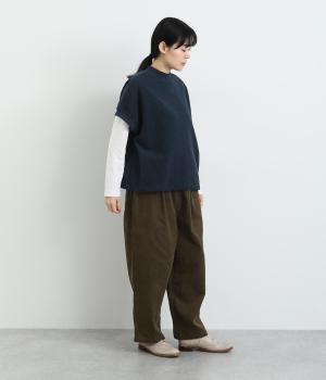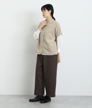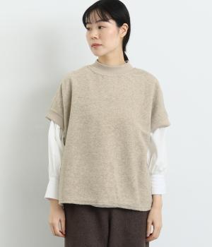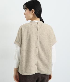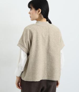 ゆったりとしたボックスシルエットに襟ぐりと袖口のリブ使いが特徴的なニットソーベスト。羽織りにも後ろあきにもなる前後2wayで着こなしの幅も広がります。いつものスタイリングに季節感と新鮮味を与えてくれる一枚です。